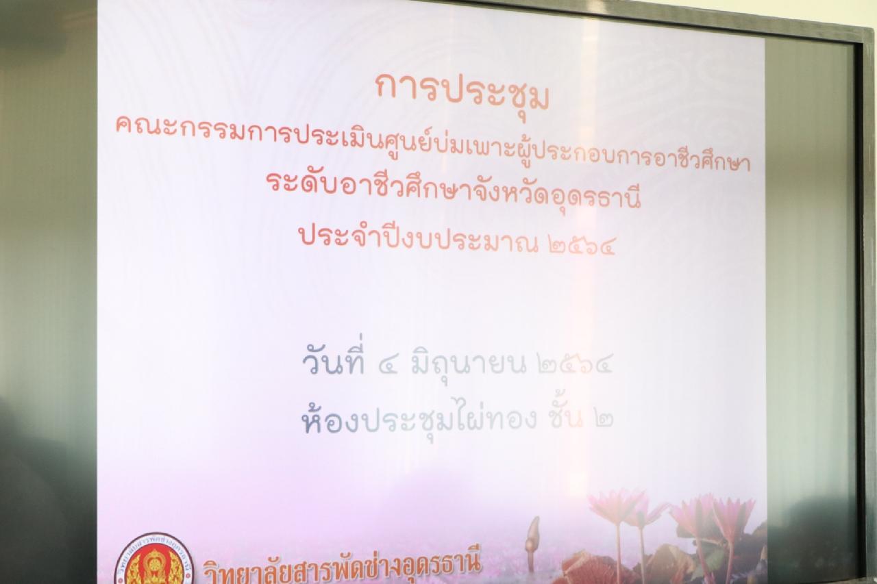 นายอาทิตย์ จิรวัฒนผล ผู้อำนวยการวิทยาลัยสารพัดช่างอุดรธานี และตัวแทนสถานศึกษาในอาชีวศึกษา จำนวน 9 สถานศึกษา ร่วมประชุมคณะกรรมการประเมินศูนย์บ่มเพาะผู้ประกอบการอาชีวศึกษา ระดับอาชีวศึกษาจังหวัดอุดรธานี ประจำปีงบประมาณ 2564 ในวันที่ 4 มิถุนายน 2564 ณ ห้องประชุมไผ่ทอง ชั้น 2 วิทยาลัยสารพัดช่างอุดรธานี