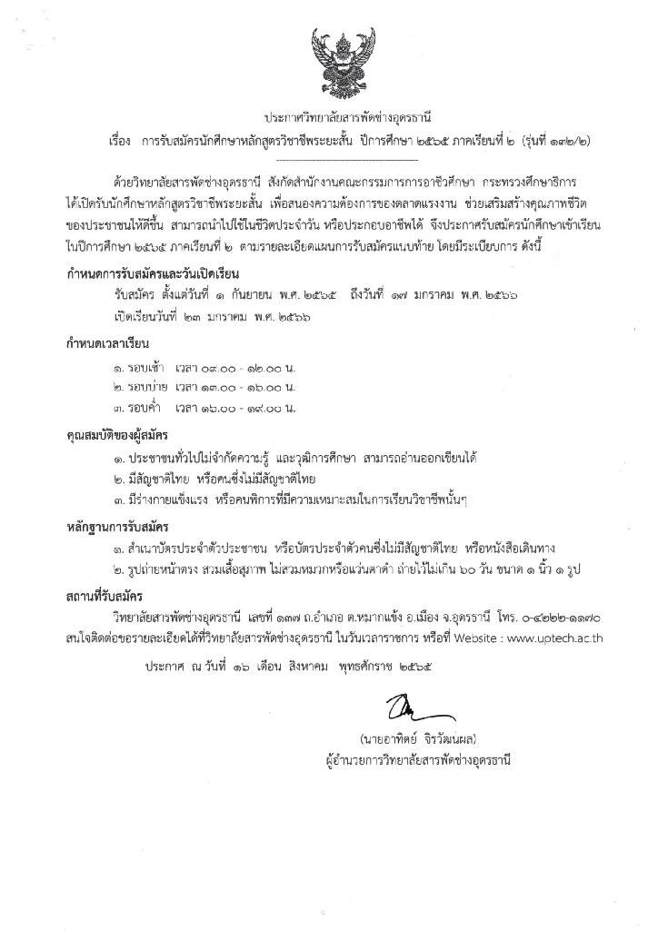 วิทยาลัยสารพัดช่างอุดรธานีรับสมัครนักศึกษาหลักสูตรวิชาชีพระยะสั้น รุ่นที่ 132/2 ภาคเรียนที่ 2 ปีการศึกษา 2565
