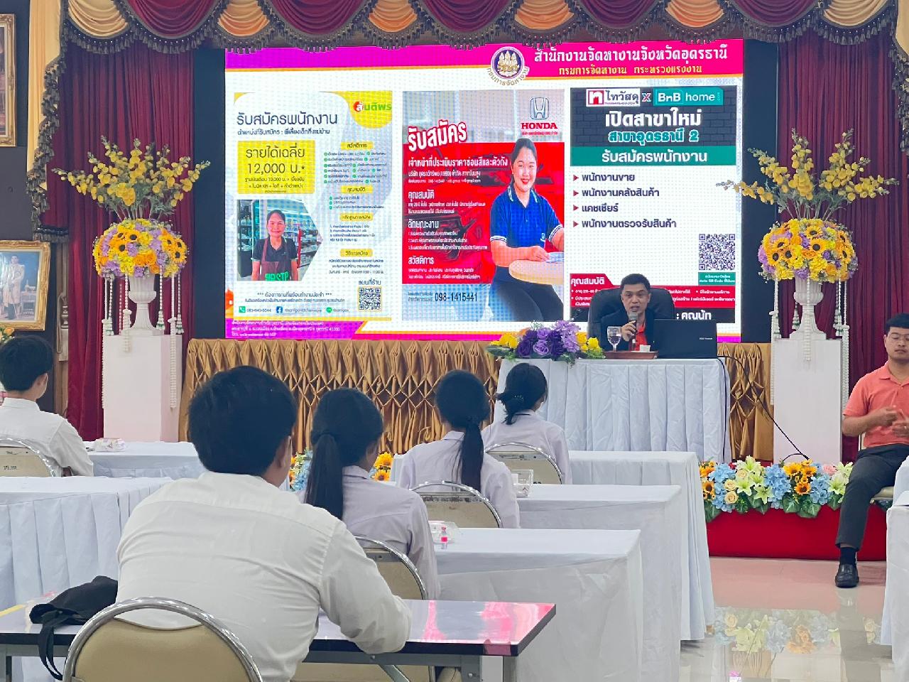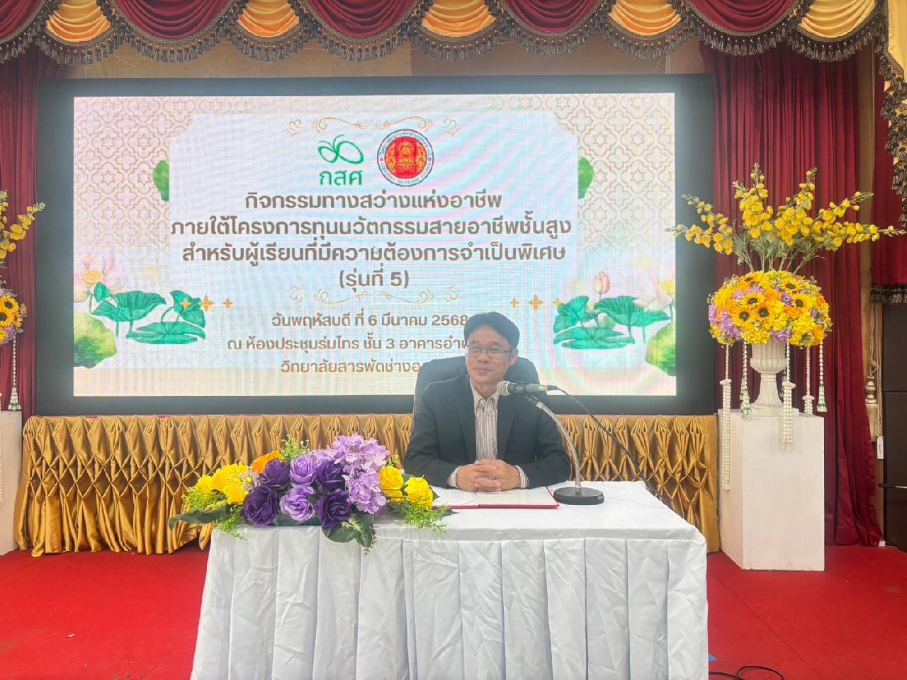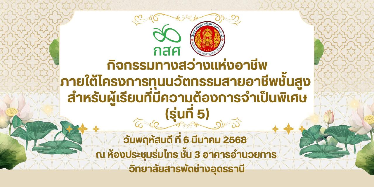 วันพฤหัสบดี ที่ 6 มีนาคม 2568 นายไพฑูรย์ ธนพงศ์ภากร ผู้อำนวยการวิทยาลัยสารพัดช่างอุดรธานี พร้อมด้วย คณะครู, บุคลากรทางการศึกษา และนักศึกษา เข้าร่วมกิจกรรมทางสว่างแห่งอาชีพ ภายใต้โครงการทุนนวัตกรรมสายอาชีพชั้นสูง สำหรับผู้เรียนที่มีความต้องการจำเป็นเป็นพิเศษ (รุ่นที่5) ณ ห้องประชุมร่มไทร ชั้น 3 อาคารอำนวยการ วิทยาลัยสารพัดช่างอุดรธานี