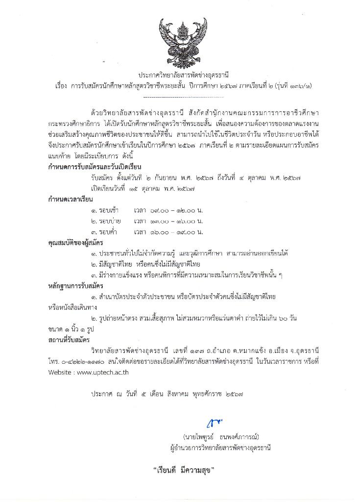 รับสมัครนักศึกษาหลักสูตรวิชาชีพระยะสั้น รุ่นที่ 136/1 (วันที่ 6 เดือน สิงหาคม พ.ศ. 2567)