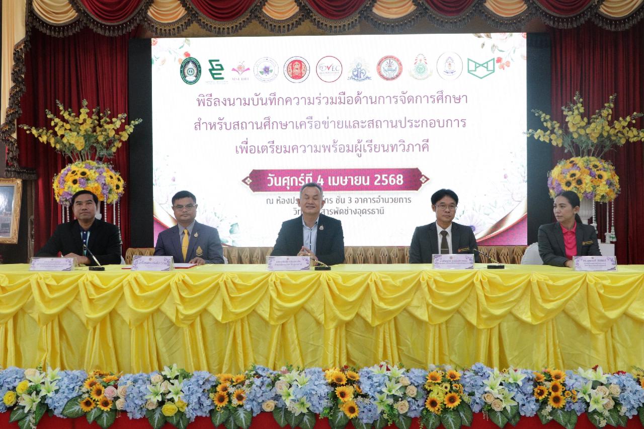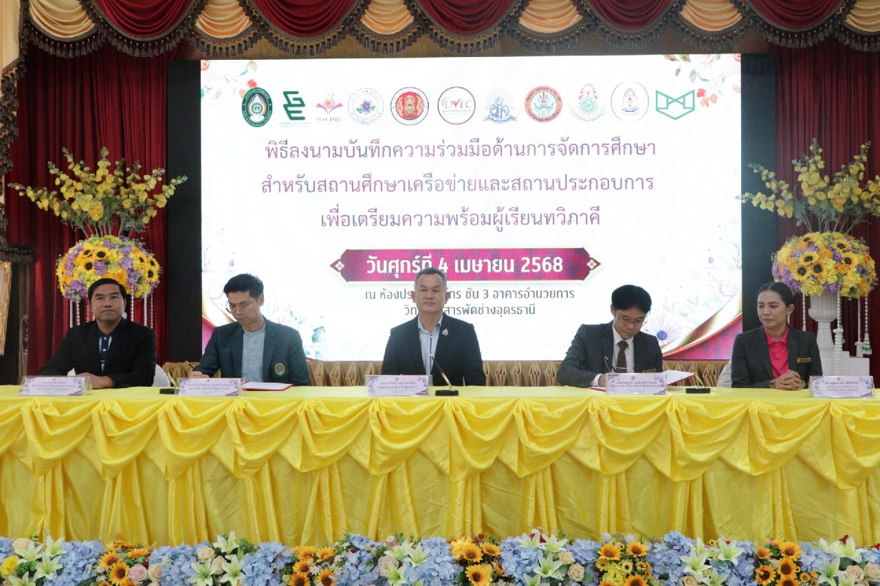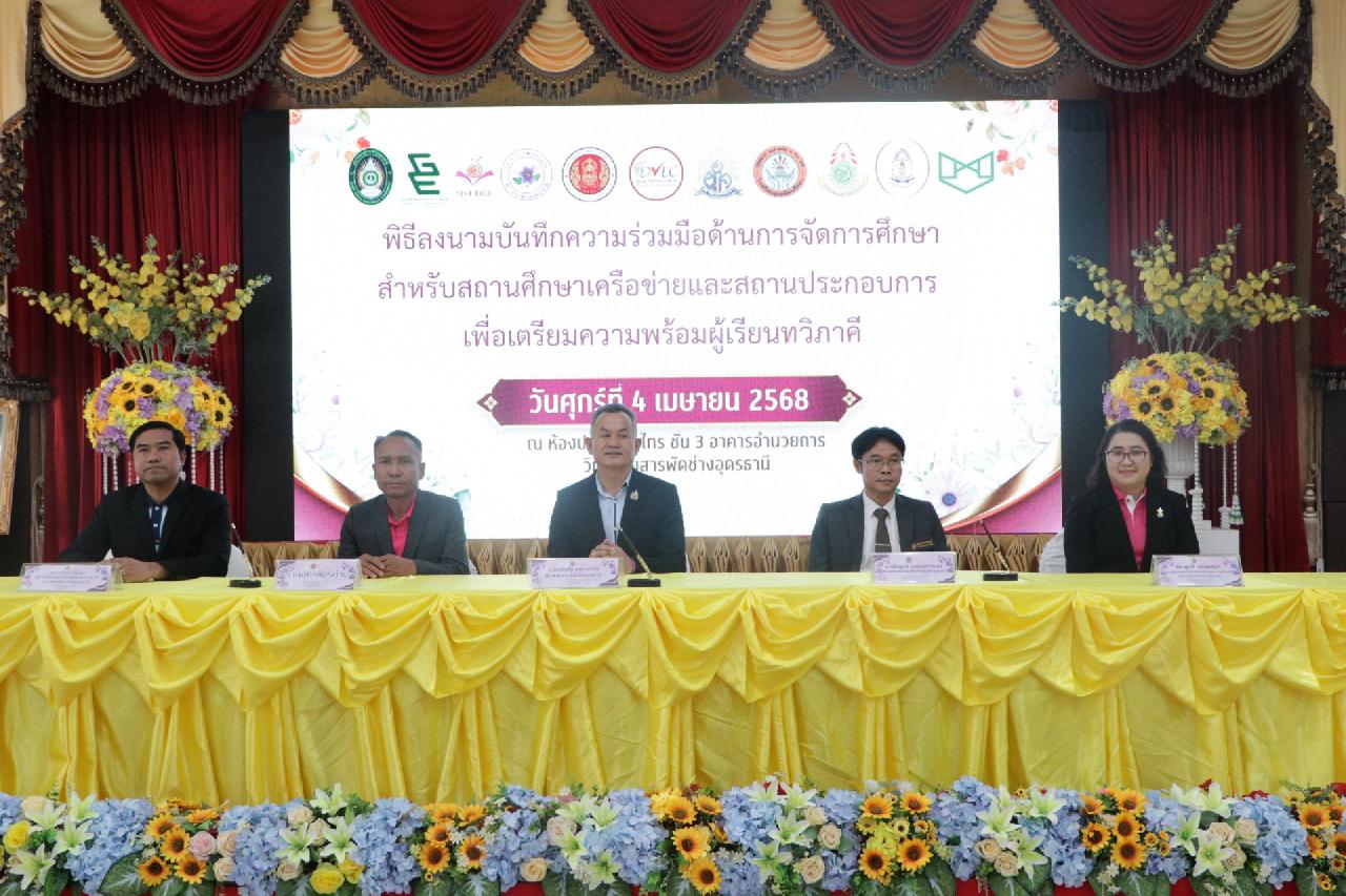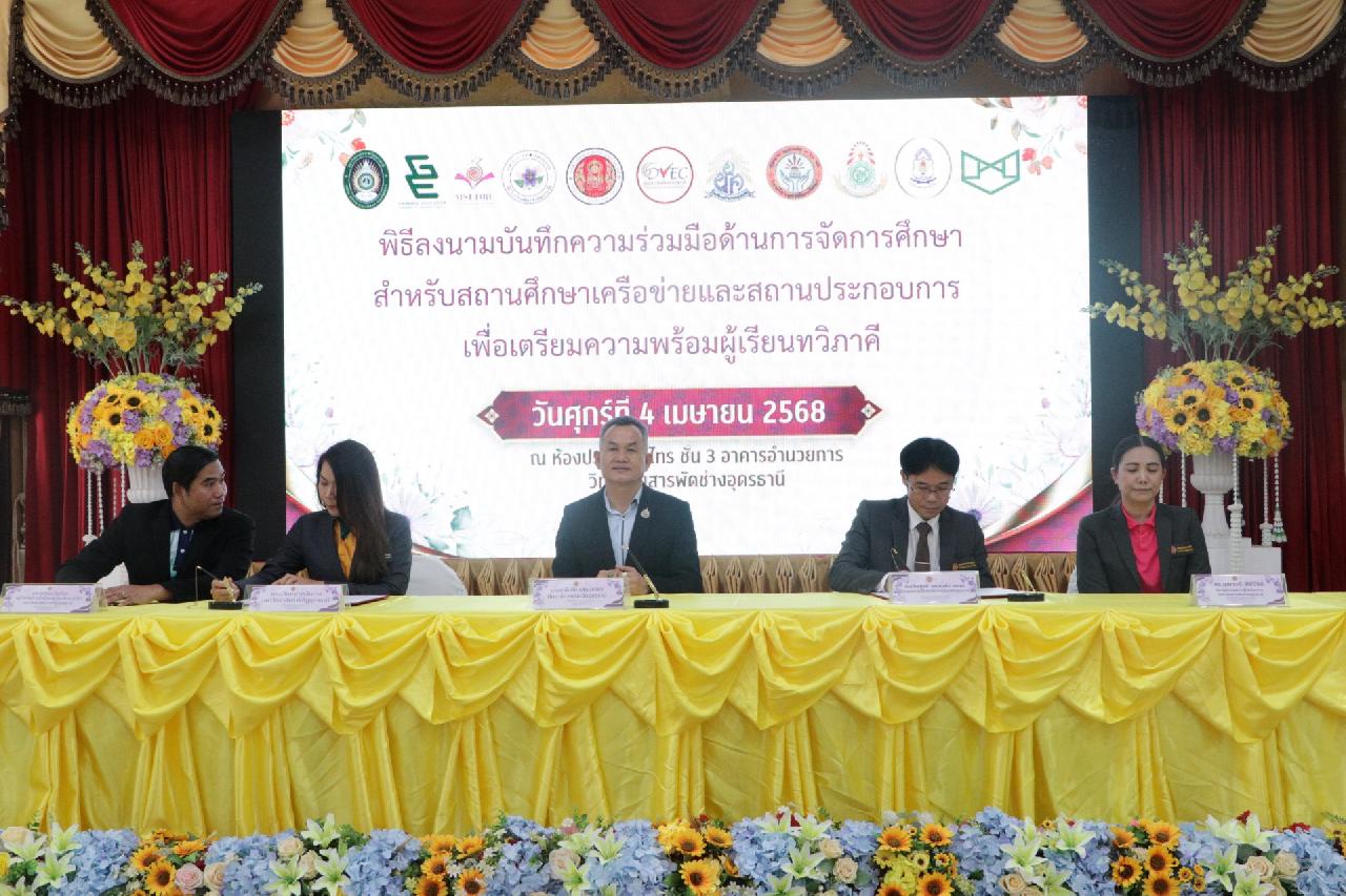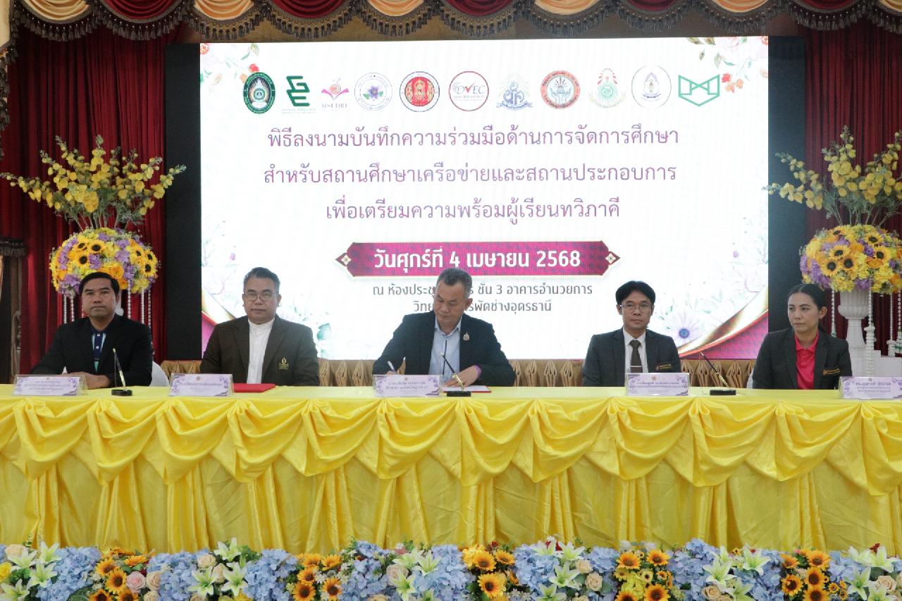 วันศุกร์ ที่ 4 เมษายน 2568 นายไพฑูรย์ ธนพงศ์ภากรณ์ ผู้อำนวยการวิทยาลัยสารพัดช่างอุดรธานี พร้อมด้วย คณะผู้บริหาร, คณะครู และบุคลากรทางการศึกษา เข้าร่วมพิธีลงนามบันทึกความร่วมมือด้านการจัดการศึกษา สำหรับสถานศึกษาเครือข่ายและสถานประกอบการ เพื่อเตรียมความพร้อมผู้เรียนทวิภาคี ณ ห้องประชุมร่มไทร่ ชั้น 3 อาคารอำนวยการ วิทยาลัยสารพัดช่างอุดรธานี