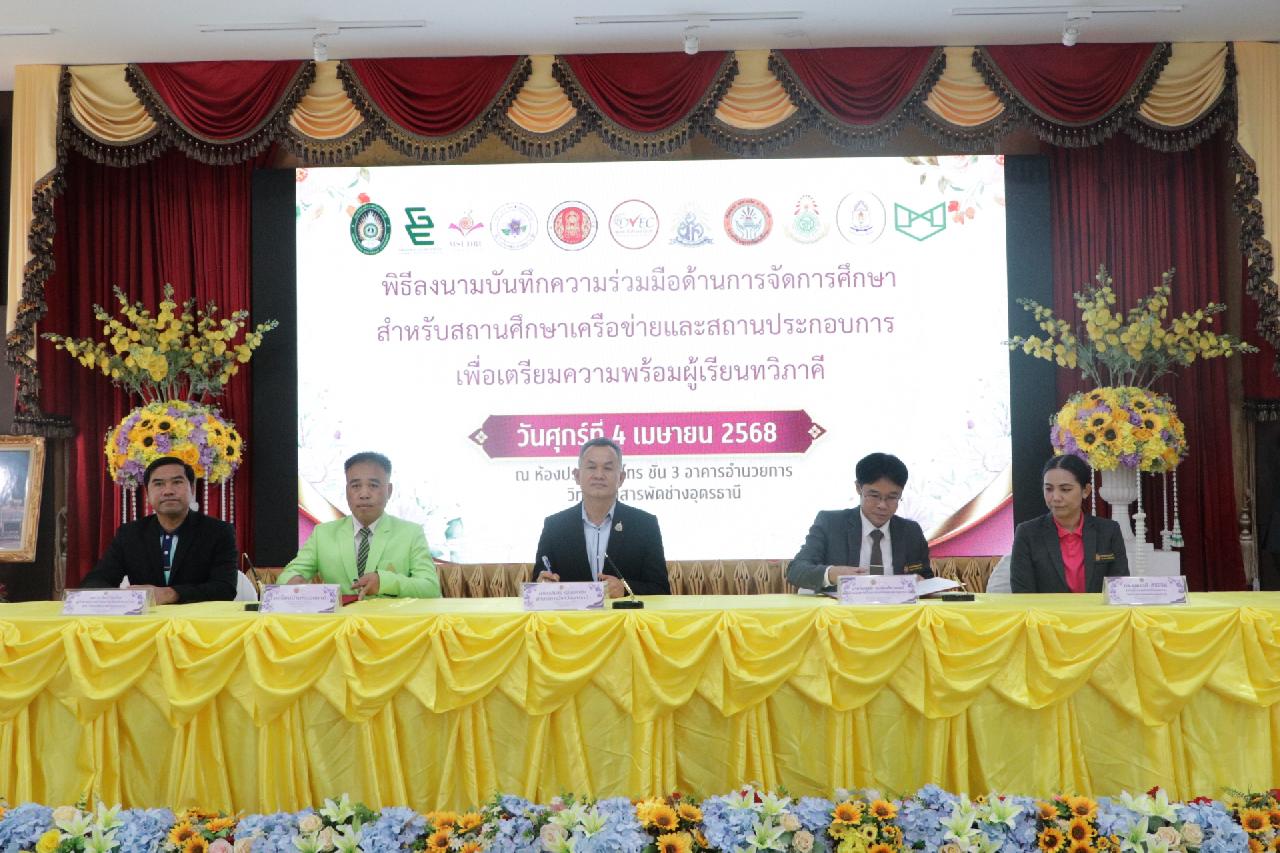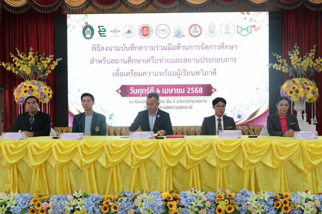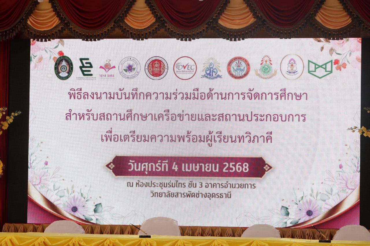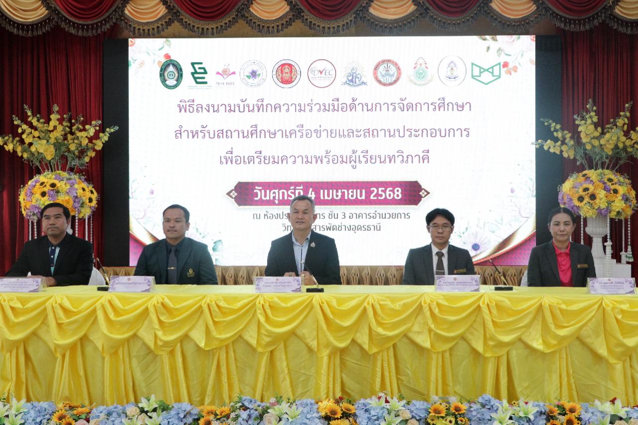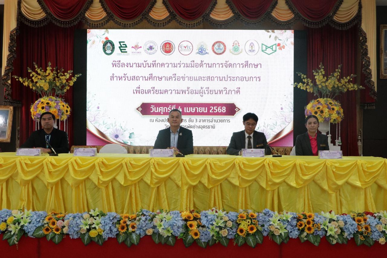 วันศุกร์ ที่ 4 เมษายน 2568 นายไพฑูรย์ ธนพงศ์ภากรณ์ ผู้อำนวยการวิทยาลัยสารพัดช่างอุดรธานี พร้อมด้วย คณะผู้บริหาร, คณะครู และบุคลากรทางการศึกษา เข้าร่วมพิธีลงนามบันทึกความร่วมมือด้านการจัดการศึกษา สำหรับสถานศึกษาเครือข่ายและสถานประกอบการ เพื่อเตรียมความพร้อมผู้เรียนทวิภาคี ณ ห้องประชุมร่มไทร่ ชั้น 3 อาคารอำนวยการ วิทยาลัยสารพัดช่างอุดรธานี