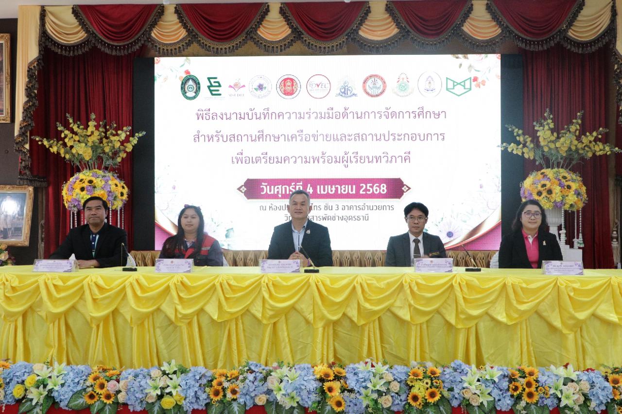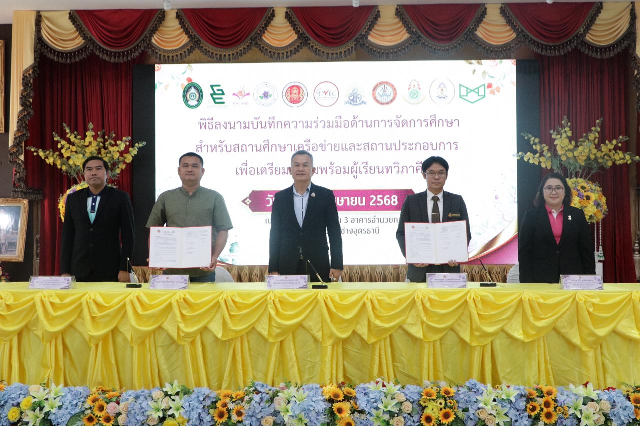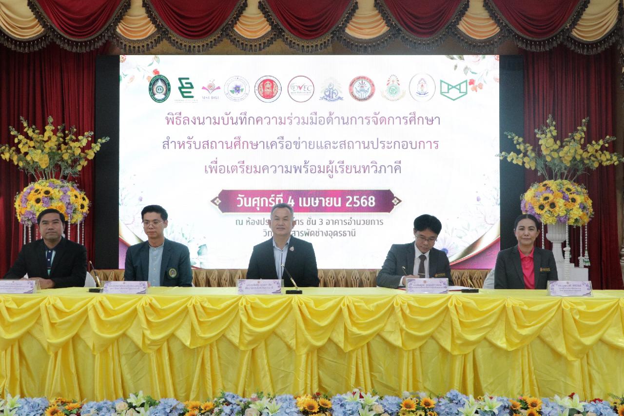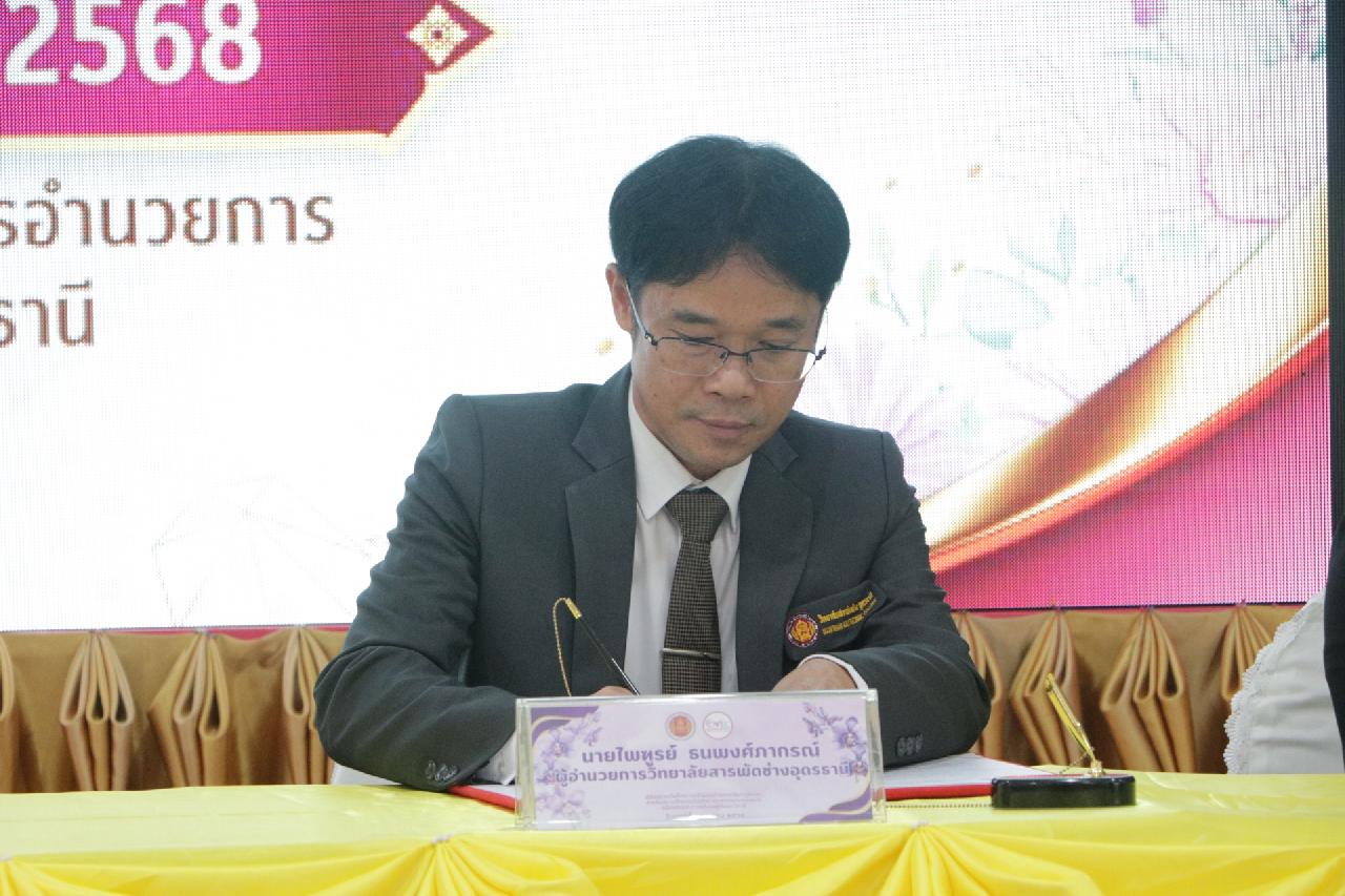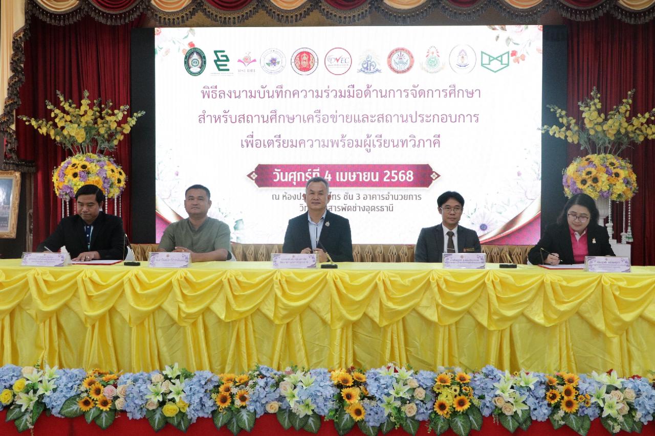 วันศุกร์ ที่ 4 เมษายน 2568 นายไพฑูรย์ ธนพงศ์ภากรณ์ ผู้อำนวยการวิทยาลัยสารพัดช่างอุดรธานี พร้อมด้วย คณะผู้บริหาร, คณะครู และบุคลากรทางการศึกษา เข้าร่วมพิธีลงนามบันทึกความร่วมมือด้านการจัดการศึกษา สำหรับสถานศึกษาเครือข่ายและสถานประกอบการ เพื่อเตรียมความพร้อมผู้เรียนทวิภาคี ณ ห้องประชุมร่มไทร่ ชั้น 3 อาคารอำนวยการ วิทยาลัยสารพัดช่างอุดรธานี