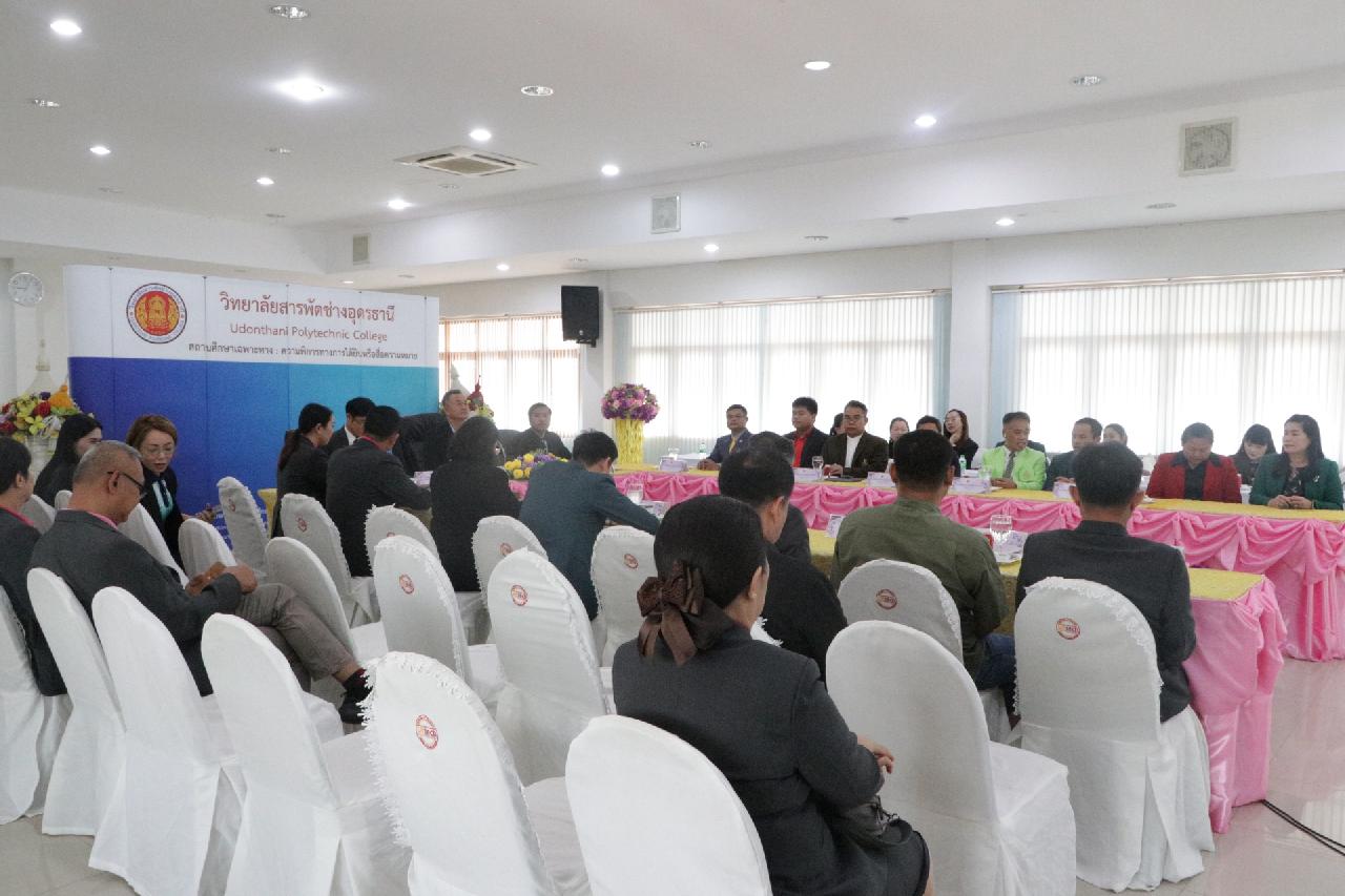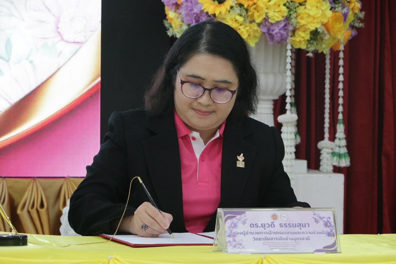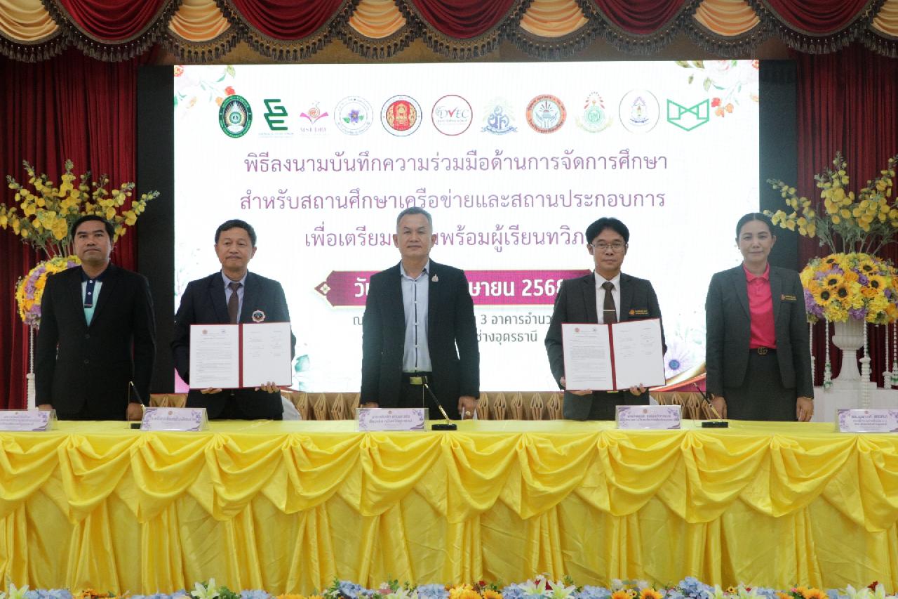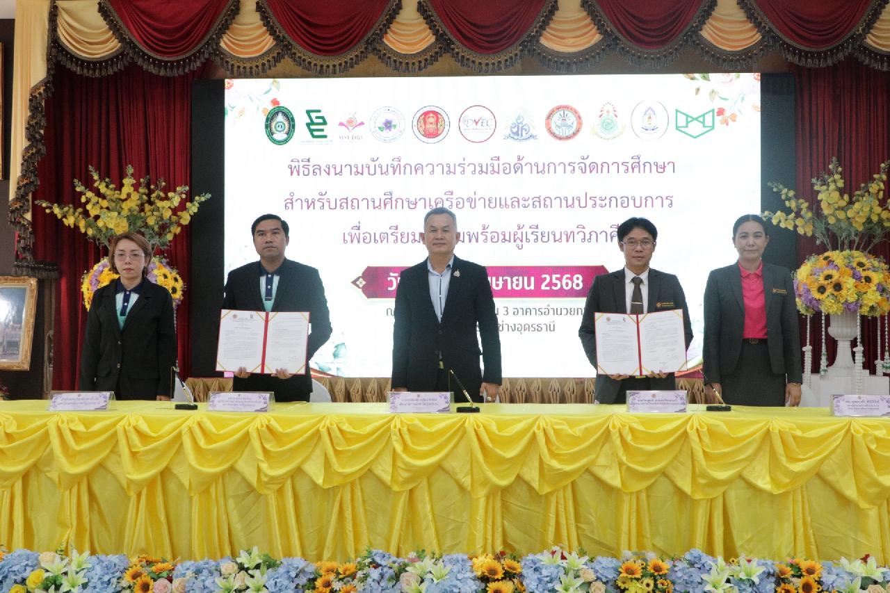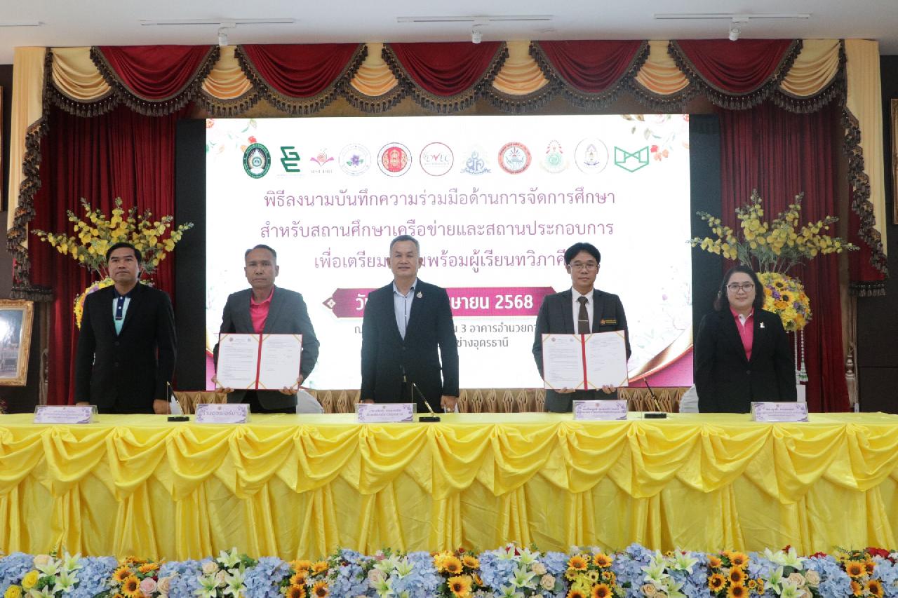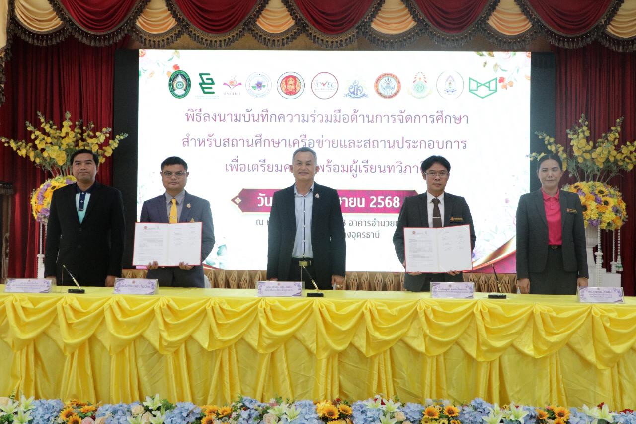 วันศุกร์ ที่ 4 เมษายน 2568 นายไพฑูรย์ ธนพงศ์ภากรณ์ ผู้อำนวยการวิทยาลัยสารพัดช่างอุดรธานี พร้อมด้วย คณะผู้บริหาร, คณะครู และบุคลากรทางการศึกษา เข้าร่วมพิธีลงนามบันทึกความร่วมมือด้านการจัดการศึกษา สำหรับสถานศึกษาเครือข่ายและสถานประกอบการ เพื่อเตรียมความพร้อมผู้เรียนทวิภาคี ณ ห้องประชุมร่มไทร่ ชั้น 3 อาคารอำนวยการ วิทยาลัยสารพัดช่างอุดรธานี