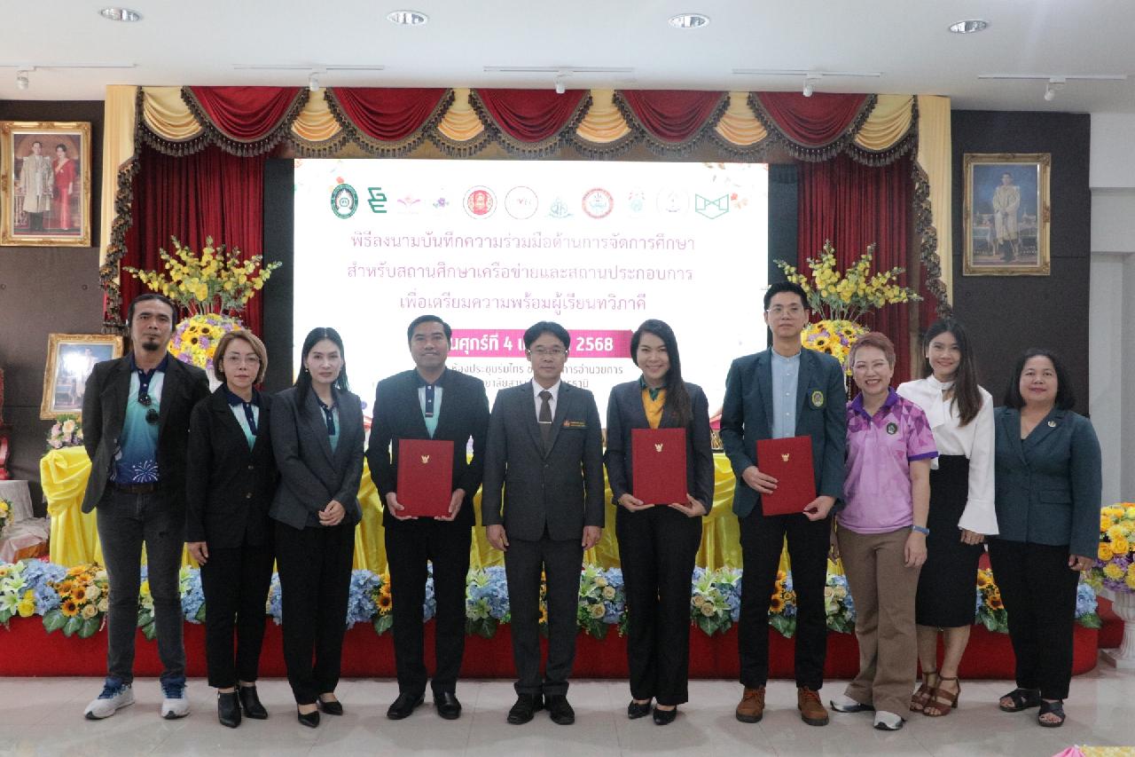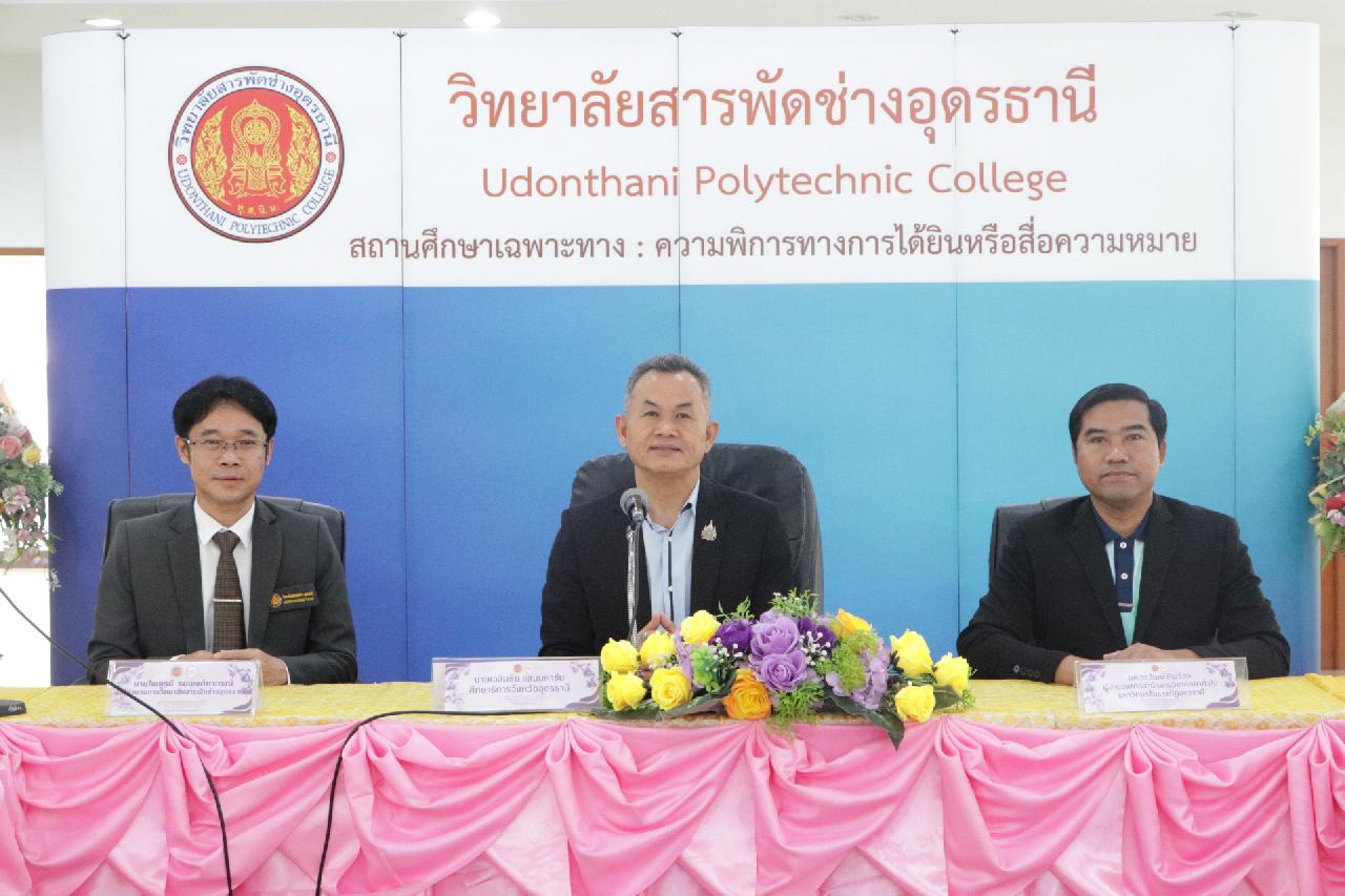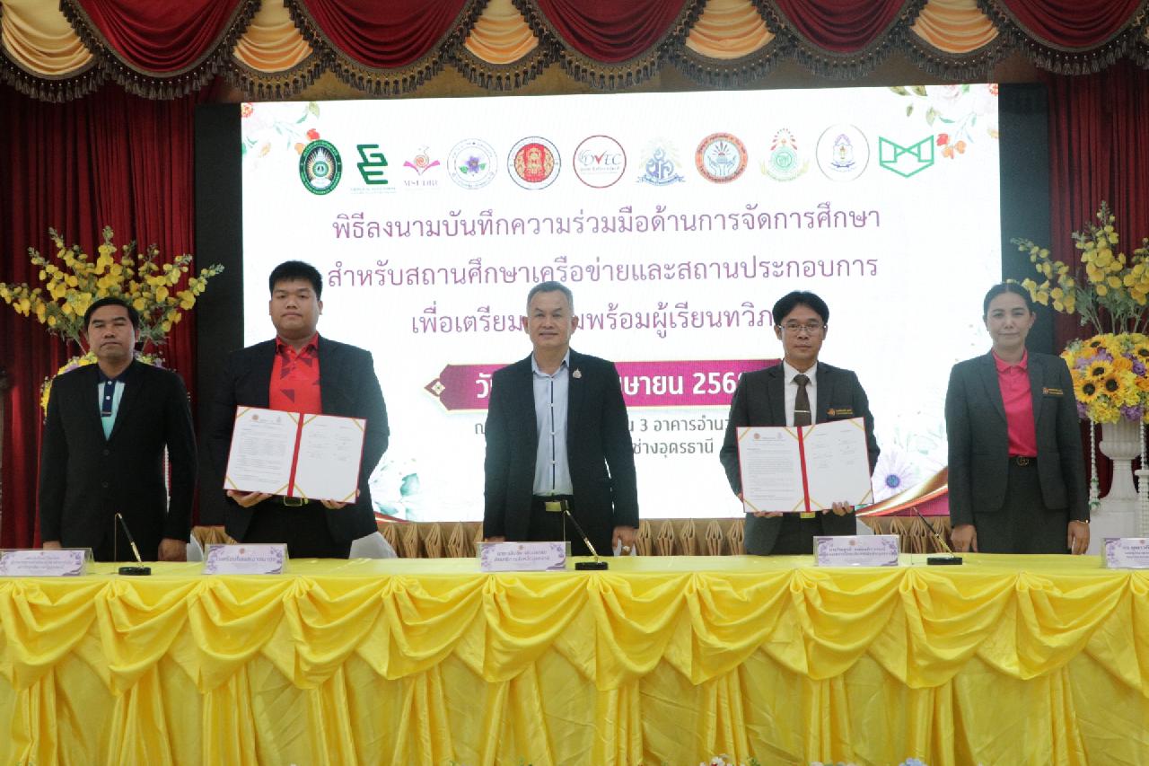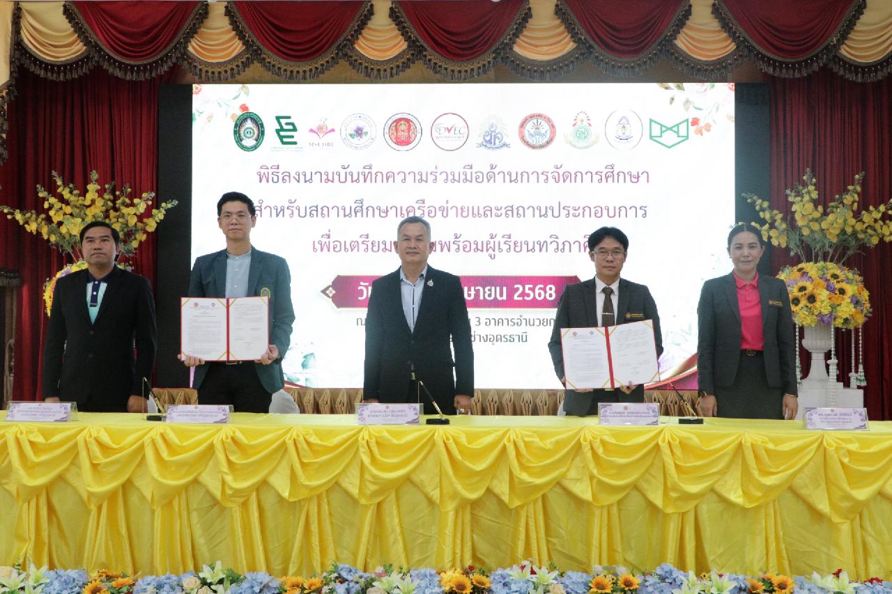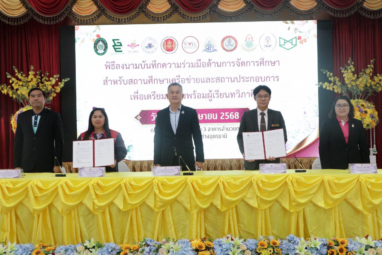 วันศุกร์ ที่ 4 เมษายน 2568 นายไพฑูรย์ ธนพงศ์ภากรณ์ ผู้อำนวยการวิทยาลัยสารพัดช่างอุดรธานี พร้อมด้วย คณะผู้บริหาร, คณะครู และบุคลากรทางการศึกษา เข้าร่วมพิธีลงนามบันทึกความร่วมมือด้านการจัดการศึกษา สำหรับสถานศึกษาเครือข่ายและสถานประกอบการ เพื่อเตรียมความพร้อมผู้เรียนทวิภาคี ณ ห้องประชุมร่มไทร่ ชั้น 3 อาคารอำนวยการ วิทยาลัยสารพัดช่างอุดรธานี