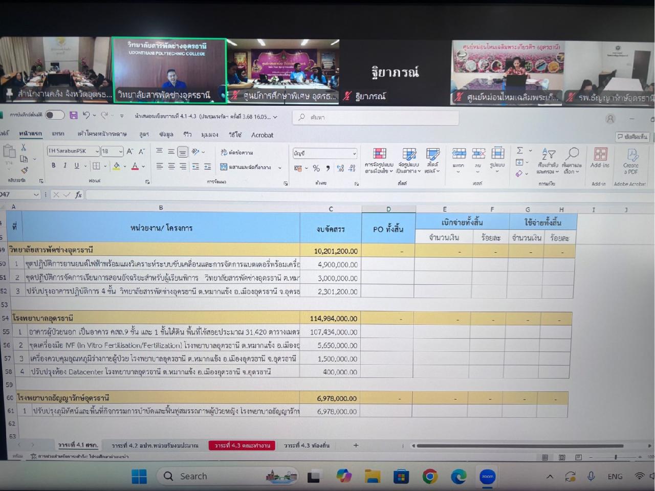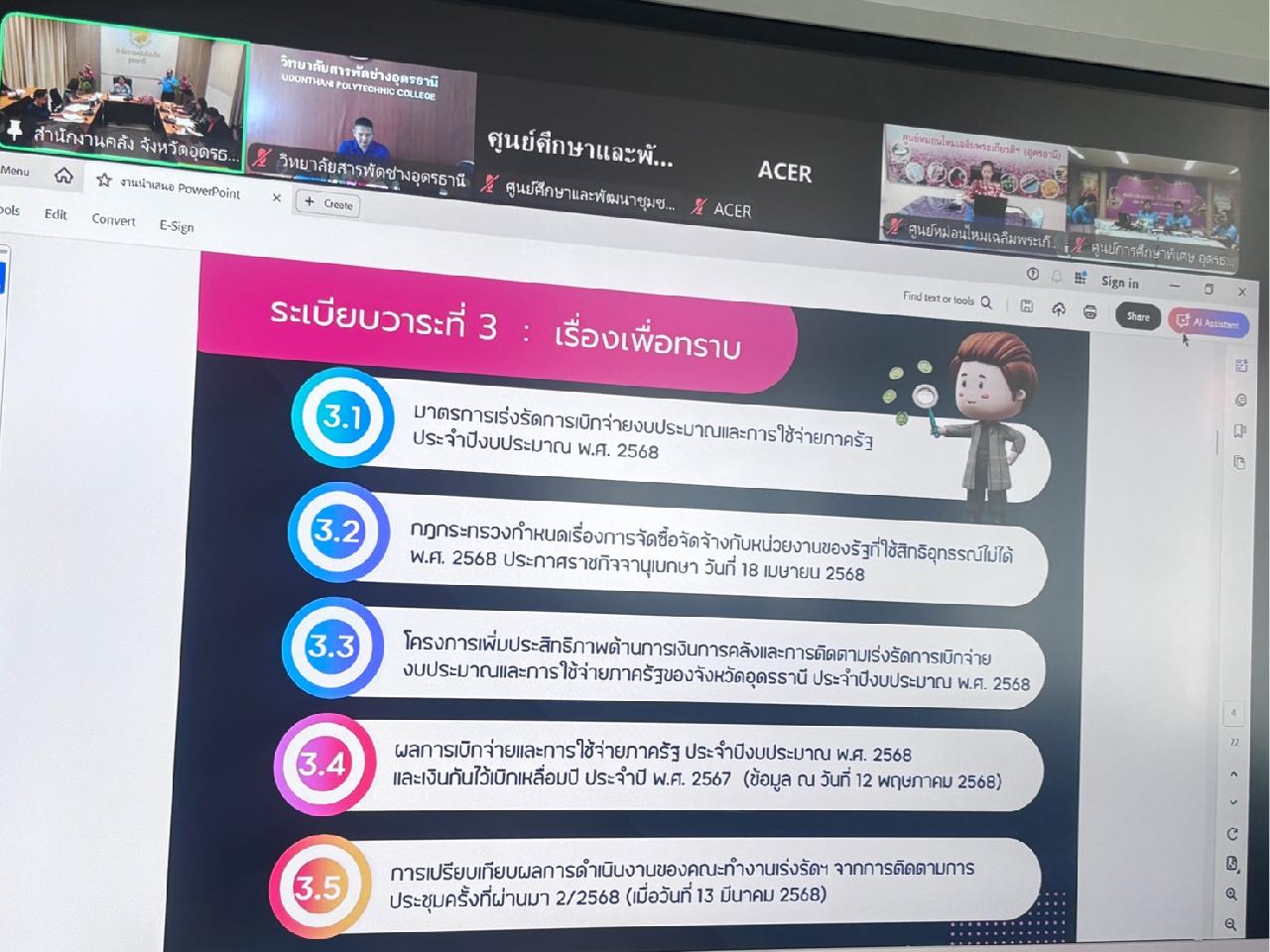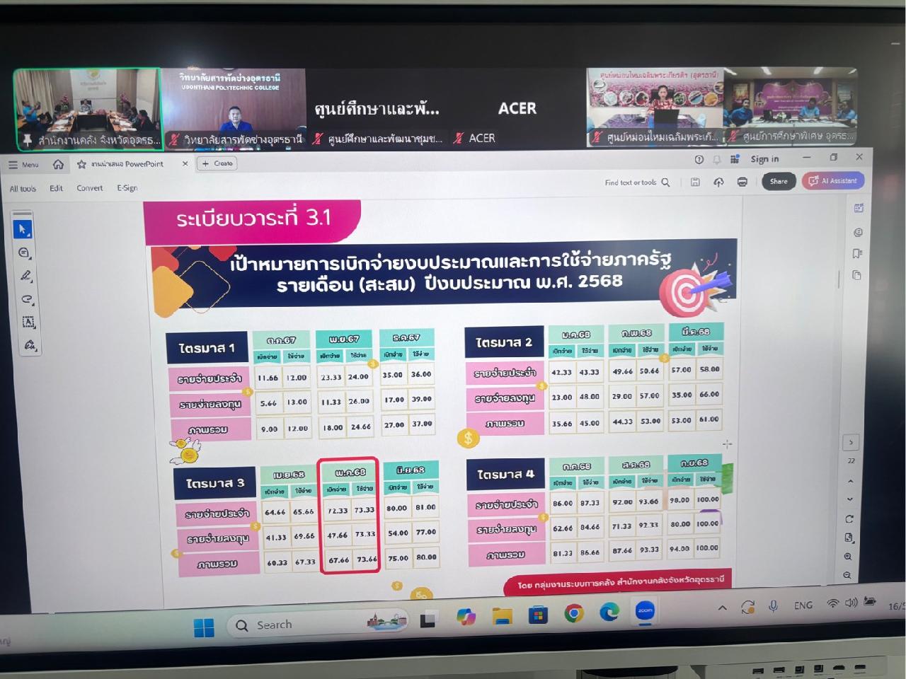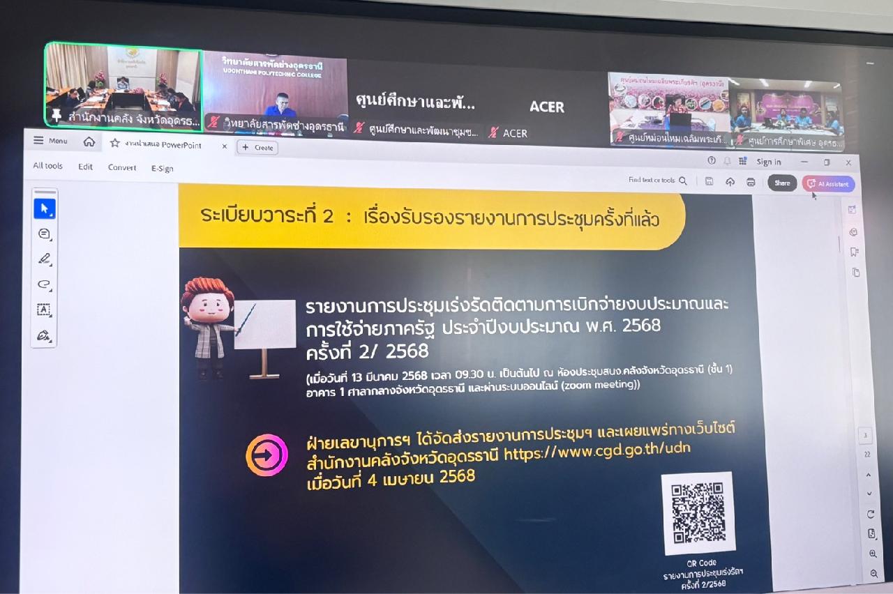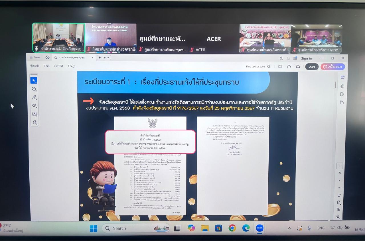 วันศุกร์ ที่ 16 พฤษภาคม 2568 นายไพฑูรย์ ธนพงศ์ภากรณ์ ผู้อำนวยการวิทยาลัยสารพัดช่างอุดรธานี ได้มอบหมายให้ว่าที่ร้อยโท อภิเดช สารคำ รองผู้อำนวยการฝ่ายบริหารทรัพยากร เข้าร่วมประชุมเร่งรัดติดตามการเบิกจ่ายงบประมาณและการใช้จ่ายภาครัฐ ประจำปีงบประมาณ พ.ศ. 2568 ผ่านระบบออนไลน์ (Zoom Meeting)