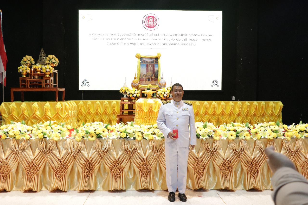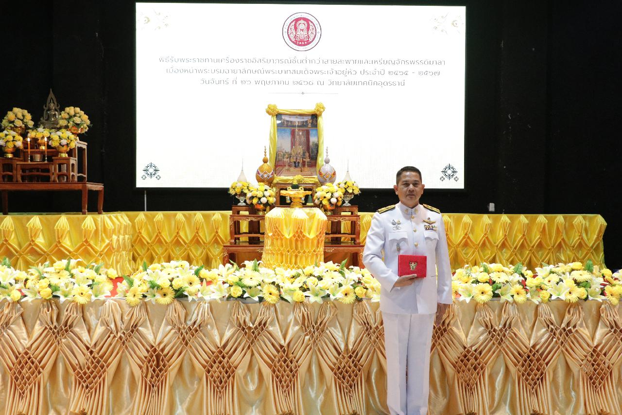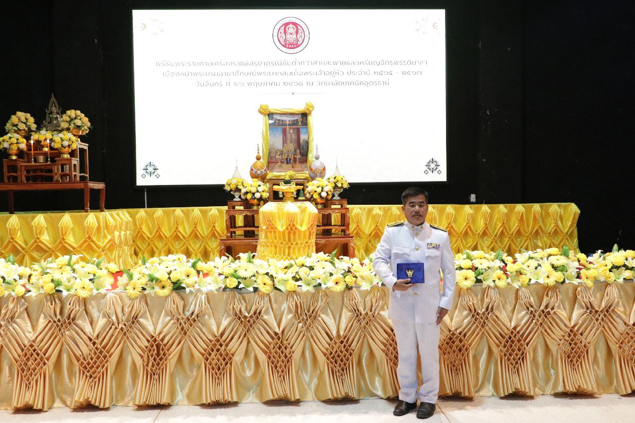 วันจันทร์ ที่ 26 พฤษภาคม 2568 นายไพฑูรย์ ธนพงศ์ภากรณ์ ผู้อำนวยการวิทยาลัยสารพัดช่างอุดรธานี มอบหมายให้ ว่าที่ร้อยโทอภิเดช สารคำ รองผู้อำนวยการฝ่ายบริหารทรัพยากร และคณะครู เข้าร่วมพิธีรับพระราชทานเครื่องราชอิสริยาภรณ์ชั้นต่ำกว่าสายสะพายและเหรียญจักรพรรดิมาลา เบื้องหน้าพระบรมฉายาลักษณ์พระบาทสมเด็จพระเจ้าอยู่หัว ประจำปี 2565-2567 ณ วิทยาลัยเทคนิคอุดรธานี