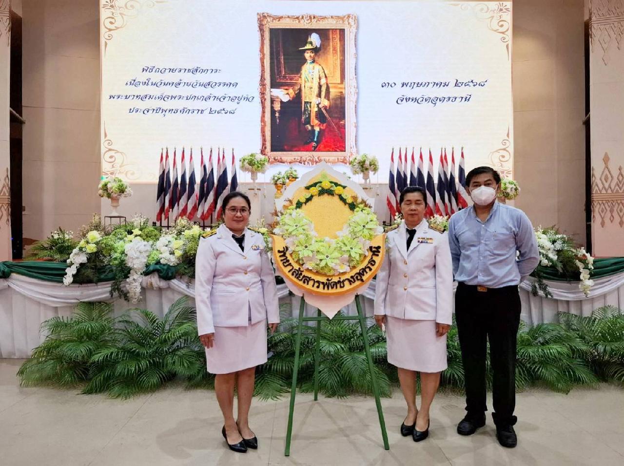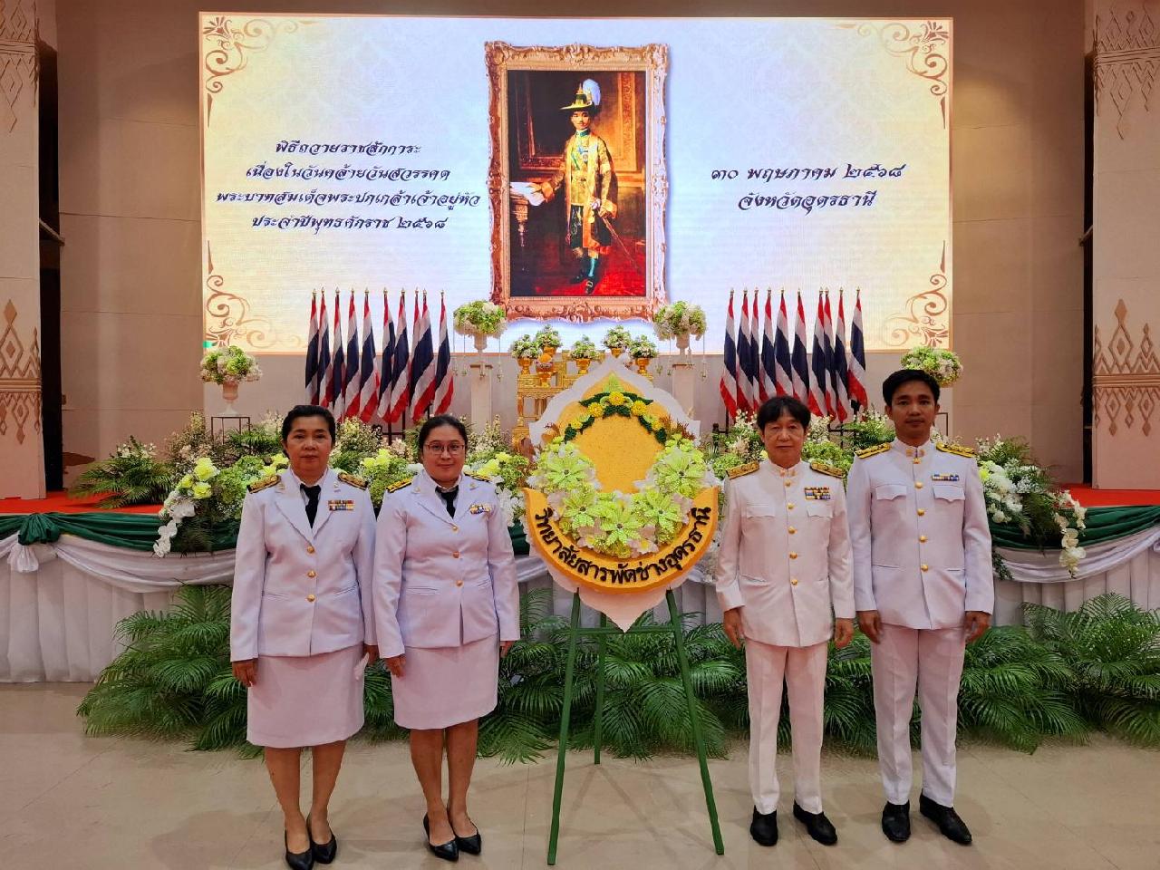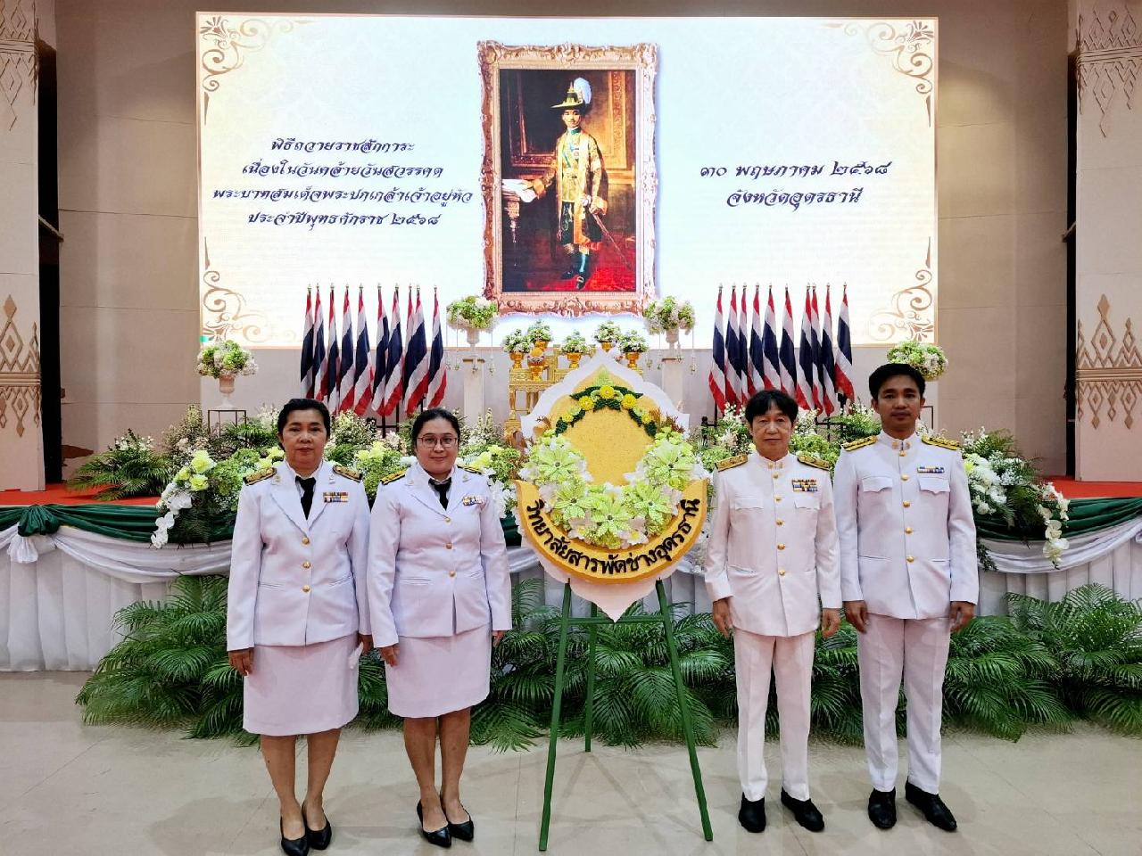 วันศุกร์ที่ 30 พฤษภาคม 2568 นายไพฑูรย์ ธนพงศ์ภากรณ์ ผู้อำนวยการวิทยาลัยสารพัดช่างอุดรธานี มอบหมายให้ ดร.ยุวดี ธรรมสุนา รองผู้อำนวยการฝ่ายแผนงานและความร่วมมือ พร้อมด้วยนายวิสาขะ เรืองปัญญา หัวหน้างานความร่วมมือ, นางนวลนภา ริมโพธิ์เงิน หัวหน้างานประกันคุณภาพและมาตรฐานการศึกษา นายสถาพร จันทะพา หัวหน้างานศูนย์ข้อมูลฯ และนายพีรวัส ยานู เจ้าหน้าที่ฝ่ายแผนงานและความร่วมมือ เข้าร่วมพิธีถวายราชสักการะเนื่องในวันคล้ายวันสวรรคตพระบาทสมเด็จพระปกเกล้าเจ้าอยู่หัว ประจำปีพุทธศักราช 2568 ณ หอประชุมทองใหญ่ ศาลากลางจังหวัดอุดรธานี