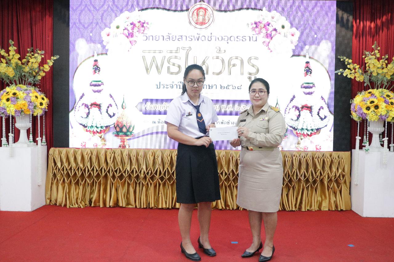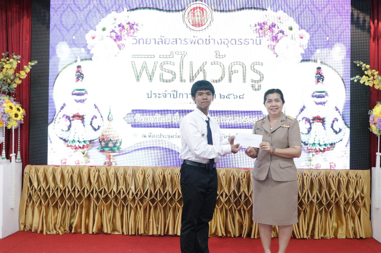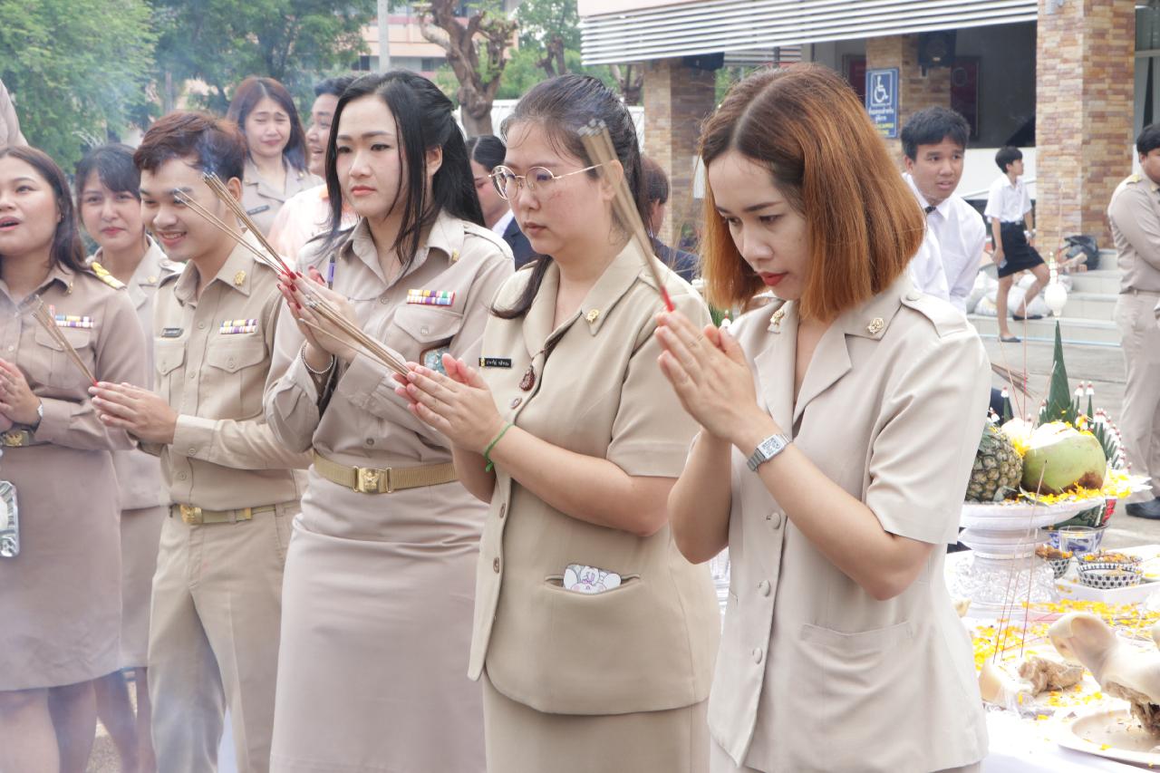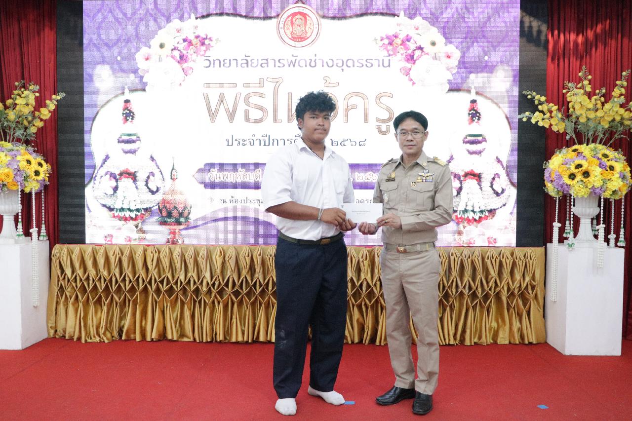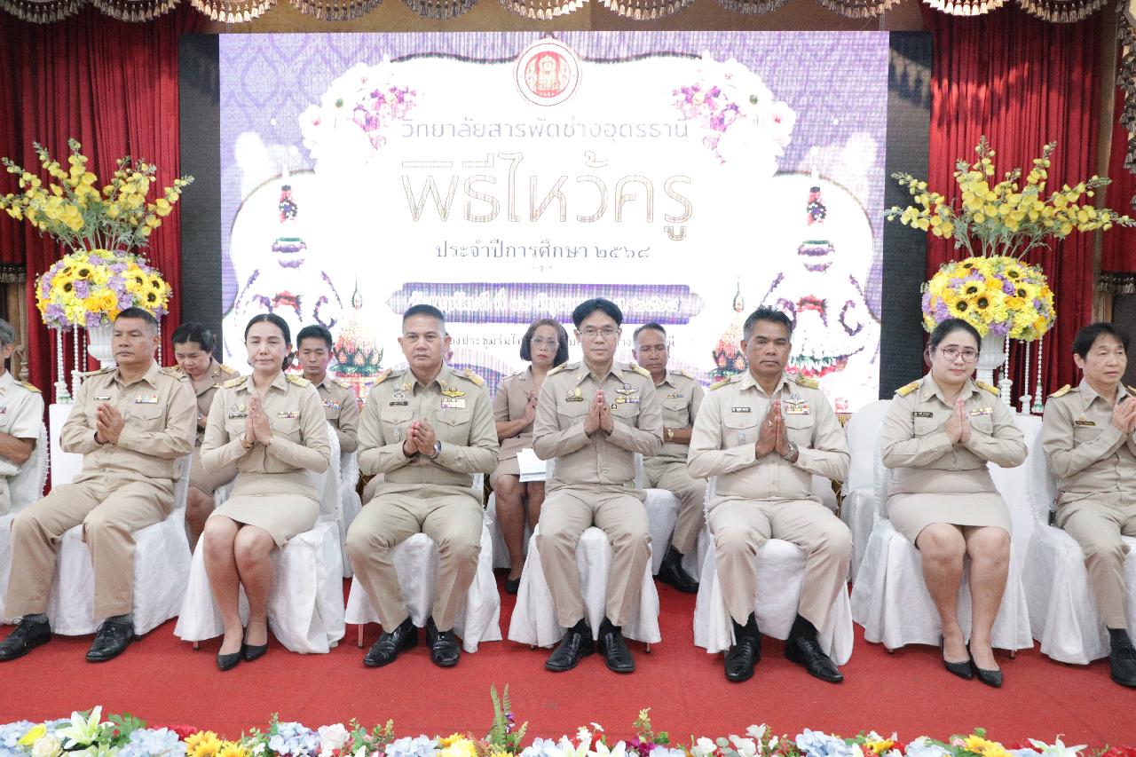 วันพฤหัสบดี ที่ 12 มิถุนายน 2568 นายไพฑูรย์ ธนพงศ์ภากรณ์ ผู้อำนวยการวิทยาลัยสารพัดช่างอุดรธานี พร้อมด้วย คณะผู้บริหาร, คณะครู, บุคลากรทางการศึกษา และนักเรียน นักศึกษา เข้าร่วมพิธีไหว้ครู ประจำปีการศึกษา 2568 ณ วิทยาลัยสารพัดช่างอุดรธานี