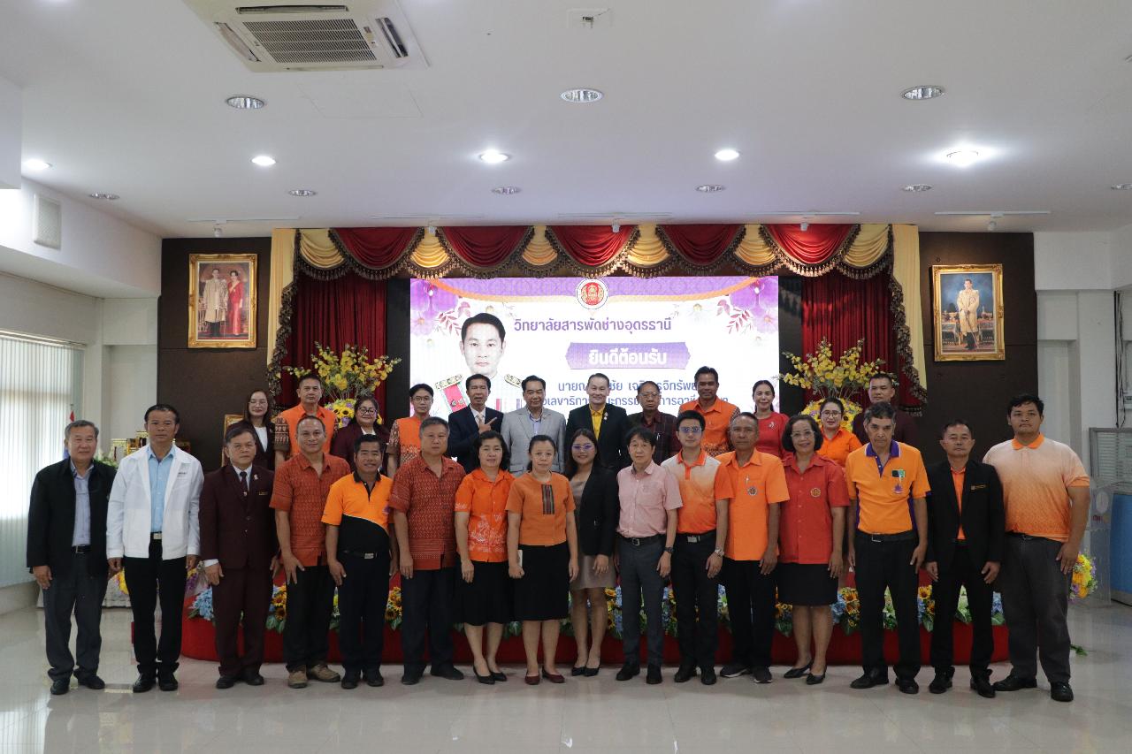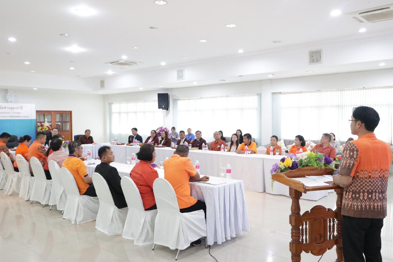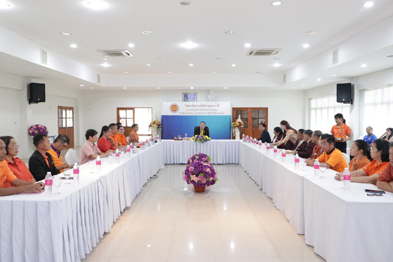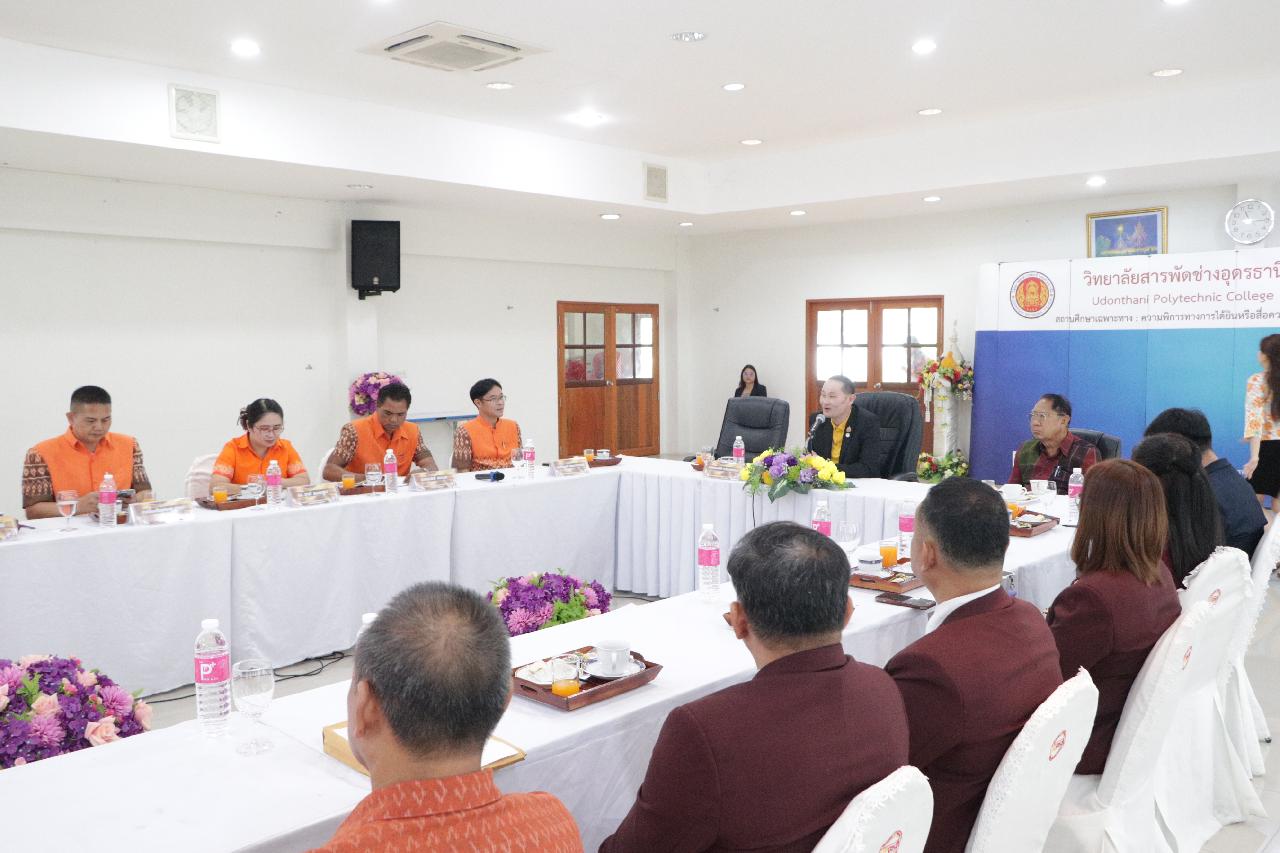 วันพฤหัสบดี ที่ 19 มิถุนายน 2568 นายไพฑูรย์ ธนพงศ์ภากรณ์ ผู้อำนวยการวิทยาลัยสารพัดช่างอุดรธานี พร้อมด้วย คณะผู้บริหาร คณะครู และบุคลากรทางการศึกษา ร่วมต้อนรับ นายณรงค์ชัย เจริญรุจิทรัพย์ รองเลขาธิการคณะกรรมการการอาชีวศึกษา ลงพื้นที่ตรวจราชการและติดตามการดำเนินงานตามนโยบาย ณ ห้องประชุมร่มไทร ชั้น 3 อาคารอำนวยการ วิทยาลัยสารพัดช่างอุดรธานี