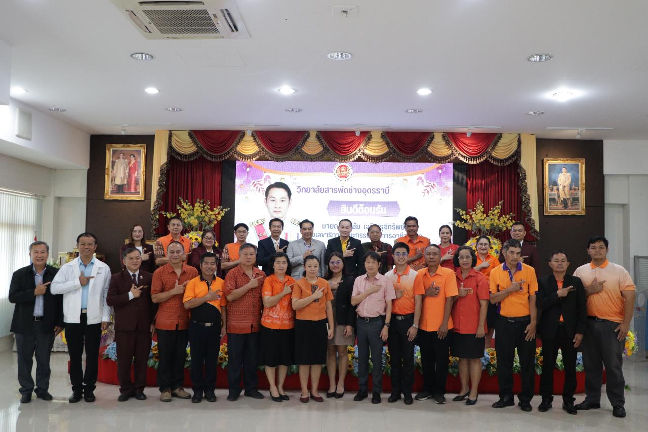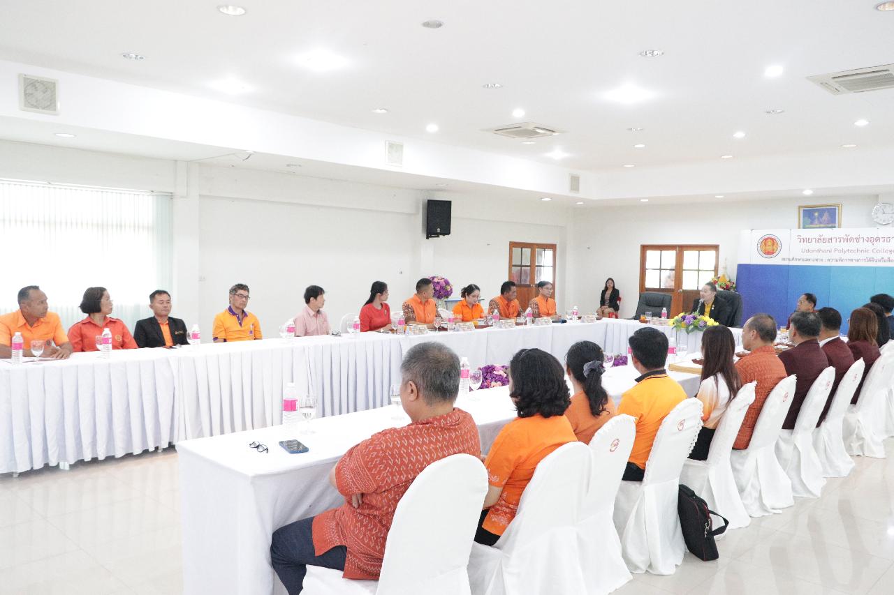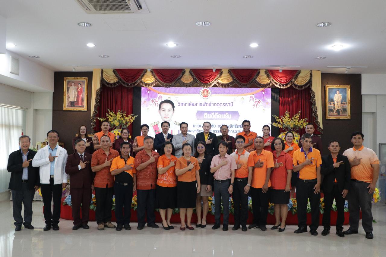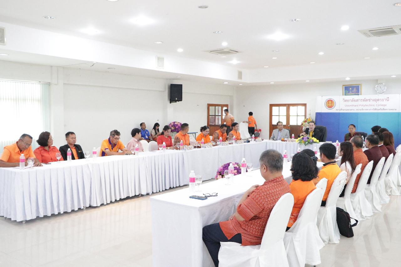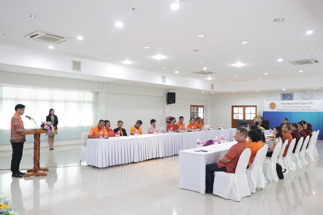 วันพฤหัสบดี ที่ 19 มิถุนายน 2568 นายไพฑูรย์ ธนพงศ์ภากรณ์ ผู้อำนวยการวิทยาลัยสารพัดช่างอุดรธานี พร้อมด้วย คณะผู้บริหาร คณะครู และบุคลากรทางการศึกษา ร่วมต้อนรับ นายณรงค์ชัย เจริญรุจิทรัพย์ รองเลขาธิการคณะกรรมการการอาชีวศึกษา ลงพื้นที่ตรวจราชการและติดตามการดำเนินงานตามนโยบาย ณ ห้องประชุมร่มไทร ชั้น 3 อาคารอำนวยการ วิทยาลัยสารพัดช่างอุดรธานี