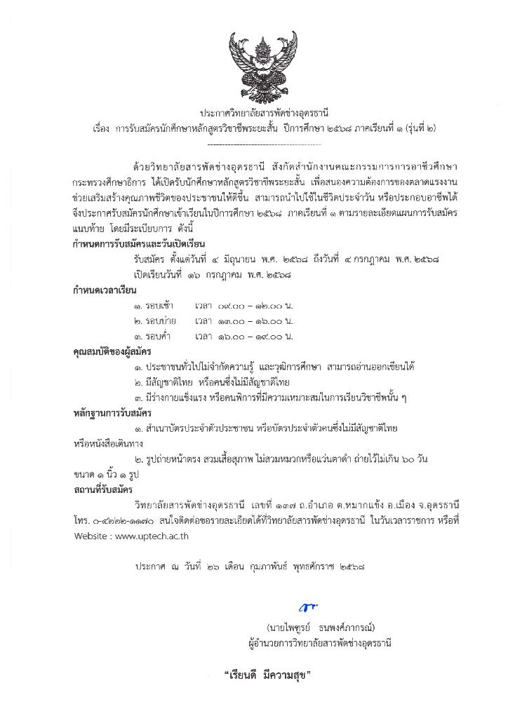 รับสมัครนักศึกษาหลักสูตรวิชาชีพระยะสั้น ภาคเรียนที่ 1 ปีการศึกษา 2568 รุ่นที่ 2 (วันที่ 13 เดือน พฤษภาคม พ.ศ. 2568)