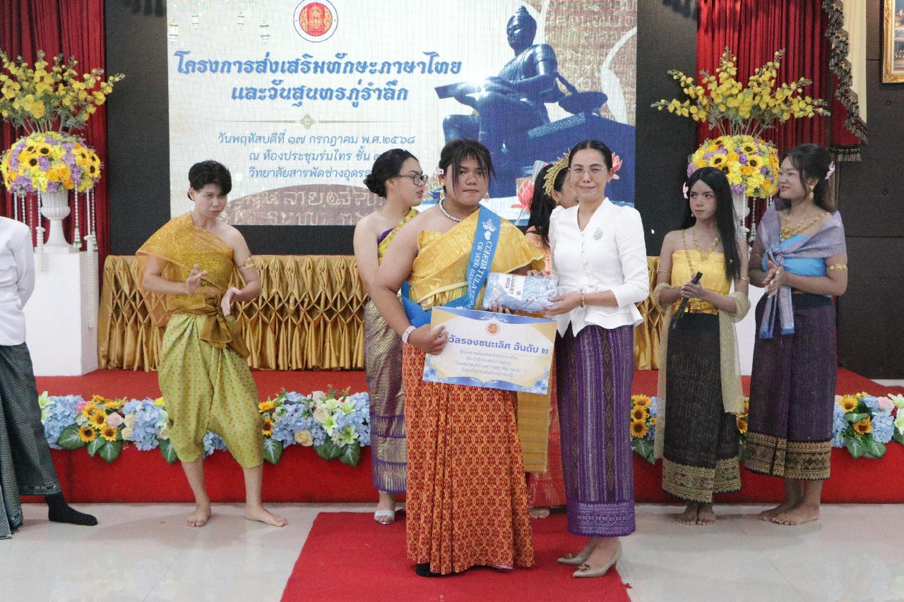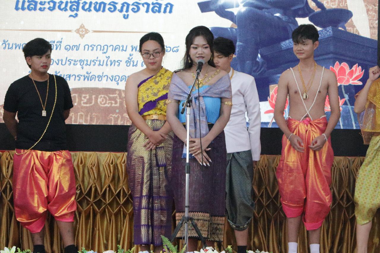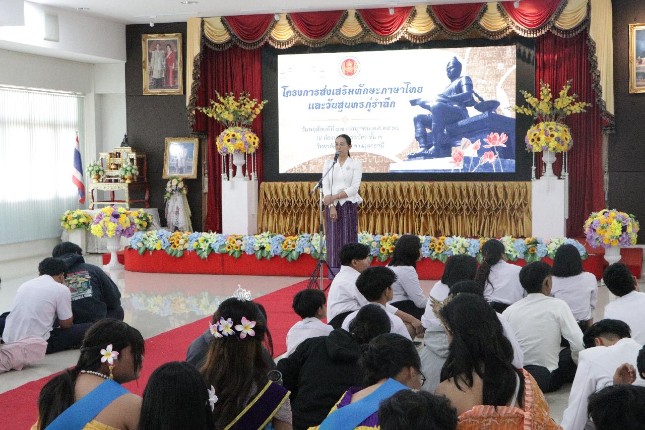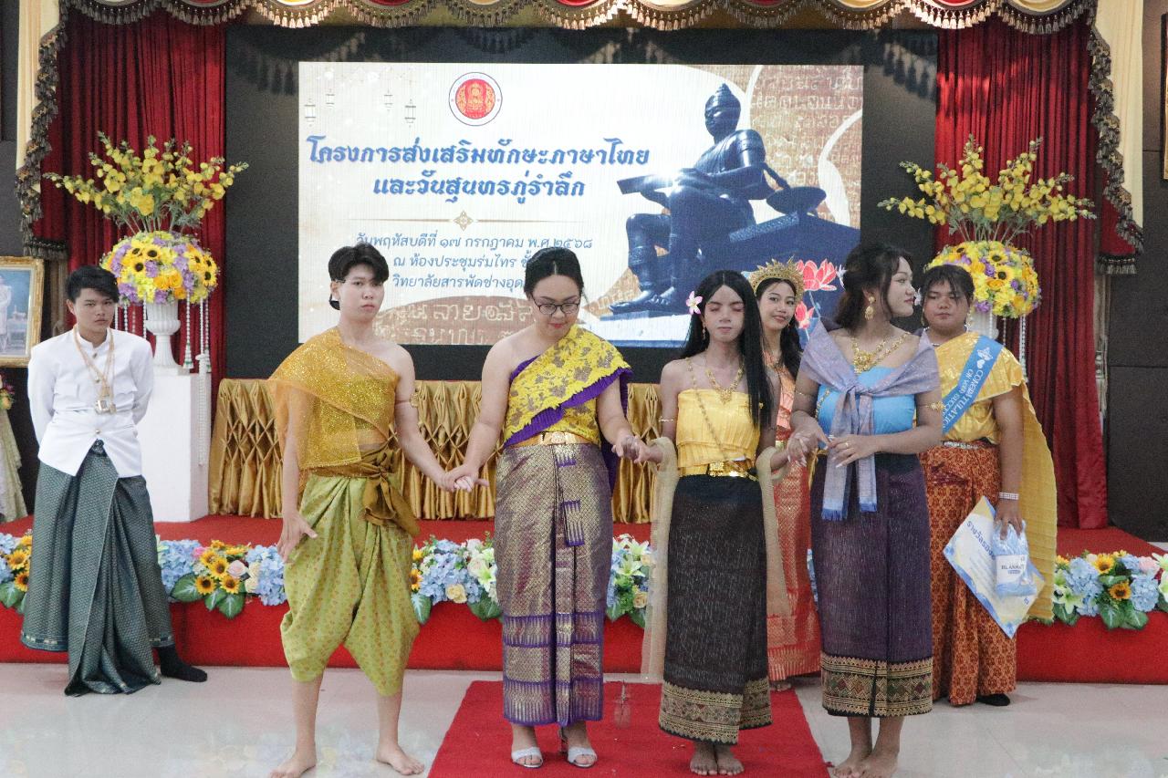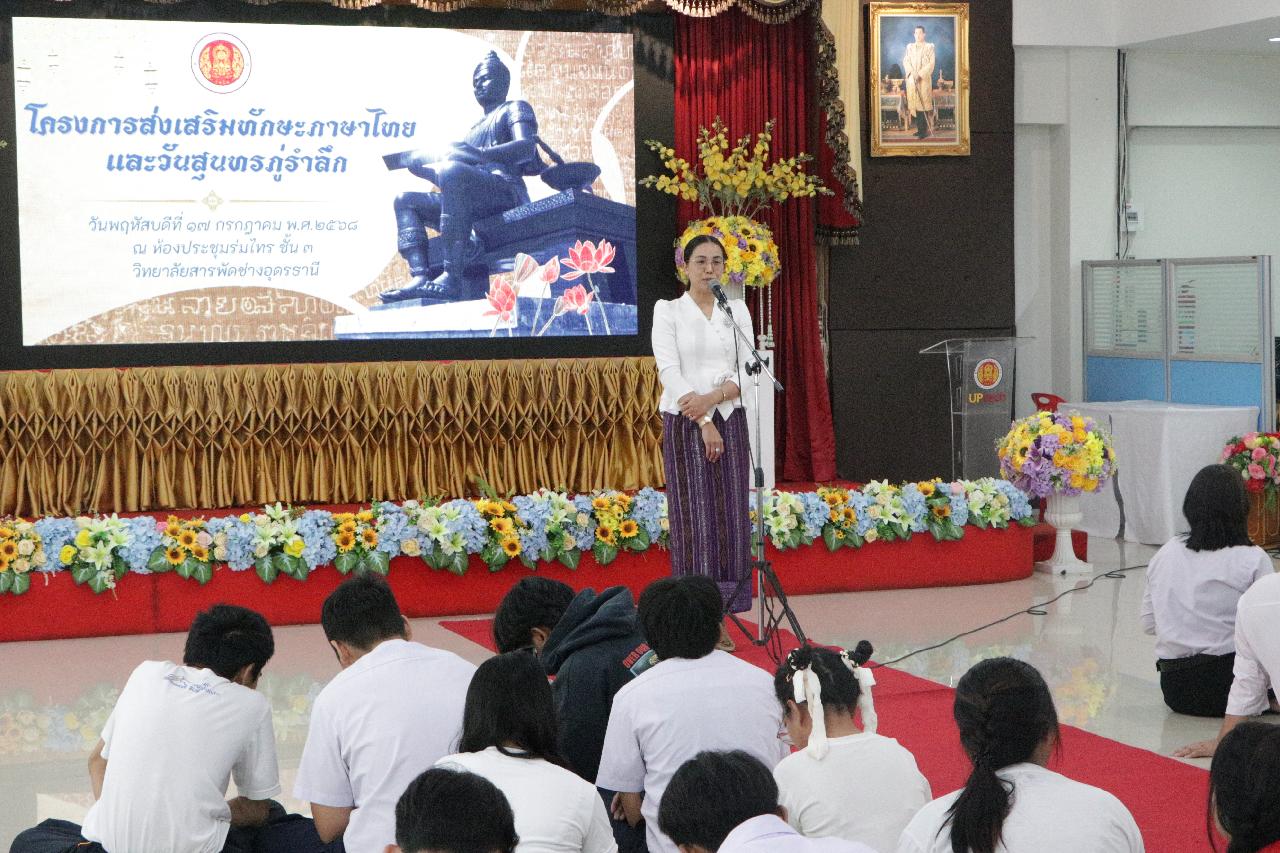 วันพฤหัสบดี ที่ 17 กรกฎาคม 2568 นายไพฑูรย์ ธนพงศ์ภากรณ์ ผู้อำนวยการวิทยาลัยสารพัดช่างอุดรธานี พร้อมด้วย ว่าที่ร้อยโทอภิเดช สารคำ รองผู้อำนวยการฝ่ายบริหารทรัพยากร, ดร.ยุพาวดี ศิริปีริด์ รองผู้อำนวยการฝ่ายวิชาการ, คณะครู, บุคลากรทางการศึกษา และนักเรียนนักศึกษา ร่วมกิจกรรมโครงการส่งเสริมทักษะภาษาไทยและวันสุนทรภู่ ณ ห้องประชุมร่มไทร ชั้น 3 อาคารอำนวยการ วิทยาลัยสารพัดช่างอุดรธานี