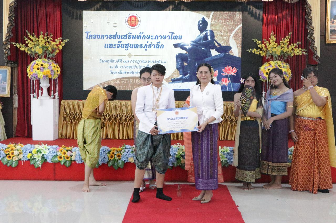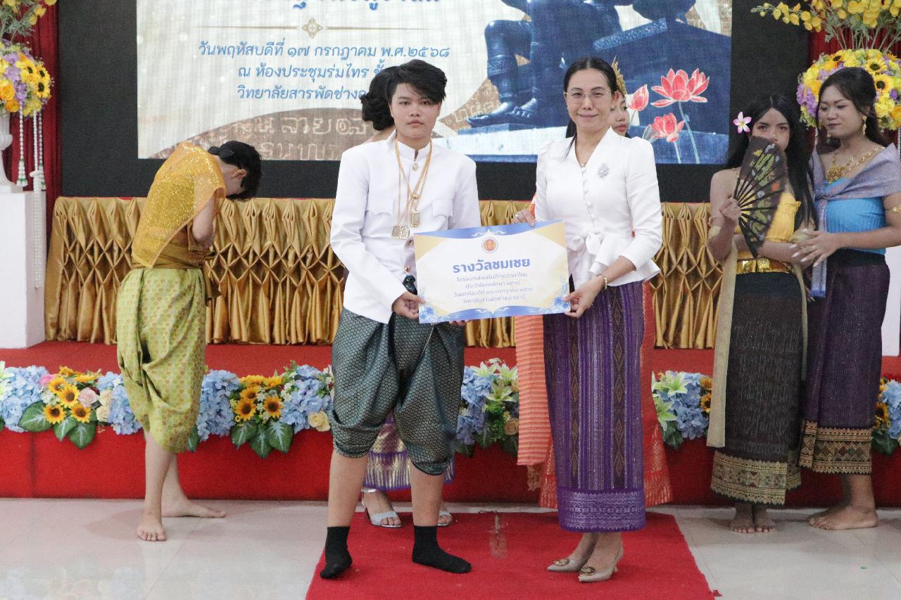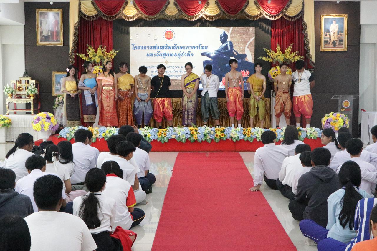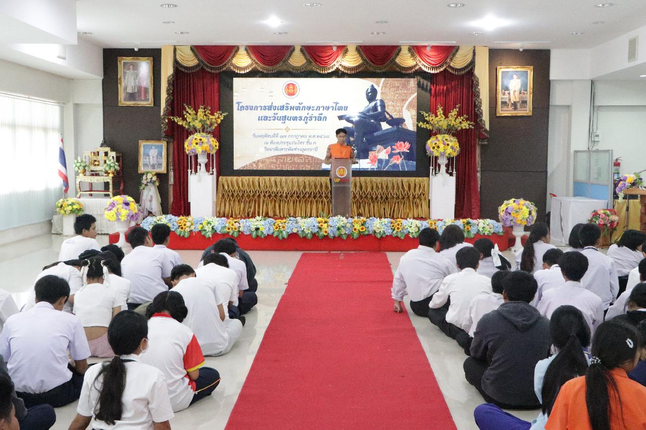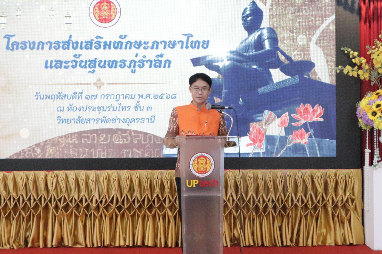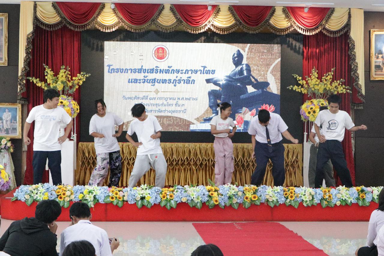 วันพฤหัสบดี ที่ 17 กรกฎาคม 2568 นายไพฑูรย์ ธนพงศ์ภากรณ์ ผู้อำนวยการวิทยาลัยสารพัดช่างอุดรธานี พร้อมด้วย ว่าที่ร้อยโทอภิเดช สารคำ รองผู้อำนวยการฝ่ายบริหารทรัพยากร, ดร.ยุพาวดี ศิริปีริด์ รองผู้อำนวยการฝ่ายวิชาการ, คณะครู, บุคลากรทางการศึกษา และนักเรียนนักศึกษา ร่วมกิจกรรมโครงการส่งเสริมทักษะภาษาไทยและวันสุนทรภู่ ณ ห้องประชุมร่มไทร ชั้น 3 อาคารอำนวยการ วิทยาลัยสารพัดช่างอุดรธานี