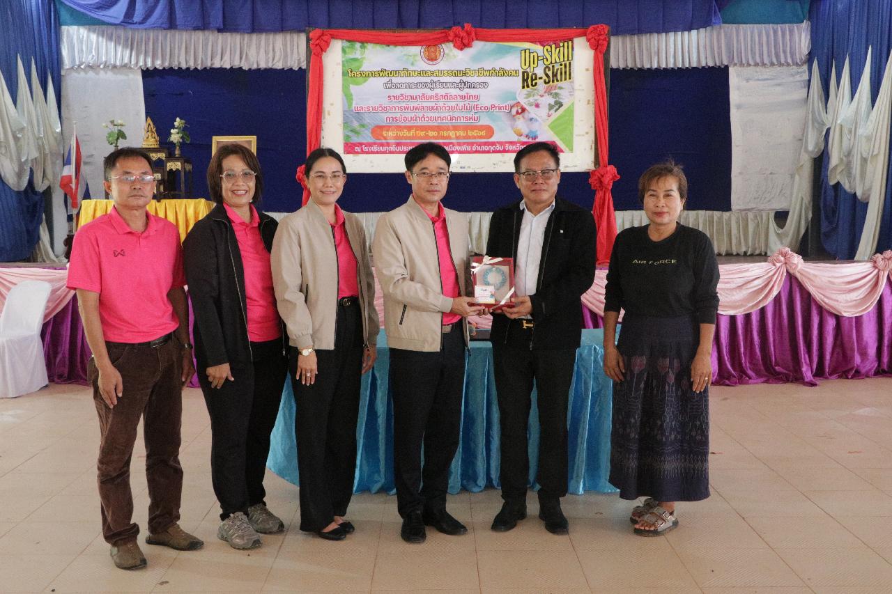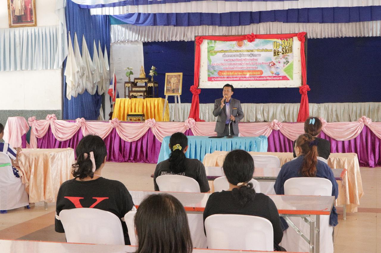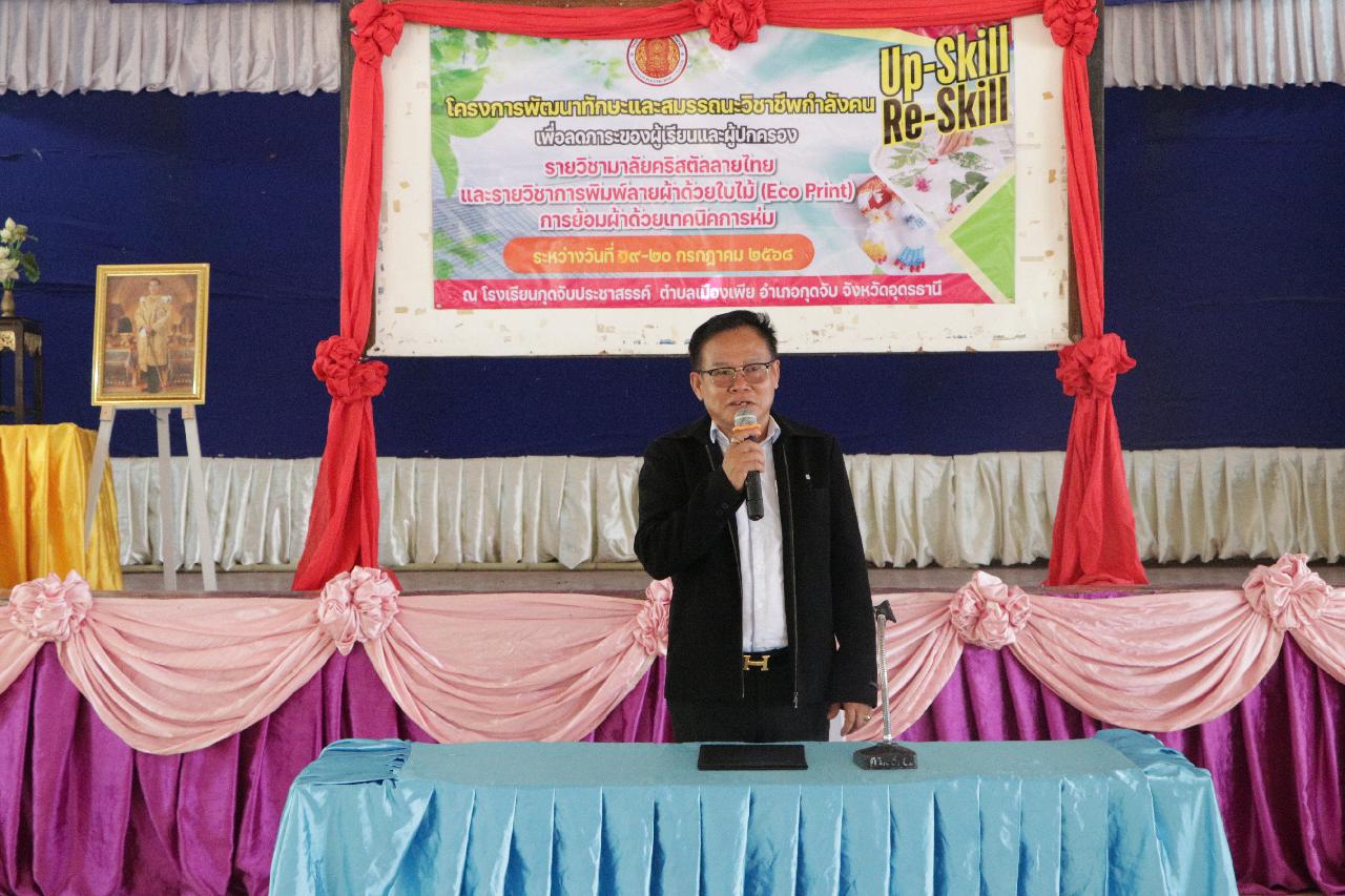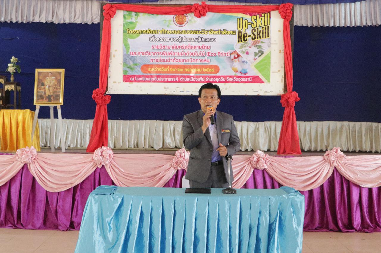 วันเสาร์ ที่ 19 และวันอาทิตย์ ที่ 20 กรกฎาคม 2568 นายไพฑูรย์ ธนพงศ์ภากรณ์ ผู้อำนวยการวิทยาลัยสารพัดช่างอุดรธานี พร้อมด้วย ดร.ยุพาวดี ศิริปีริด์ รองผู้อํานวยการ คณะครู บุคลากรทางการศึกษา ร่วมโครงการพัฒนาทักษะและสมรรถนะวิชาชีพกำลังคน เพื่อลดภาระของผู้เรียนและผู้ปกครอง รายวิชามาลัยคริสตัลลายไทยและรายวิชาการพิมพ์ลายผ้าด้วยใบไม้ (Eco Print) การย้อมผ้าด้วยเทคนิคการห่ม ณ โรงเรียนกุดจับประชาสรรค์ ตำบลเมืองเพีย อำเภอกุดจับ จังหวัดอุดรธานี