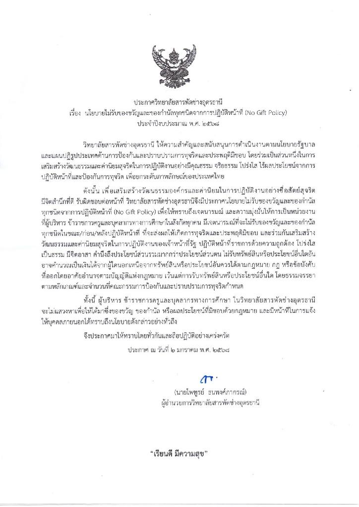 ข้าราชการครูและบุคลากร วิทยาลัยสารพัดช่างอุดรธานี งดรับ งดให้ ของขวัญและของกำนัลทุกชนิด เพื่อเสริมสร้างวัฒนธรรม และค่านิยมสุจริตในการปฏิบัติงาน
