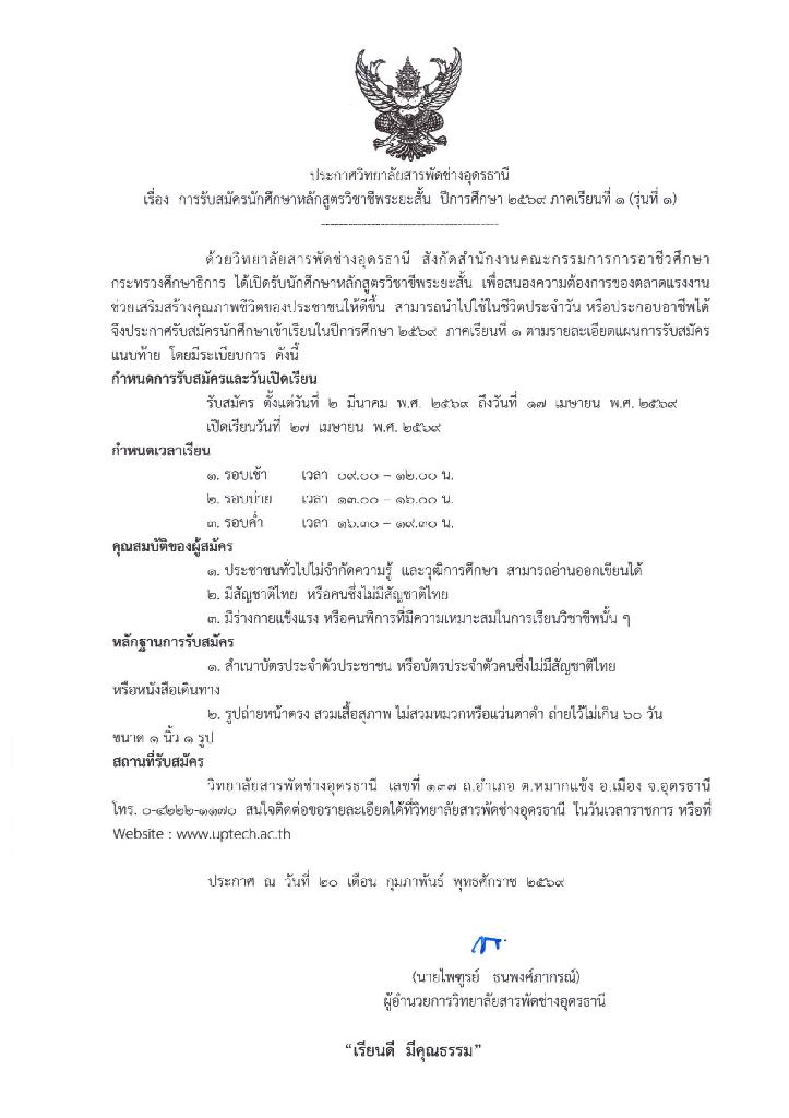 วิทยาลัยสารพัดช่างอุดรธานีรับสมัครนักศึกษาหลักสูตรวิชาชีพระยะสั้น ภาคเรียนที่ 1 ปีการศึกษา 2569 รุ่นที่ 1 เริ่มรับสมัครตั้งแต่วันที่ 2 มีนาคม - 17 เมษายน 2569 เปิดเรียนวันที่ 27 เมษายน 2569 >> สนใจติดต่อสอบถามได้ที่ >> งานทะเบียน 042-221170 , 042-241911>>