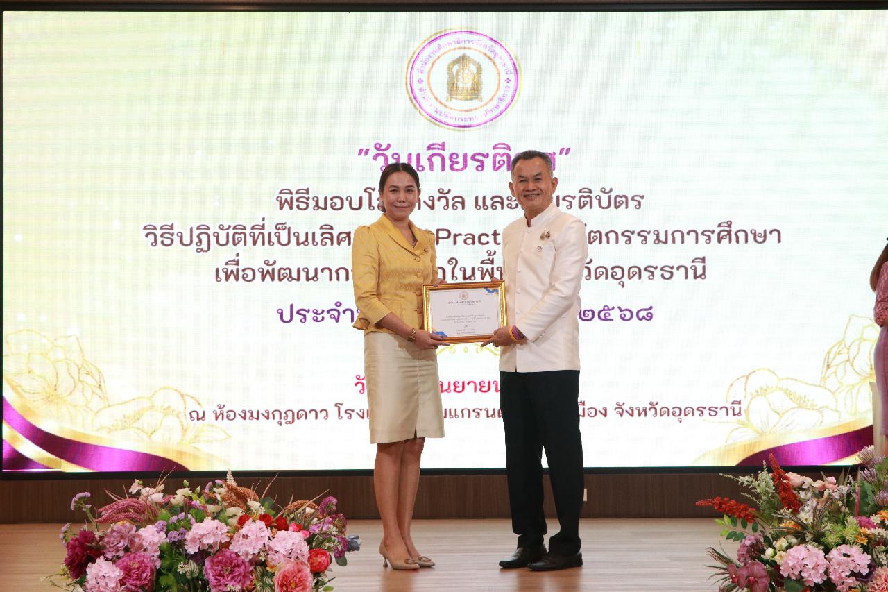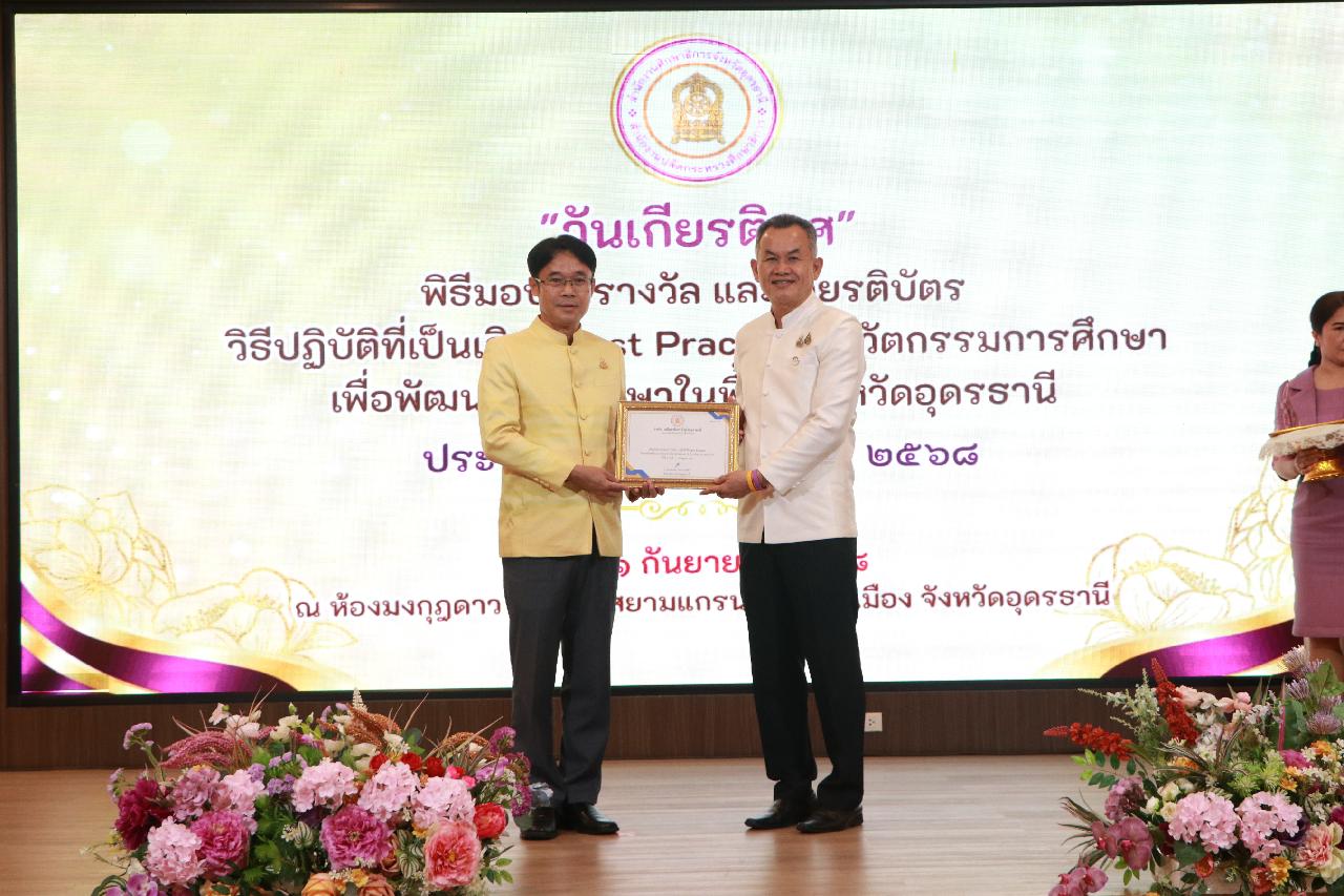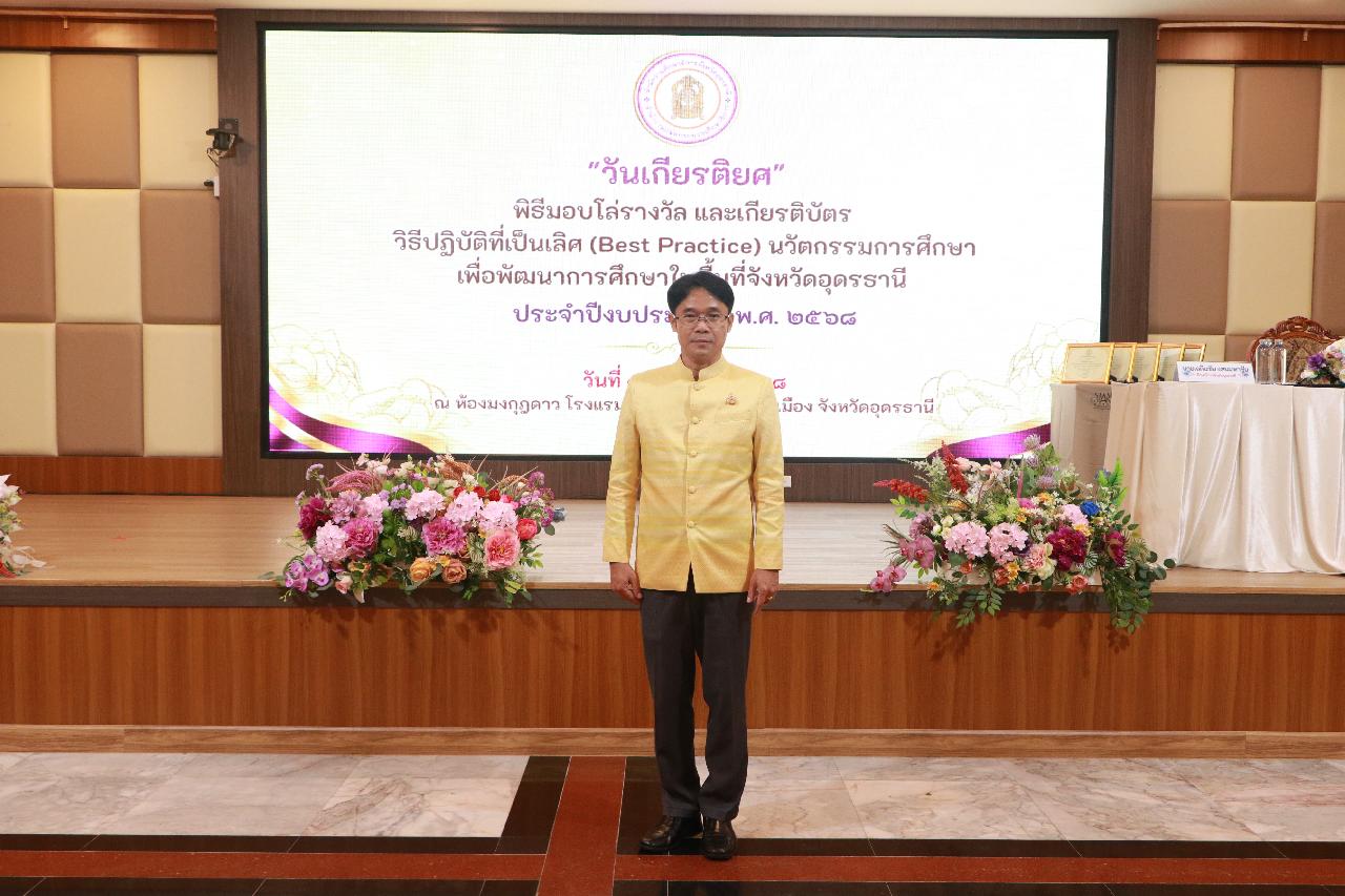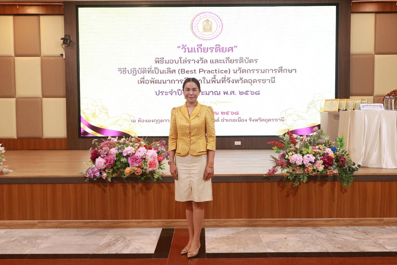 วันจันทร์ ที่ 1 กันยายน 2568 นายไพฑูรย์ ธนพงศ์ภากรณ์ ผู้อำนวยการวิทยาลัยสารพัดช่างอุดรธานี พร้อมด้วย ดร.ยุพาวดี ศิริปีริด์ รองผู้อำนวยการฝ่ายวิชาการ เข้าร่วมการมอบโล่รางวัล และเกียรติบัตร ระดับจังหวัด สำหรับผู้ที่ได้รับรางวัล วิธีปฏิบัติที่เป็นเลิศ (Best Practice) นวัตกรรมการศึกษา เพื่อพัฒนาการศึกษาในพื้นที่จังหวัดอุดรธานี ประจำปีงบประมาณ พ.ศ.2568
