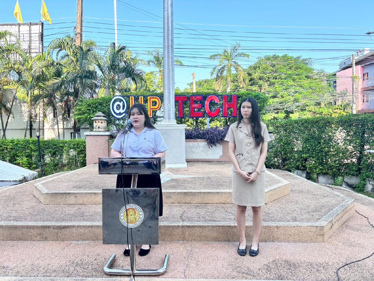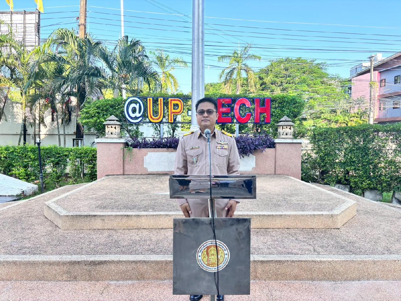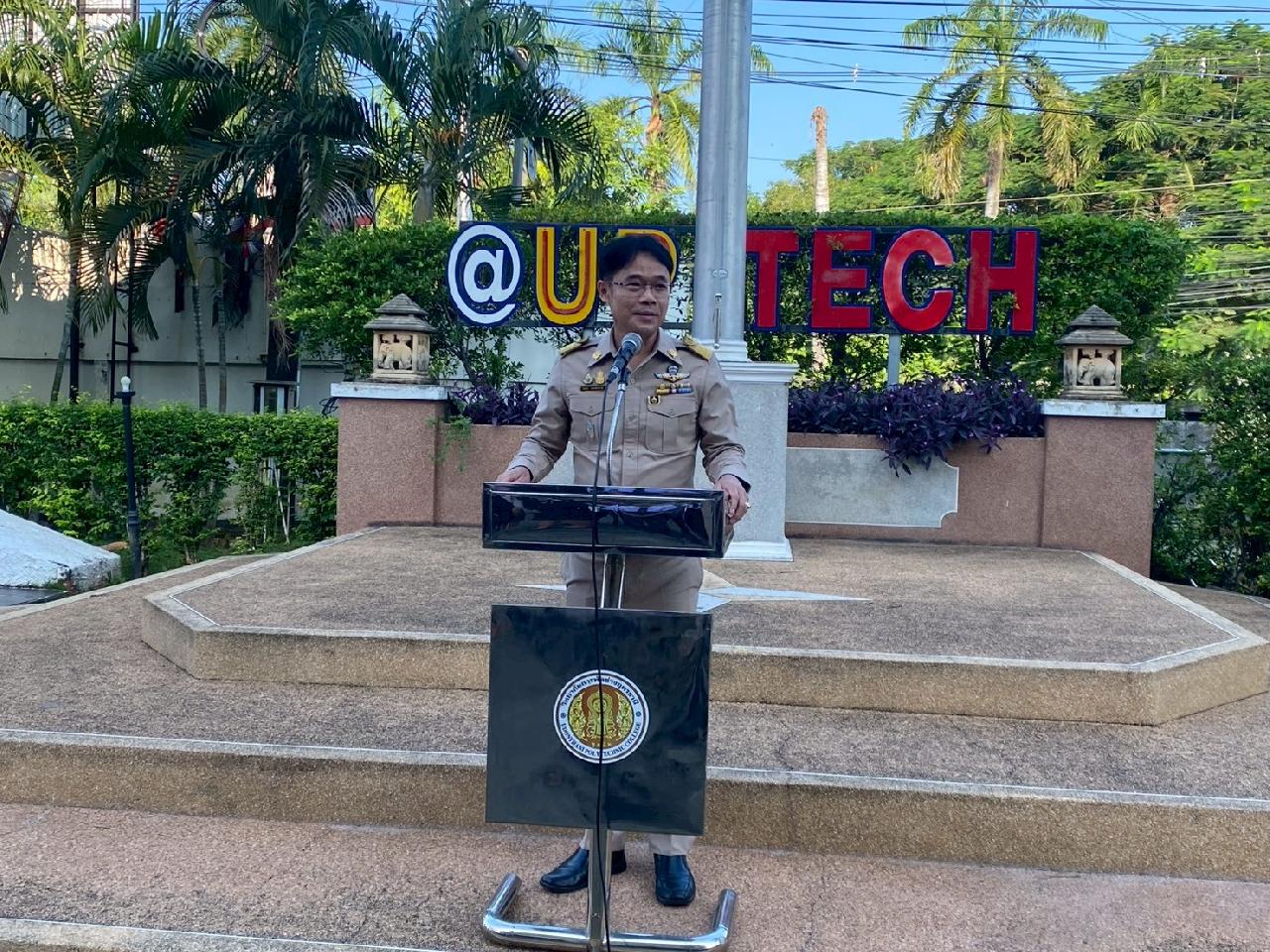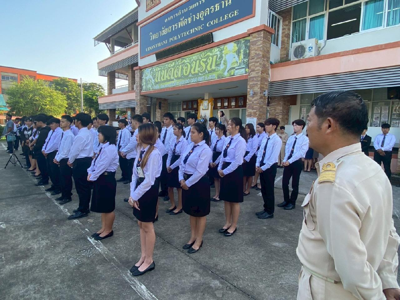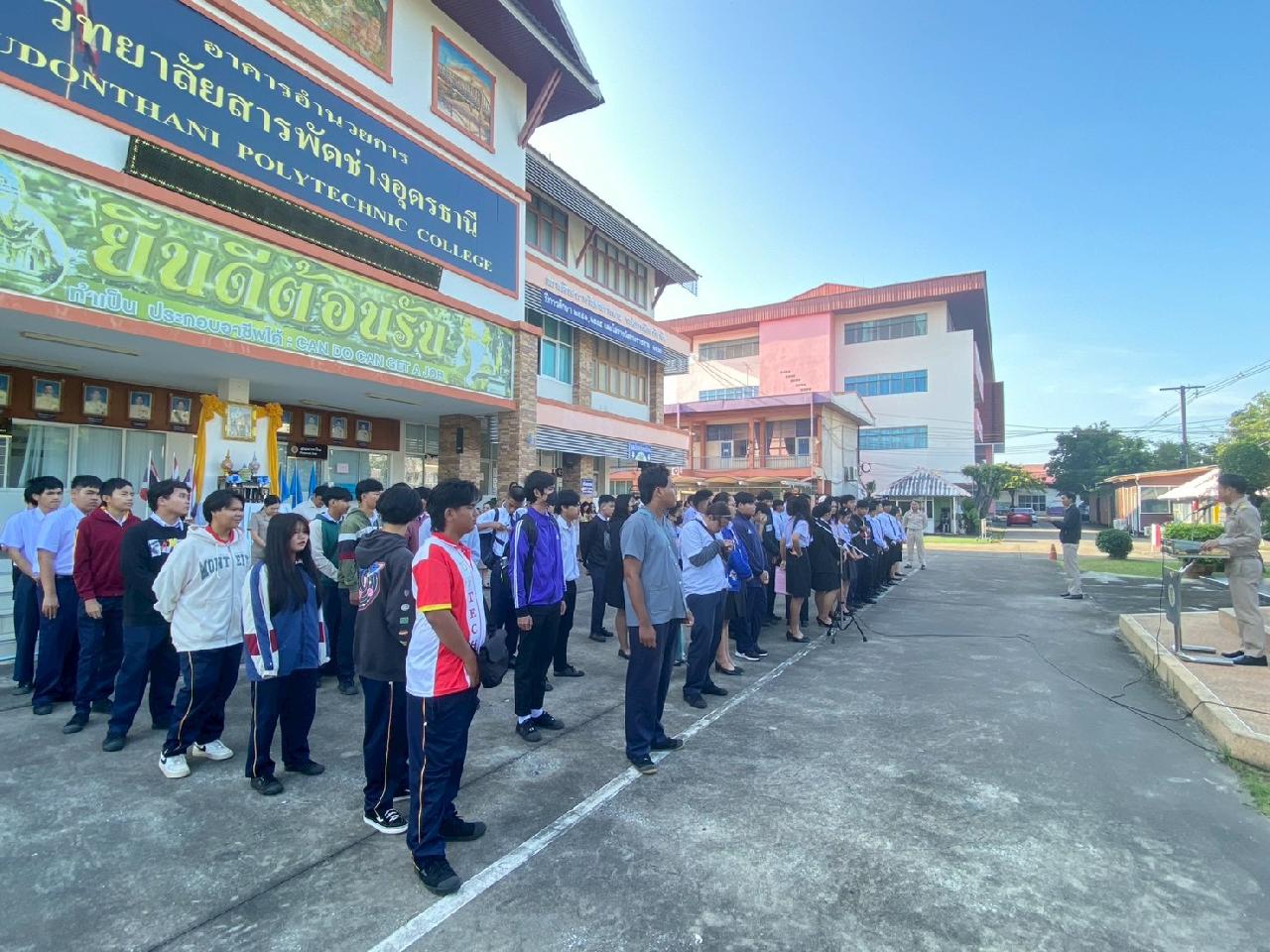 วันที่ 20 ตุลาคม 2568 นายไพฑูรย์ ธนพงศ์ภากรณ์ ผู้อำนวยการวิทยาลัยสารพัดช่างอุดรธานี กล่าวให้โอวาทหน้าเสาธงประจำภาคเรียนที่ 2/2568 แก่นักเรียน นักศึกษา และครูธนพัฒน์ อินทะสร้อย หัวหน้างานกิจกรรมฯแนะนำรองผู้อำนวยการ นายณัฐพล สิงห์แม่ง, นักศึกษาฝึกประสบการณ์วิชาชีพครู และเจ้าหน้าที่ ที่มาปฏิบัติงาน ณ วิทยาลัยสารพัดช่างอุดรธานี