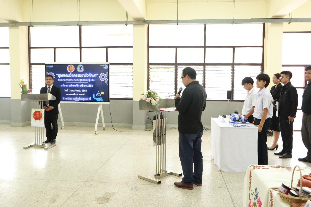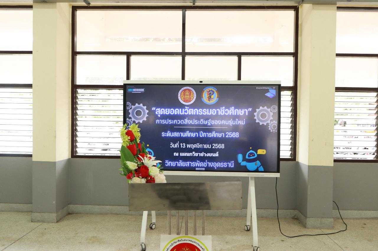 วันพฤหัสบดีที่ 13 พฤศจิกายน 2568 นายไพฑูรย์ ธนพงศ์ภากรณ์ ผู้อำนวยการวิทยาลัยสารพัดช่างอุดรธานี มอบหมายให้ นายณัฐพล สิงห์แม่ง รองผู้อำนวยการฝ่ายแผนงานและความร่วมมือ , นางยุพาวดี ศิริปีริด์ รองผู้อำนวยการฝ่ายวิชาการ พร้อมด้วย คณะครู บุคลากร นักเรียน และนักศึกษา กล่าวเปิดพิธีโครงการสุดยอดนวัตกรรมการประกวดสิ่งประดิษฐ์ของคนรุ่นใหม่ ระดับสถานศึกษา ประจำปีการศึกษา 2568 ณ แผนกวิชาช่างยนต์ วิทยาลัยสารพัดช่างอุดรธานี