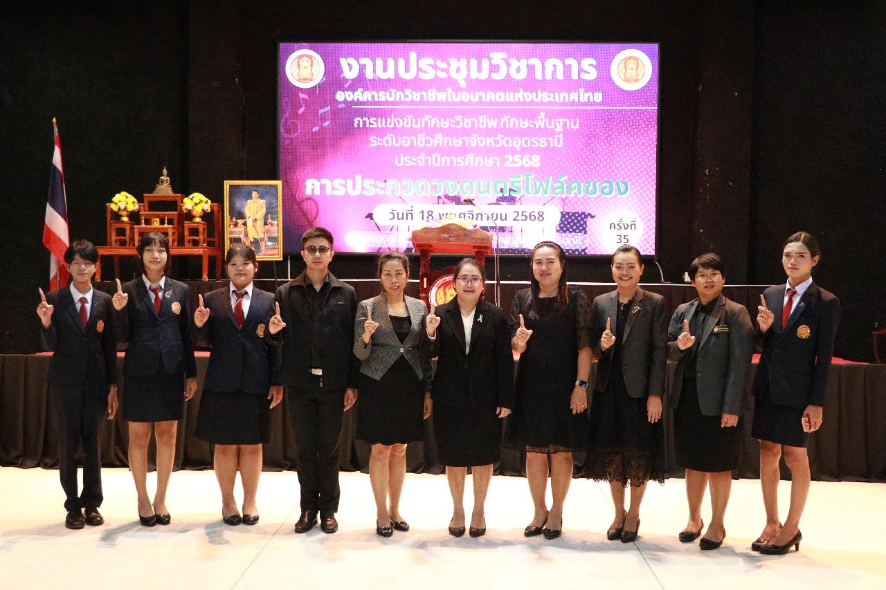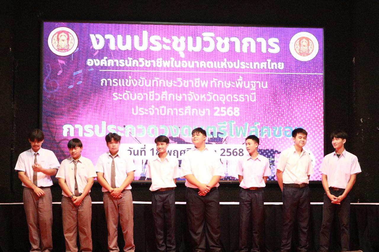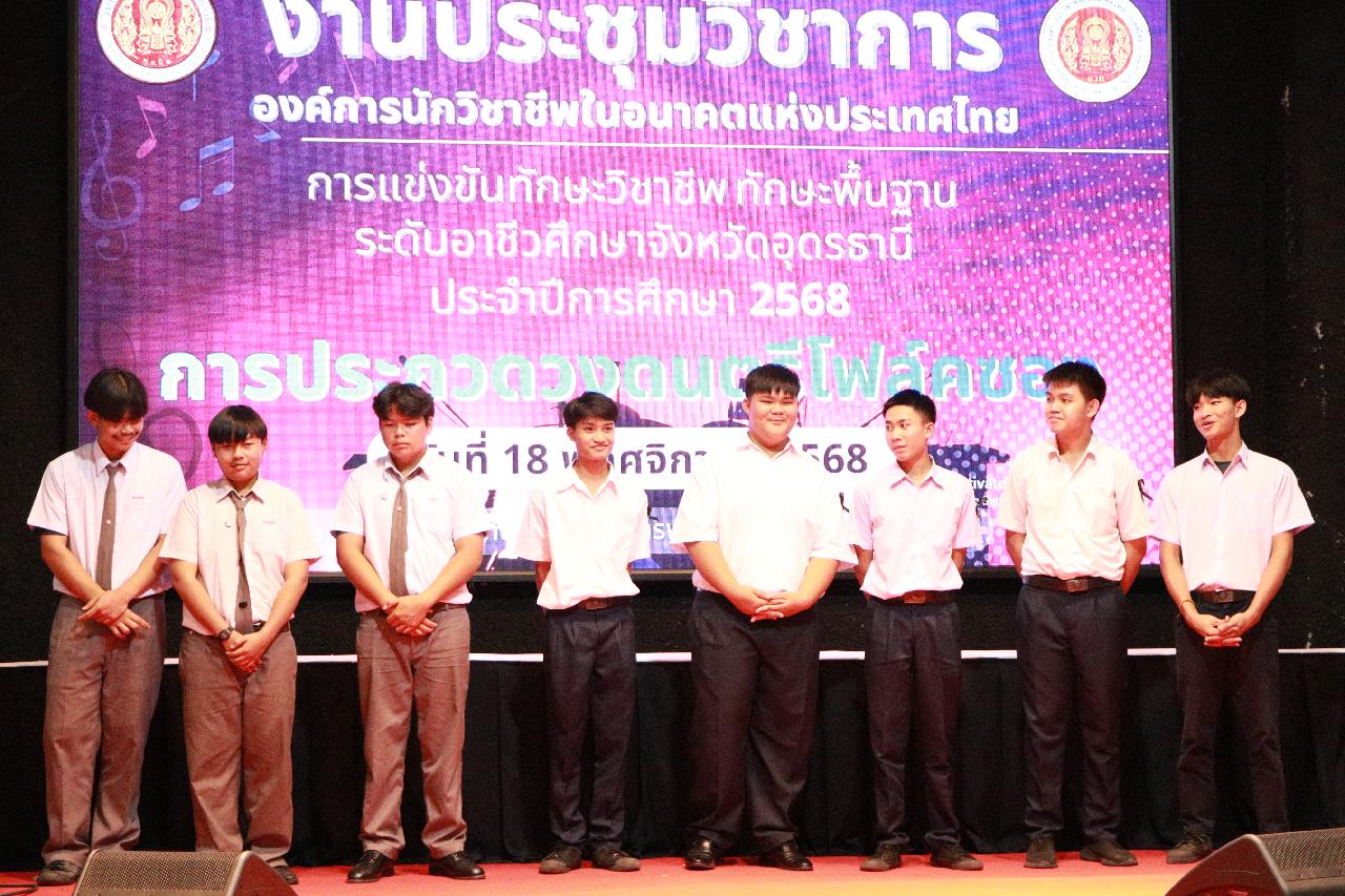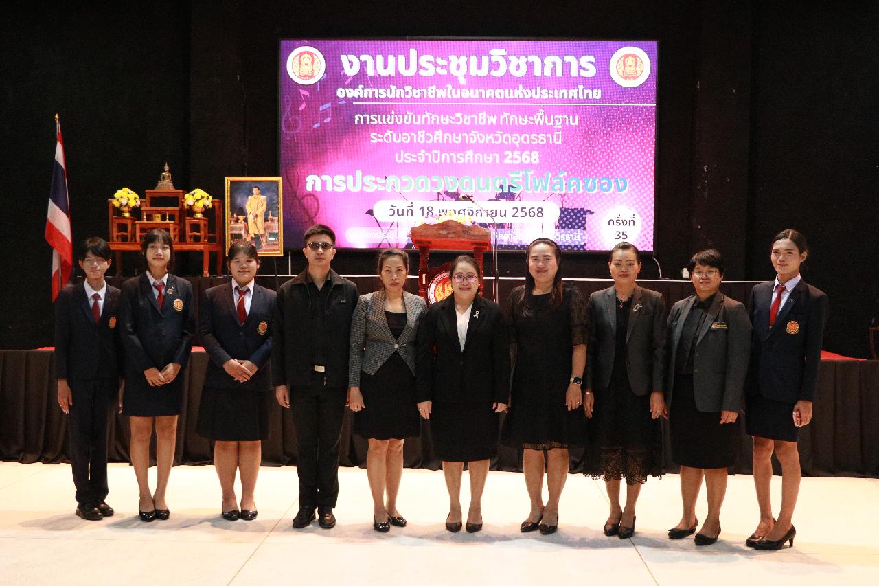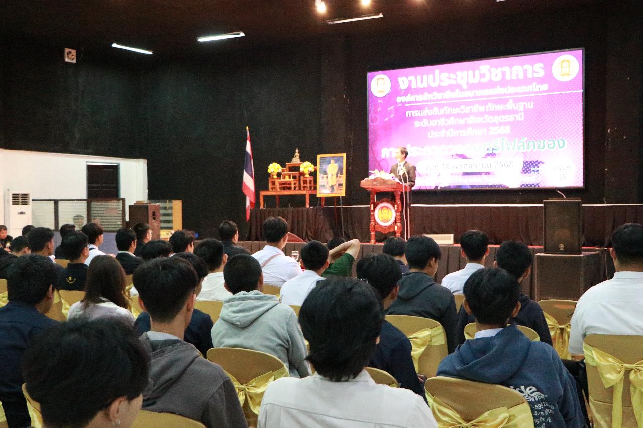 วันอังคารที่ 18 พฤศจิกายน 2568 นายไพฑูรย์ ธนพงศ์ภากรณ์ ผู้อำนวยการวิทยาลัยสารพัดช่างอุดรธานี พร้อมด้วย ว่าที่ร้อยโท อภิเดช สารคำ รองผู้อำนวยการฝ่ายบริหารทรัพยากร นางยุวดี ธรรมสุนา รองผู้อํานวยการฝ่ายพัฒนากิจการนักเรียน นายณัฐพล สิงห์แม่ง รองผู้อำนวยการฝ่ายแผนงานและความร่วมมือ และคณะครู เข้าร่วมงานประชุมวิชาการองค์การนักวิชาชีพในอนาคตแห่งประเทศไทย การแข่งขันทักษะวิชาชีพ ทักษะพื้นฐาน ระดับอาชีวศึกษาจังหวัดอุดรธานี ประจำปีการศึกษา 2568 เข้าร่วมพิธีเปิดการประกวดวงดนตรีโฟล์คซอง ณ ห้องประชุมอินทนิล ชั้น3 อาคารพัสดุ วิทยาลัยเทคนิคอุดรธานี