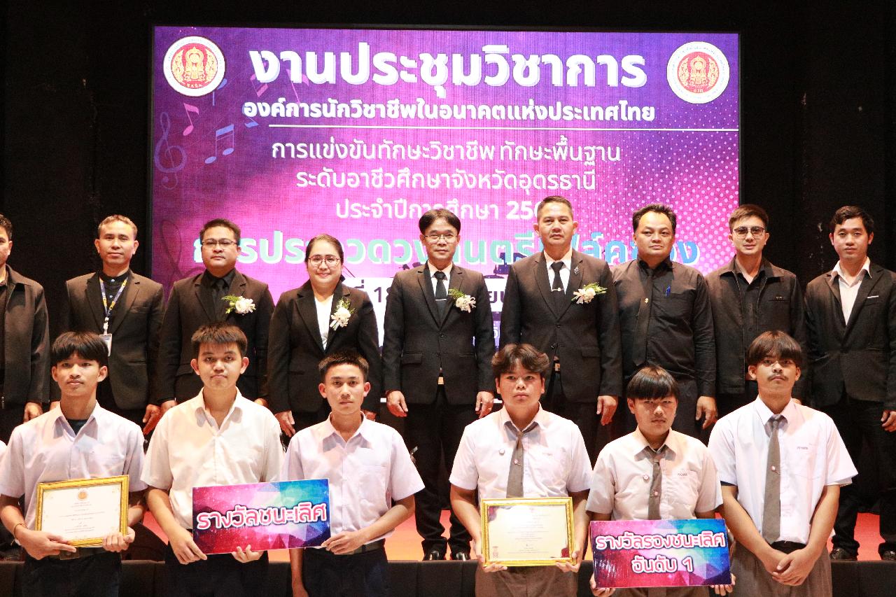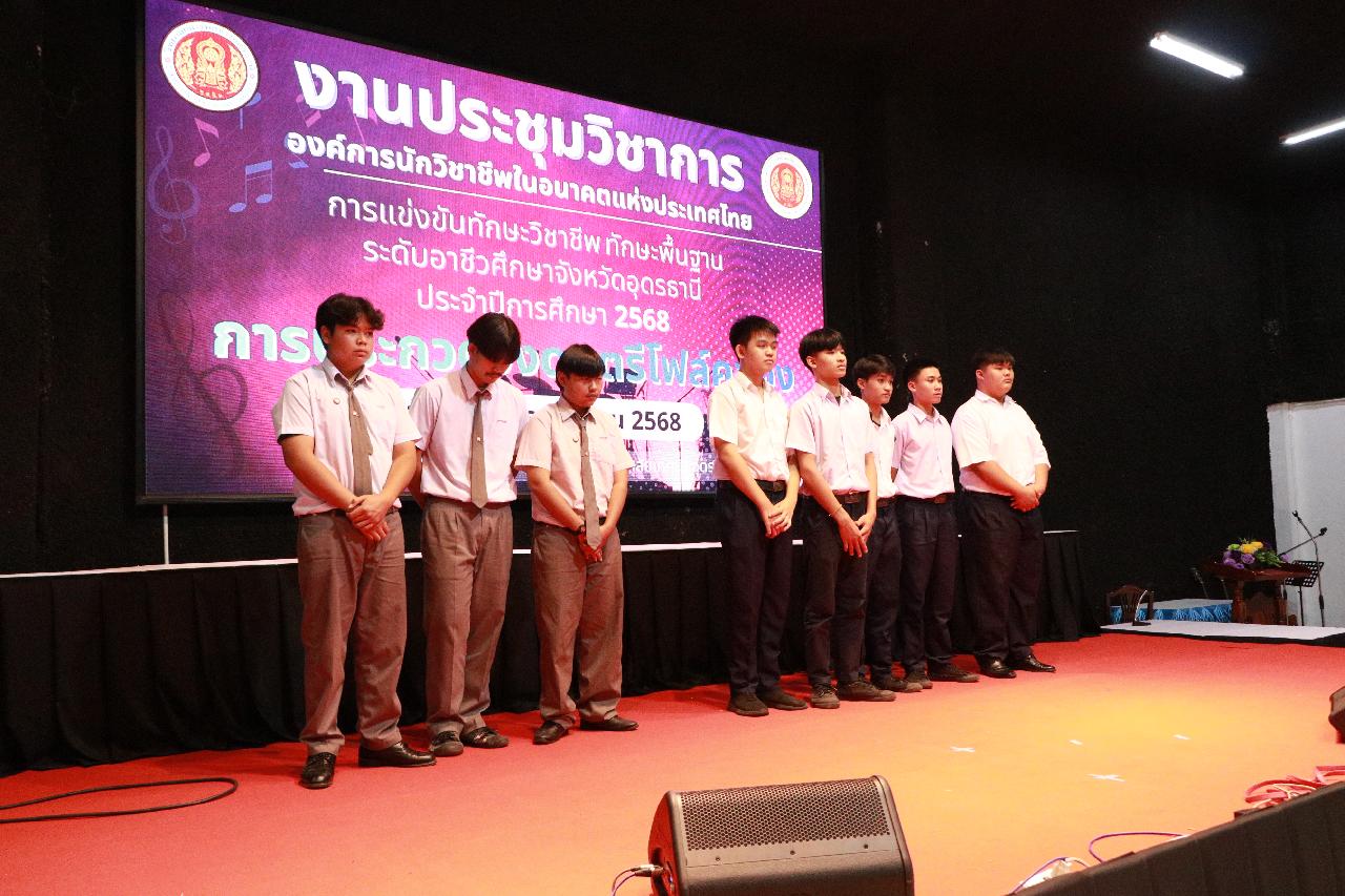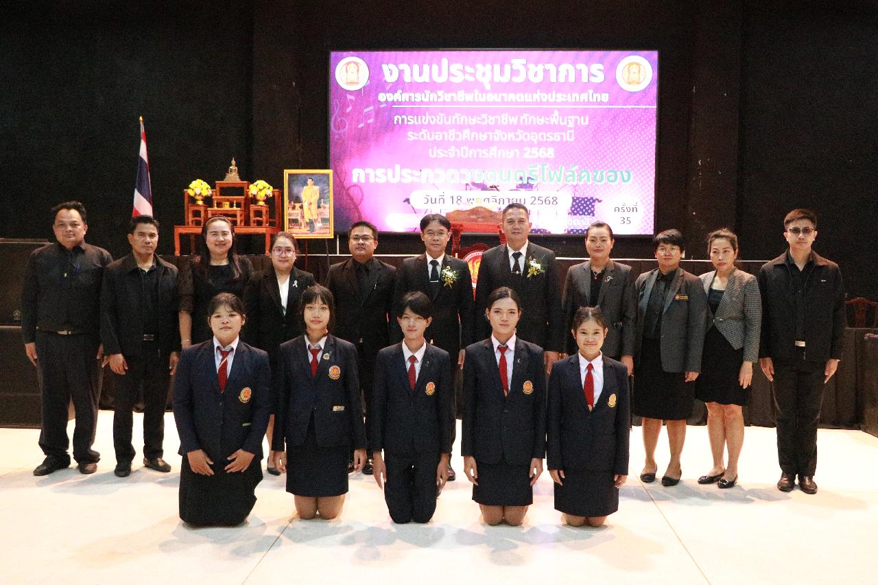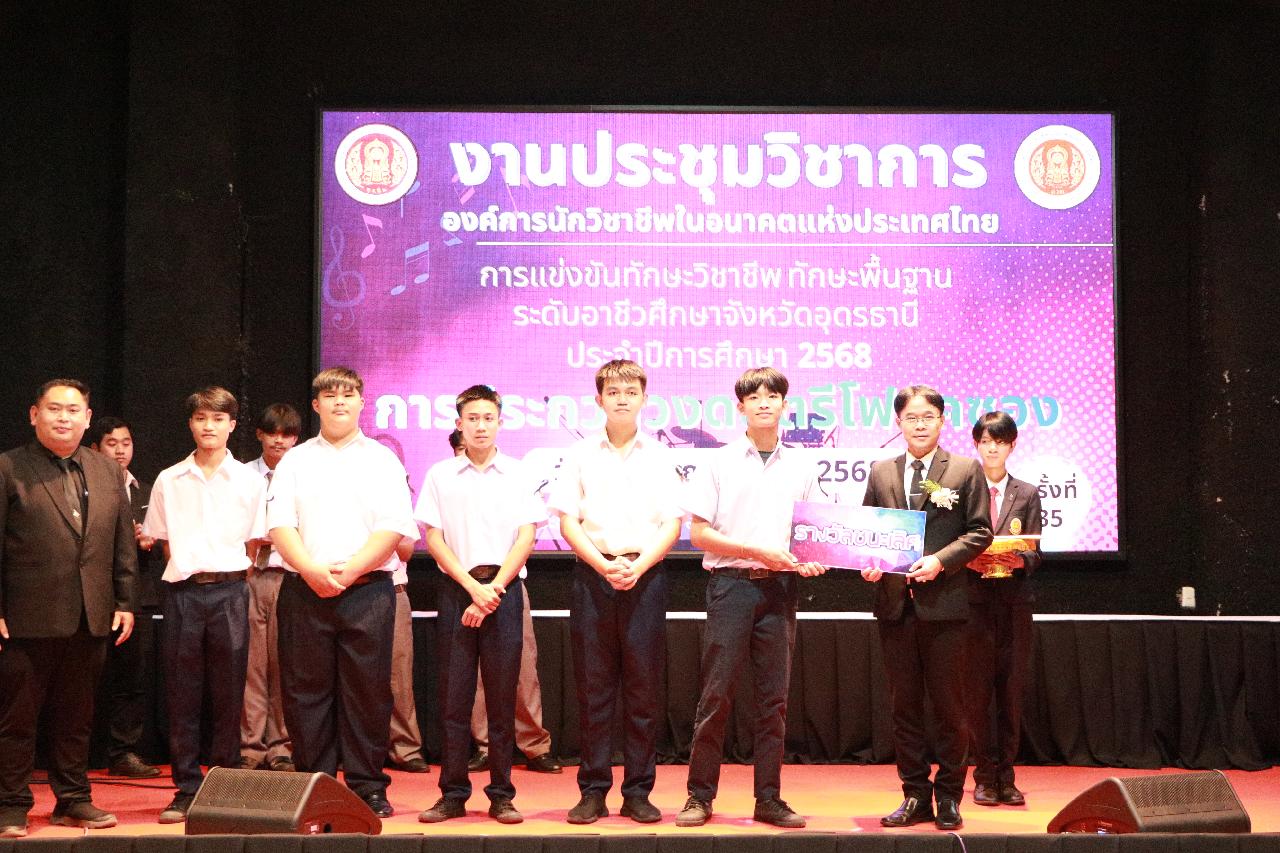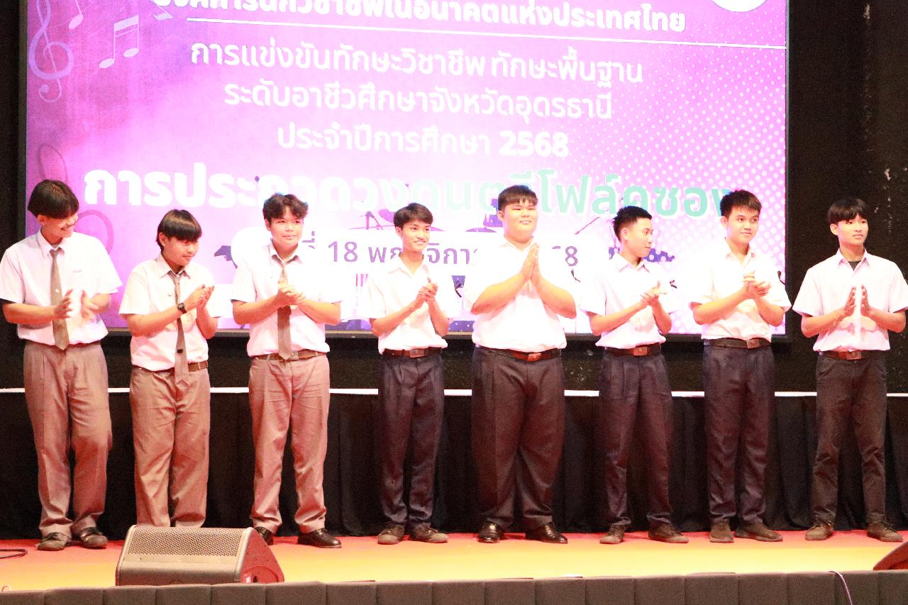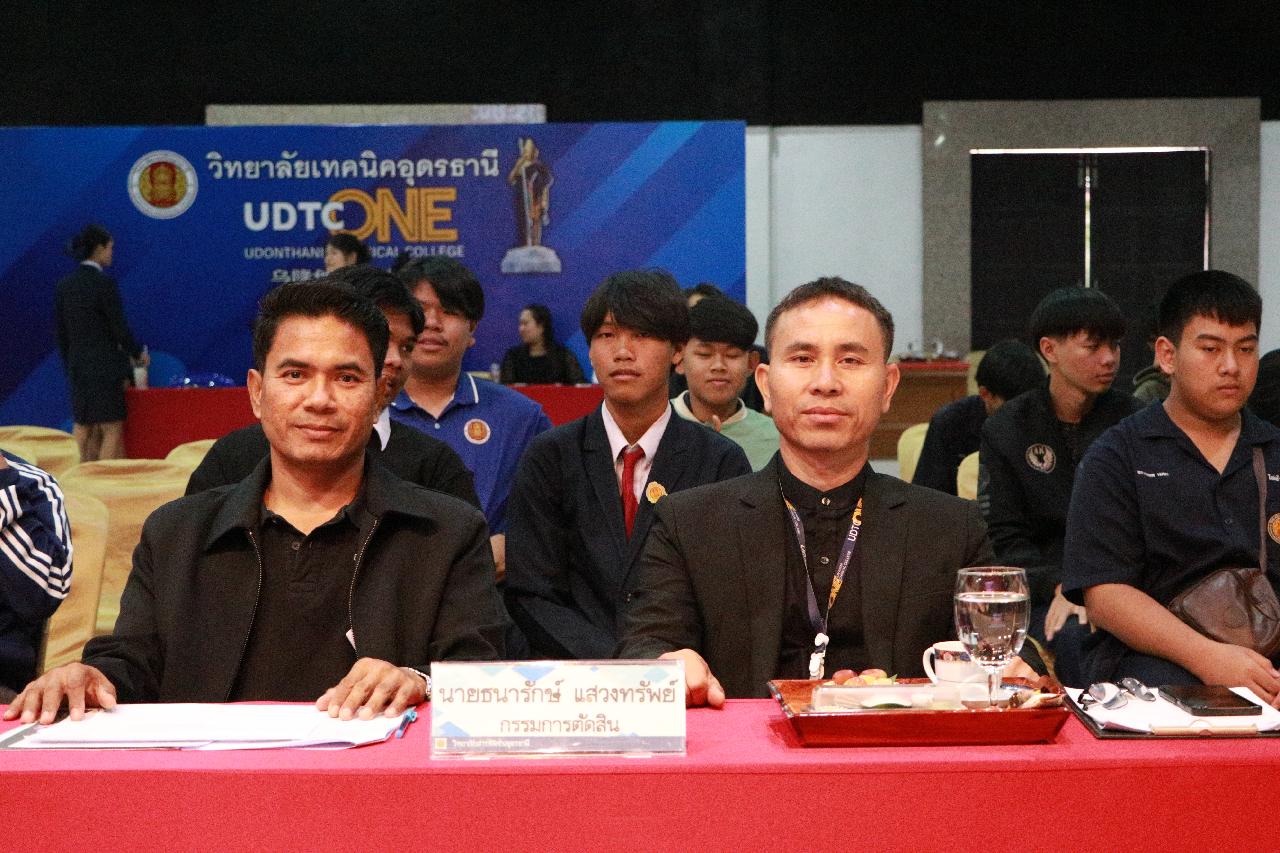 วันอังคารที่ 18 พฤศจิกายน 2568 นายไพฑูรย์ ธนพงศ์ภากรณ์ ผู้อำนวยการวิทยาลัยสารพัดช่างอุดรธานี พร้อมด้วย ว่าที่ร้อยโท อภิเดช สารคำ รองผู้อำนวยการฝ่ายบริหารทรัพยากร นางยุวดี ธรรมสุนา รองผู้อํานวยการฝ่ายพัฒนากิจการนักเรียน นายณัฐพล สิงห์แม่ง รองผู้อำนวยการฝ่ายแผนงานและความร่วมมือ และคณะครู เข้าร่วมงานประชุมวิชาการองค์การนักวิชาชีพในอนาคตแห่งประเทศไทย การแข่งขันทักษะวิชาชีพ ทักษะพื้นฐาน ระดับอาชีวศึกษาจังหวัดอุดรธานี ประจำปีการศึกษา 2568 เข้าร่วมพิธีเปิดการประกวดวงดนตรีโฟล์คซอง ณ ห้องประชุมอินทนิล ชั้น3 อาคารพัสดุ วิทยาลัยเทคนิคอุดรธานี