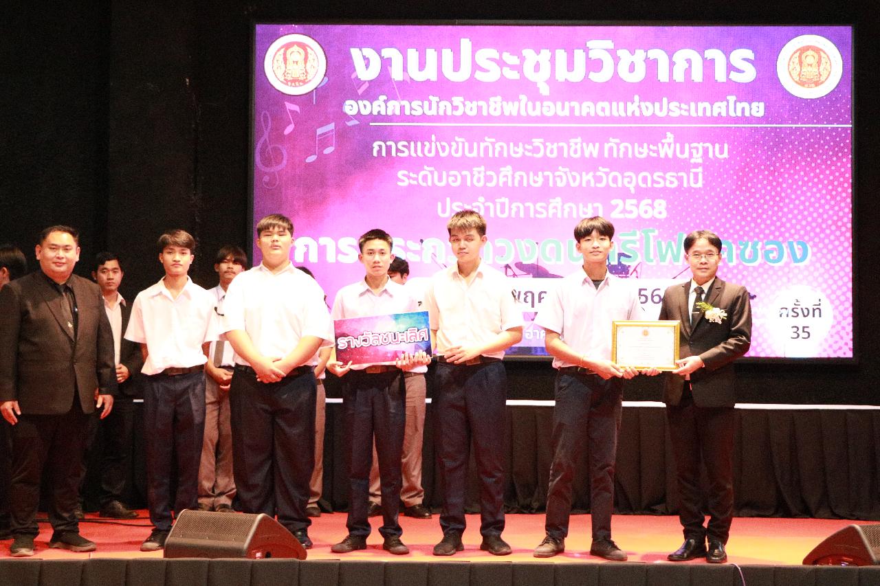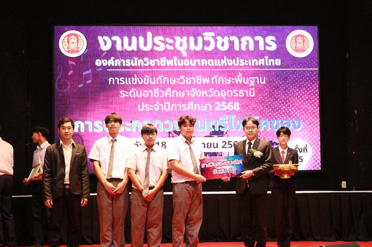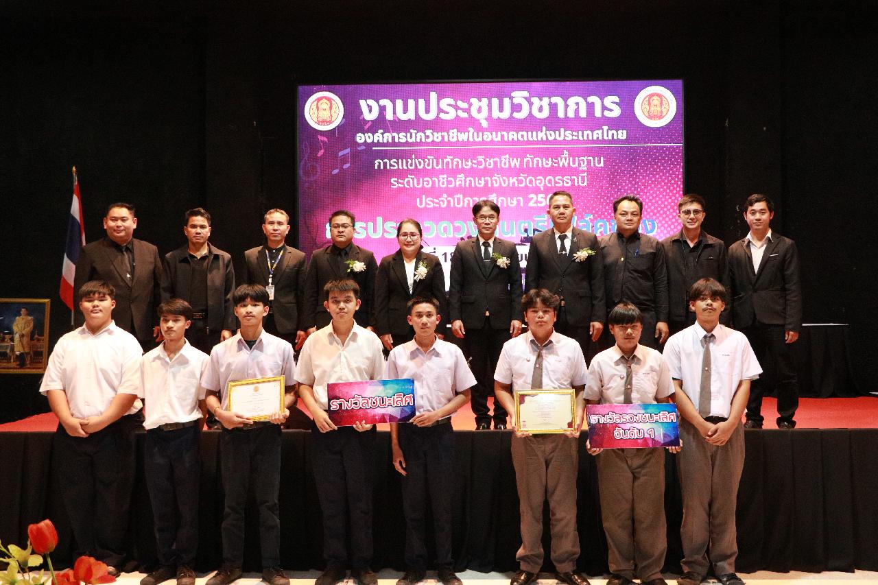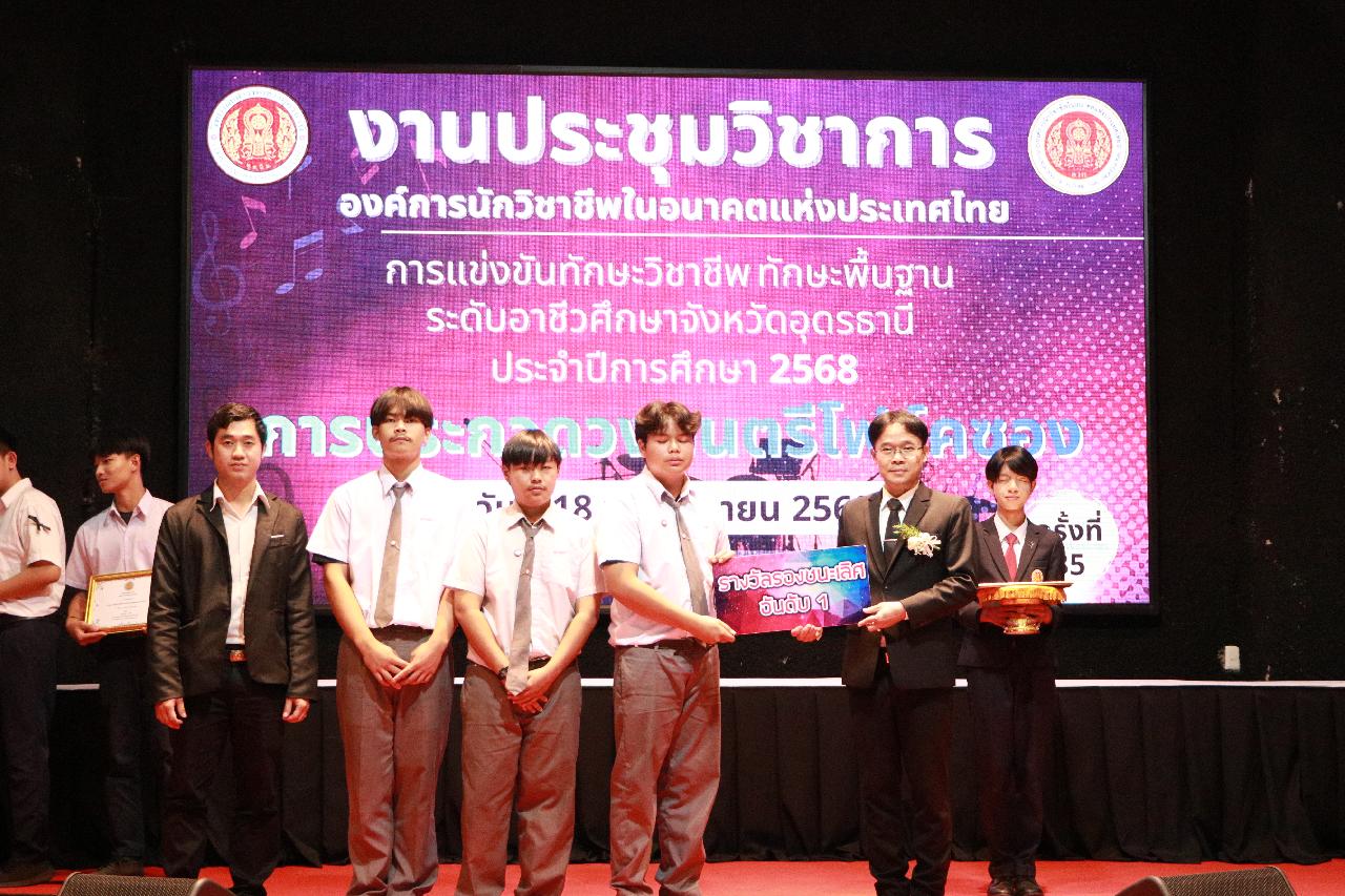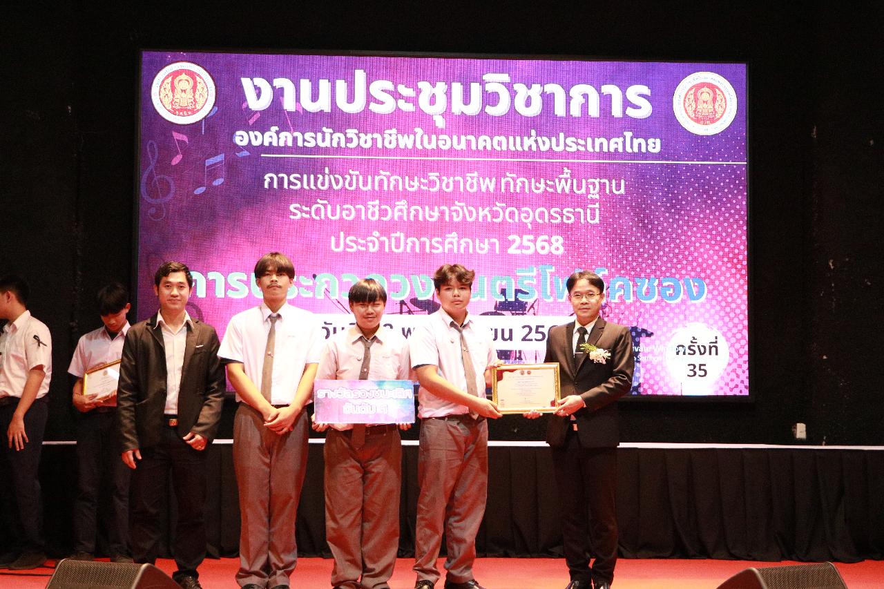 วันอังคารที่ 18 พฤศจิกายน 2568 นายไพฑูรย์ ธนพงศ์ภากรณ์ ผู้อำนวยการวิทยาลัยสารพัดช่างอุดรธานี พร้อมด้วย ว่าที่ร้อยโท อภิเดช สารคำ รองผู้อำนวยการฝ่ายบริหารทรัพยากร นางยุวดี ธรรมสุนา รองผู้อํานวยการฝ่ายพัฒนากิจการนักเรียน นายณัฐพล สิงห์แม่ง รองผู้อำนวยการฝ่ายแผนงานและความร่วมมือ และคณะครู เข้าร่วมงานประชุมวิชาการองค์การนักวิชาชีพในอนาคตแห่งประเทศไทย การแข่งขันทักษะวิชาชีพ ทักษะพื้นฐาน ระดับอาชีวศึกษาจังหวัดอุดรธานี ประจำปีการศึกษา 2568 เข้าร่วมพิธีเปิดการประกวดวงดนตรีโฟล์คซอง ณ ห้องประชุมอินทนิล ชั้น3 อาคารพัสดุ วิทยาลัยเทคนิคอุดรธานี