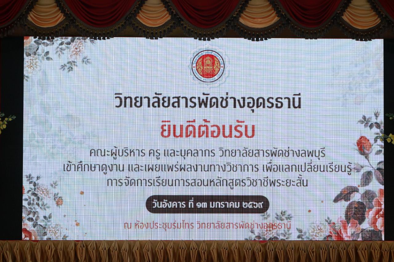 วันอังคารที่ 13 มกราคม 2569 นายไพฑูรย์ ธนพงศ์ภากรณ์ ผู้อำนวยการวิทยาลัยสารพัดช่างอุดรธานี มอบหมายให้ ว่าที่ร้อยโท อภิเดช สารคำ รองผู้อำนวยการฝ่ายบริหารทรัพยากร นายณัฐพล สิงห์แม่ง รองผู้อำนวยการฝ่ายแผนงานและความร่วมมือ หัวหน้าแผนกและครู ต้อนรับคณะผู้บริการ ครู และบุคลากร วิทยาลัยสารพัดช่างลพบุรี เข้าศึกษาดูงาน และเผยแพถร่ผลงานทางวิชาการ เพื่อแลกเปลี่ยนเรียนรู้การจัดการเรียนการสอนหลักสูตรวิชาชีพระยะสั้น ณ ห้องประชุมร่มไทร ชั้น 3 วิทยาลัยสารพัดช่างอุดรธานี