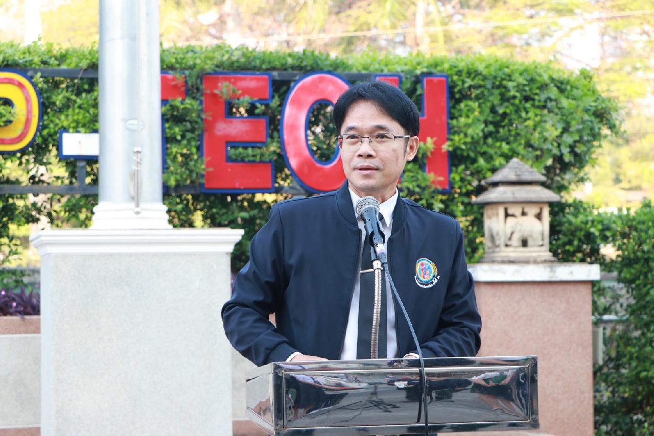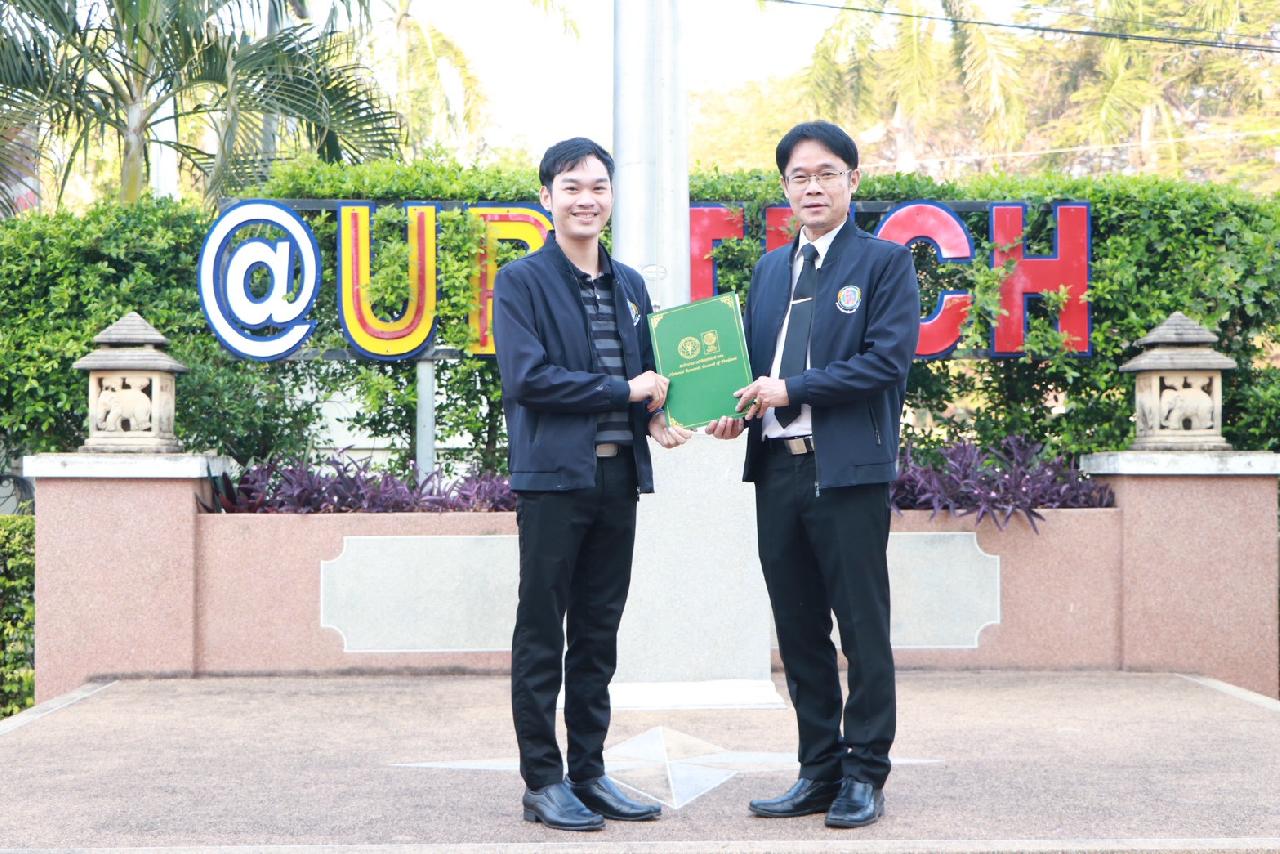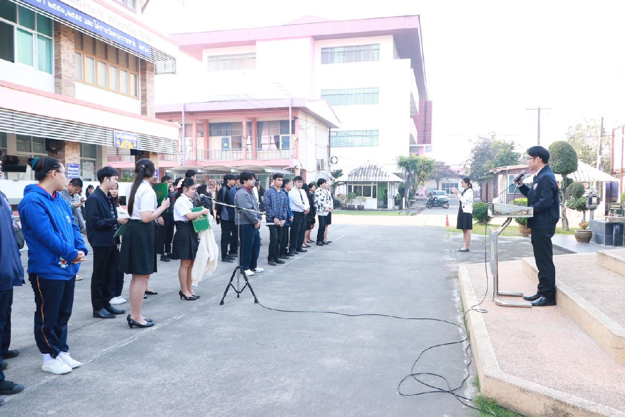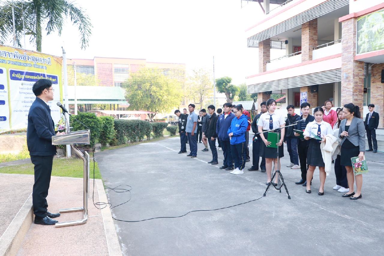 วันพฤหัสบดีที่ 15 มกราคม 2569 นายไพฑูรย์ ธนพงศ์ภากรณ์ ผู้อำนวยการวิทยาลัยสารพัดช่างอุดรธานี พร้อมด้วยคณะผู้บริหาร ครู บุคลากร และนักเรียน นักศึกษา เข้าร่วมพิธีมอบเกียรติบัตรโครงการประกวดสิ่งประดิษฐ์และนวัตกรรมระดับอาชีวศึกษา ประจำปีการศึกษา 2568 โครงการประกวดสิ่งประดิษฐ์และนวัตกรรมระดับเยาวชน “Thailand New Gen Inventors Award 2026” (I - New Gen Award 2026) ระดับอาชีวศึกษา กลุ่มเรื่องการท่องเที่ยวและเศรษฐกิจสร้างสรรค์ ผลงานประดิษฐ์เรื่อง ”เอิ้นขวัญ“ ได้รับรางวัลเหรียญเงิน ระดับชาติ พร้อมทั้งให้โอวาทแก่นักเรียน นักศึกษา ณ บริเวณหน้าเสาธง วิทยาลัยสารพัดช่างอุดรธานี