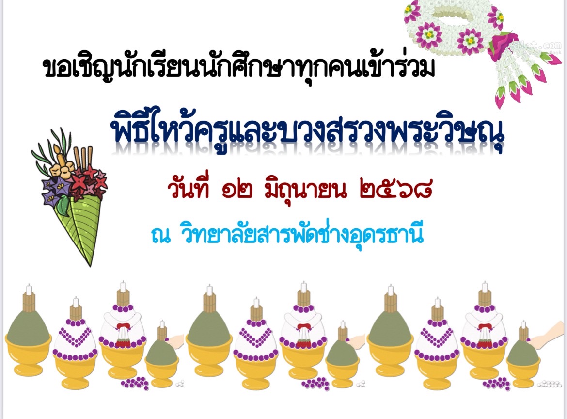 ขอเชิญนักเรียน นักศึกษาทุกคนเข้าร่วมพิธีไหว้ครูและบวงสรวงพระวิษณุ ในวันที่ 12 มิถุนายน 2568 ณ วิทยาลัยสารพัดช่างอุดรธานี ..