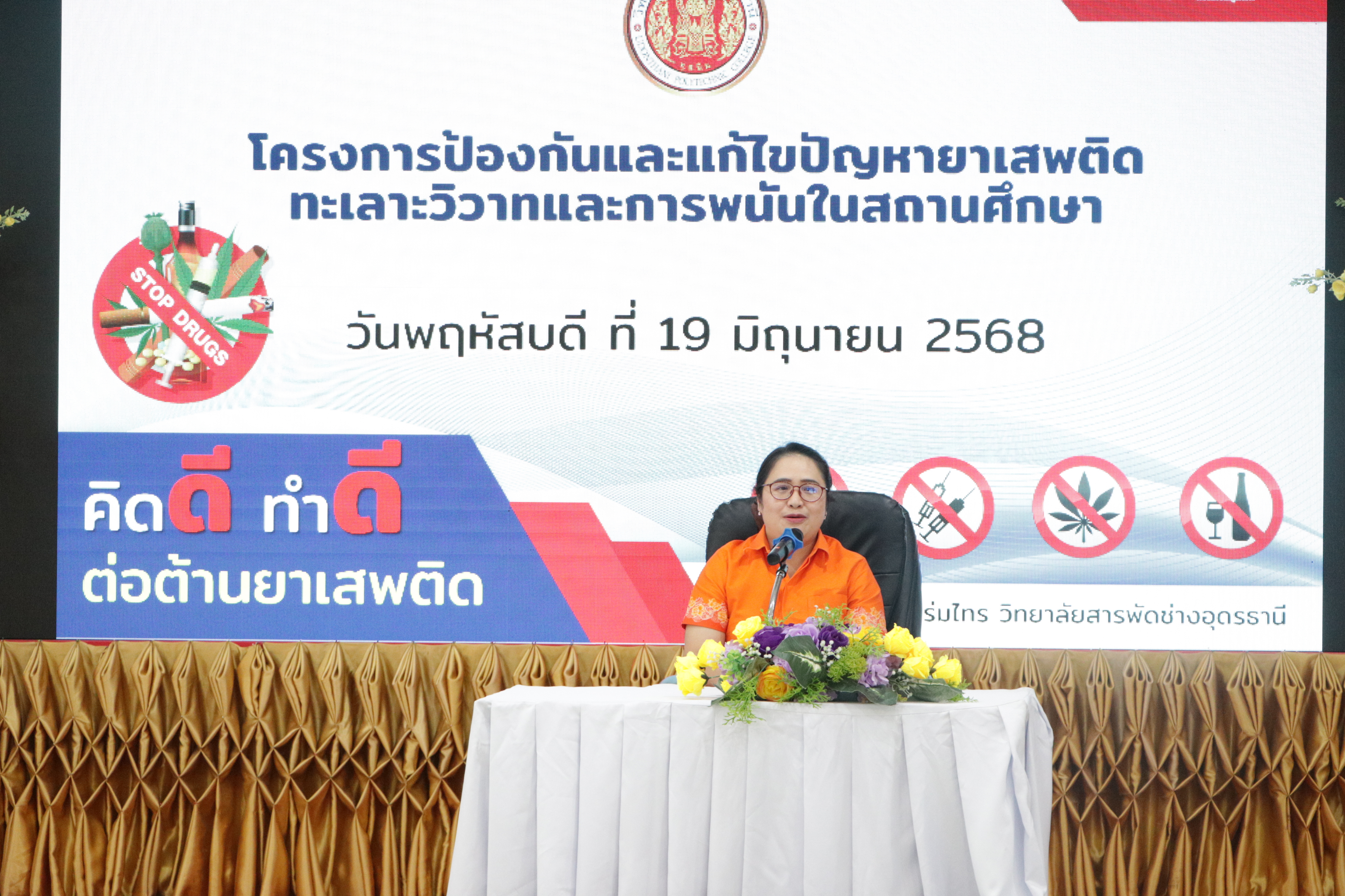 วันพฤหัสบดี ที่ 19 มิถุนายน 2568 นายไพฑูรย์ ธนพงศ์ภากรณ์ ผู้อำนวยการวิทยาลัยสารพัดช่างอุดรธานี พร้อมด้วย คณะผู้บริหาร, คณะครู, บุคลากรทางการศึกษา และนักเรียนนักศึกษา เข้าร่วมโครงการป้องกันและแก้ไขปัญหายาเสพติดทะเลาะวิวาทและการพนันในสถานศึกษา ณ ห้องประชุมร่มไทร ชั้น 3 อาคารอำนวยการ วิทยาลั..