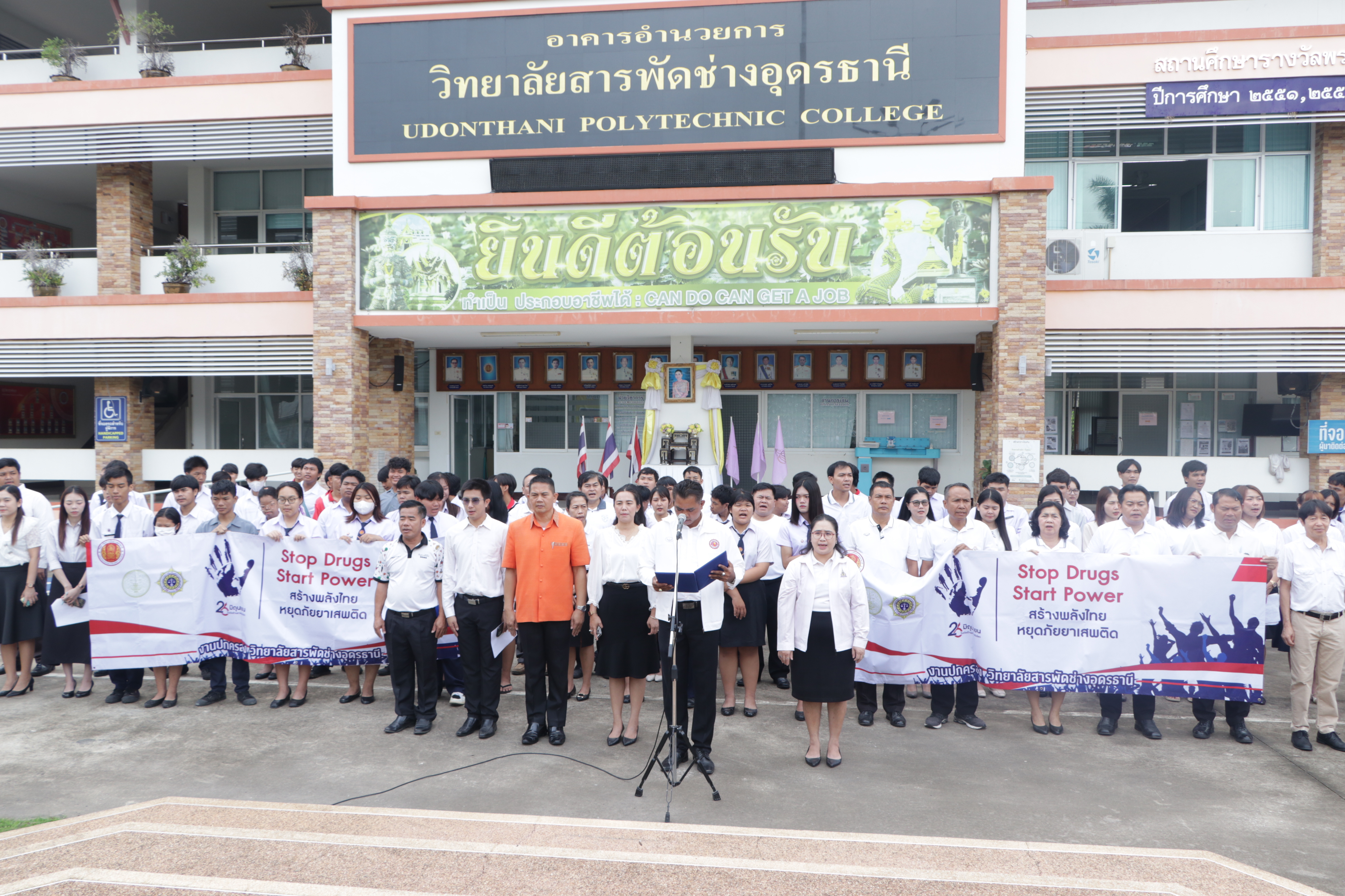 วันพฤหัสบดี ที่ 26 มิถุนายน 2568 นายไพฑูรย์ ธนพงศ์ภากรณ์ ผู้อำนวยการวิทยาลัยสารพัดช่างอุดรธานี มอบหมายให้ นายสุรสิทธิ์ ดรละคร รองผู้อำนวยการฝ่ายพัฒนากิจการนักเรียน นักศึกษา, คณะผู้บริหาร, คณะครู, บุคลากรทางการศึกษา และนักเรียนนักศึกษา ร่วมกิจกรรมรณรงค์ประชาสัมพันธ์เนื่องในวันต่อต้านยาเสพติดโลก (26 ม..