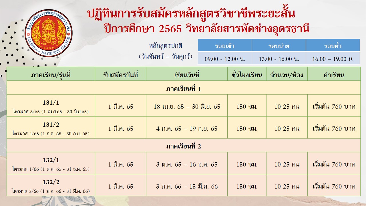 ปฏิทินการรับสมัครหลักสูตรวิชาชีพระยะสั้น ปีการศึกษา 2565..