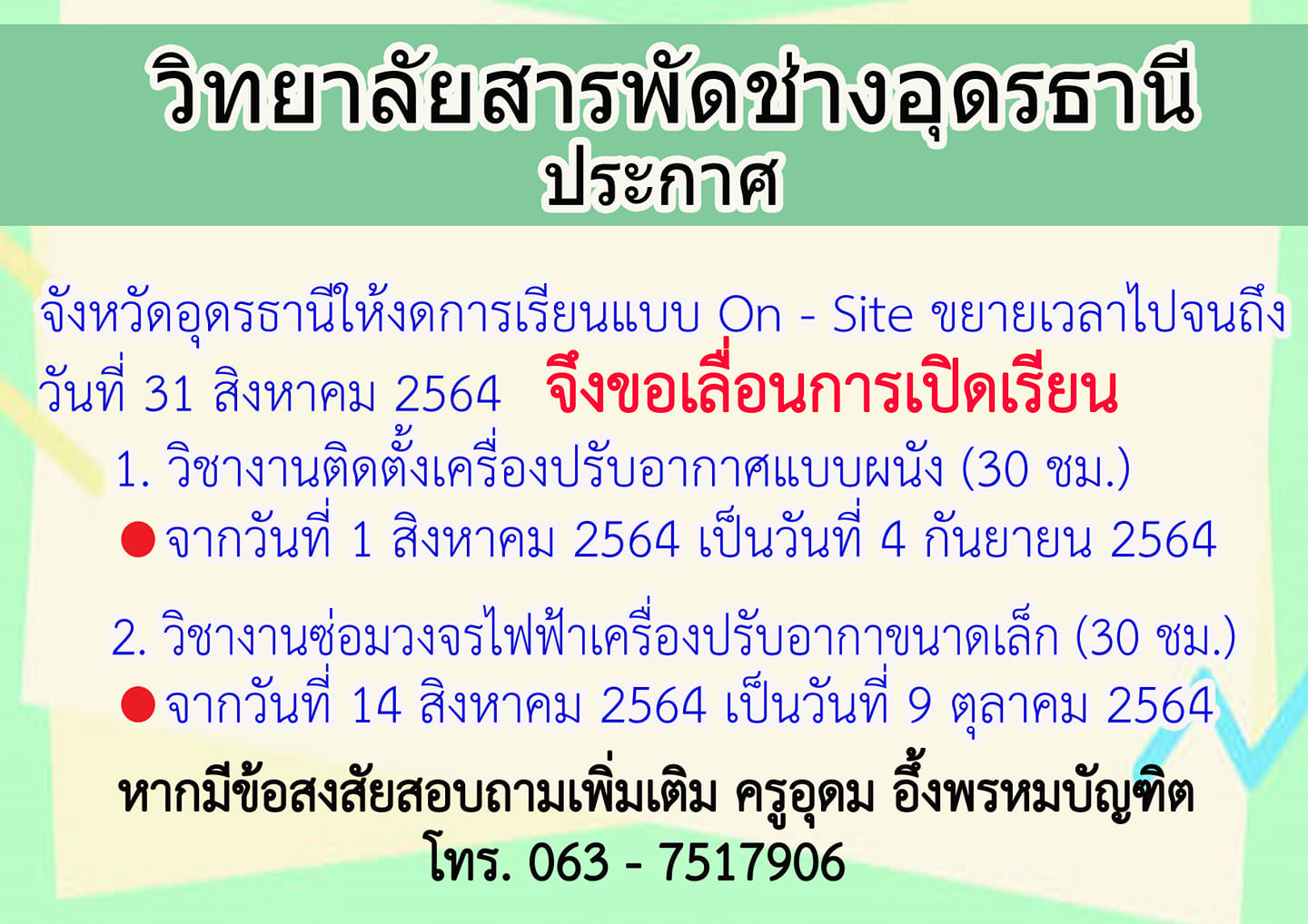 แจ้งเลื่อนการเปิดเรียนหลักสูตรวิชาชีพระยะสั้น
