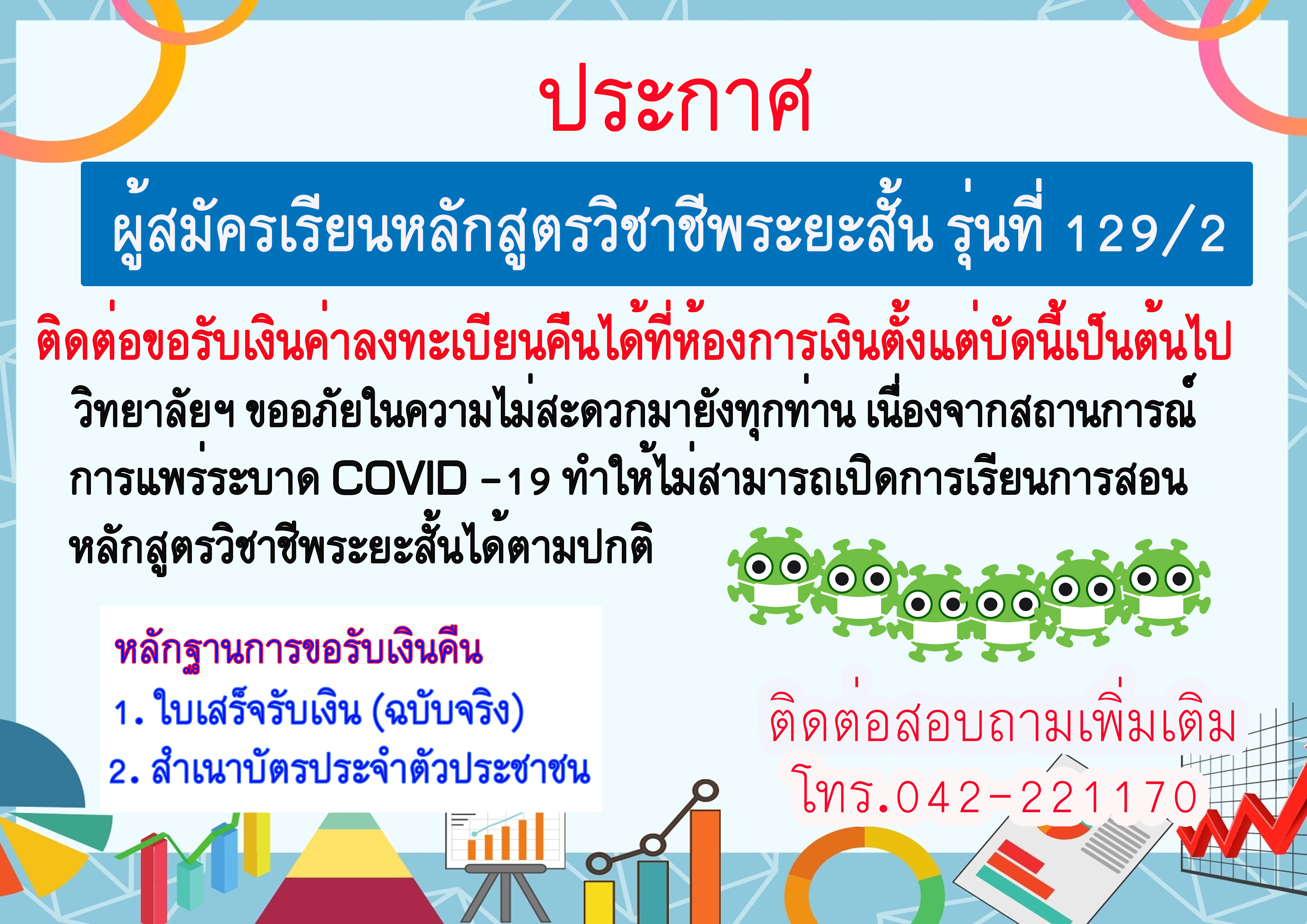 ผู้สมัครเรียนหลักสูตรวิชาชีพระยะสั้น รุ่นที่ 129/2 สามารถติดต่อขอรับค่าลงทะเบียนคืนได้ ณ ห้องการเงินตั้งแต่บัดนี้เป็นต้นไป ..