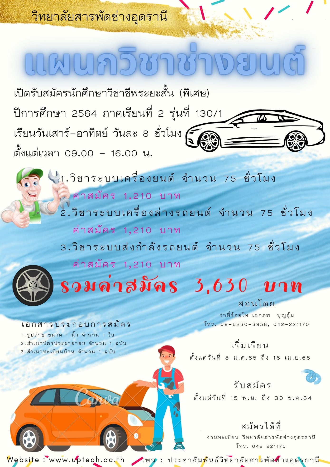 แผนกวิชาช่างยนต์ เปิดรับนักศึกษาหลักสูตรวิชาชีพระยะสั้น แบบพิเศษ รุ่นที่ 130/1 เรียนวันเสาร์-อาทิตย์ เรียนกับครูเอกภพ บุญอุ้ม โทร.086-2303958 ..