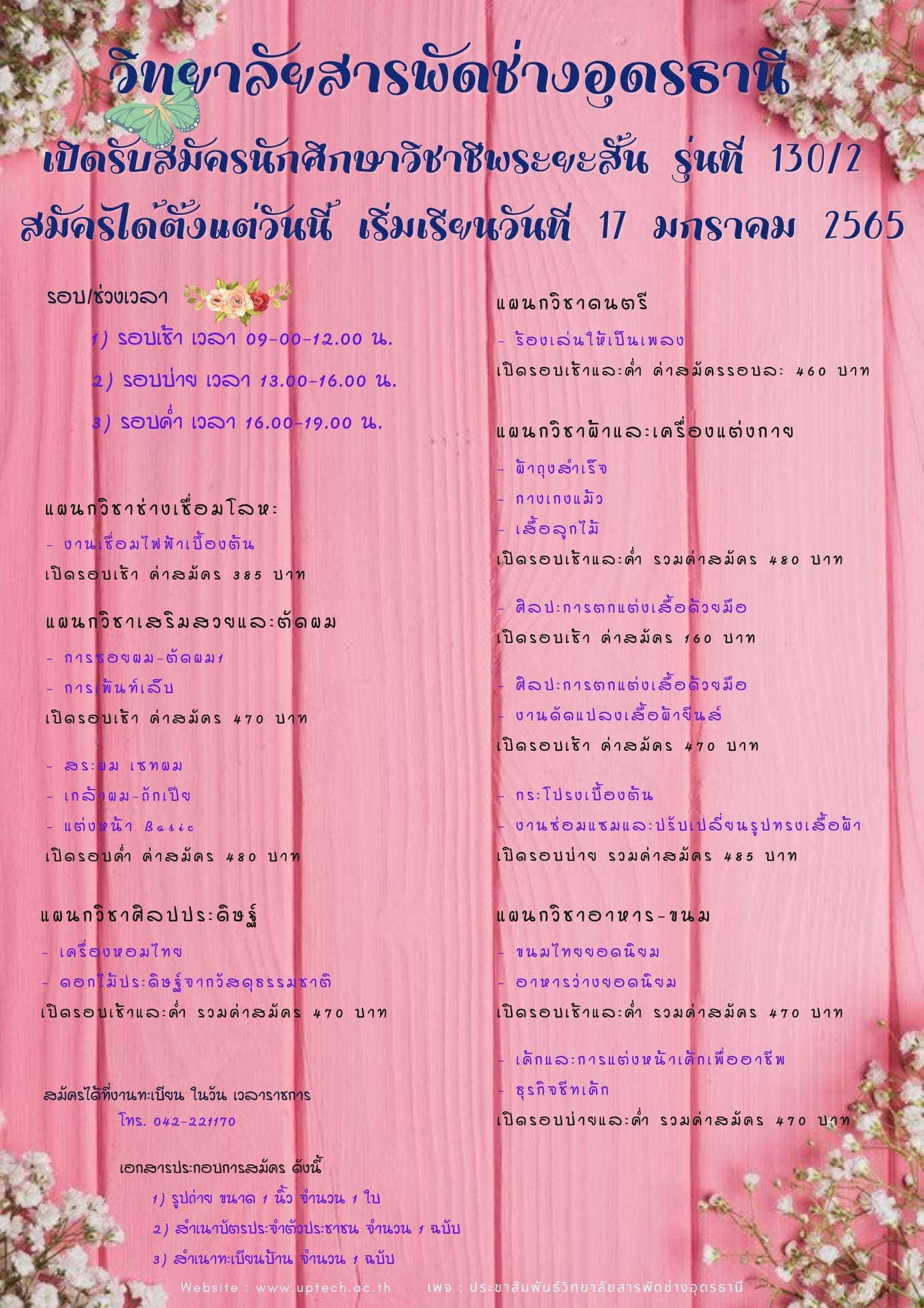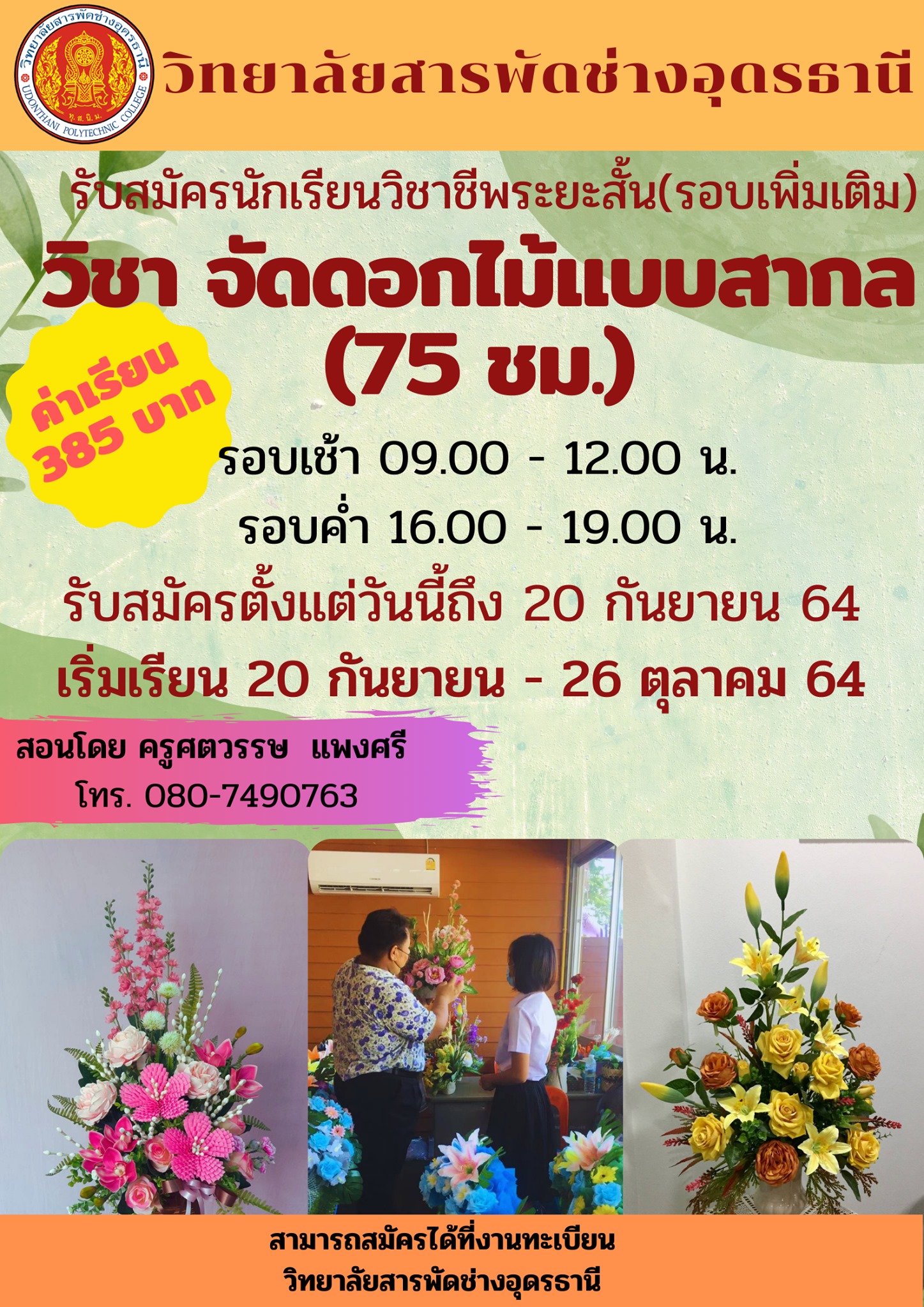 รับสมัครนักศึกษาวิชาชีพระยะสั้น วิชาจัดดอกไม้แบบสากล สมัครกันได้เลยนะคะ หรือสามารถสอบถามเพิ่มเติมตามเบอร์โทรที่ให้ไว้ ......
