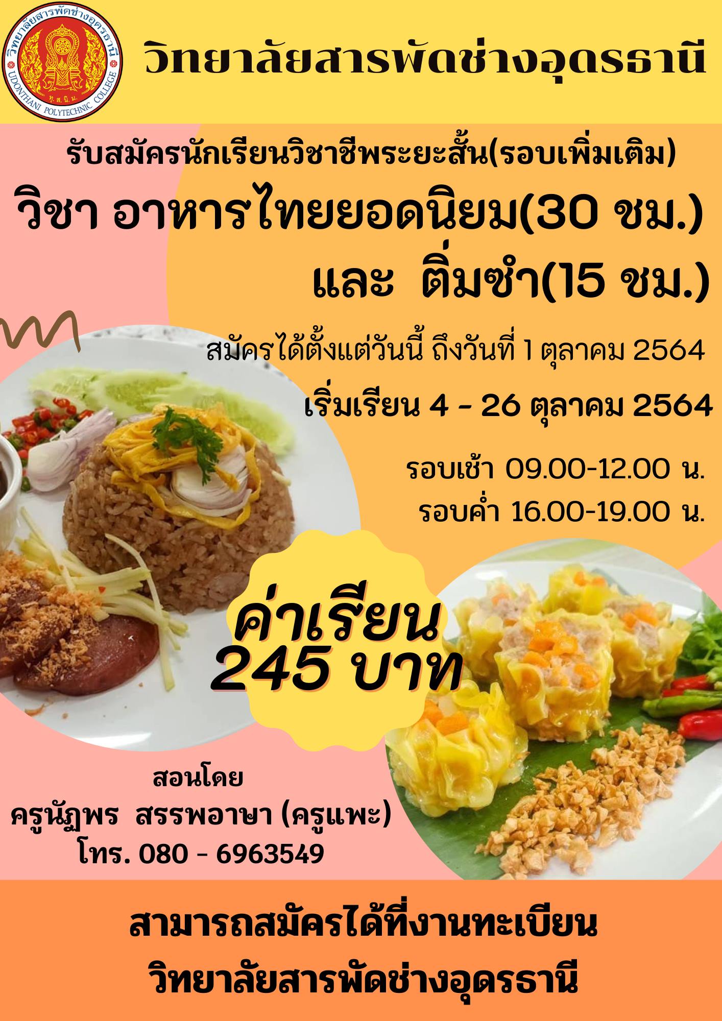 รับสมัครนักศึกษาวิชาชีพระยะสั้น วิชาอาหารไทยยอดนิยม สมัครกันได้เลยนะคะ หรือสามารถสอบถามเพิ่มเติมตามเบอร์โทรที่ให้ไว้ .... .. ..