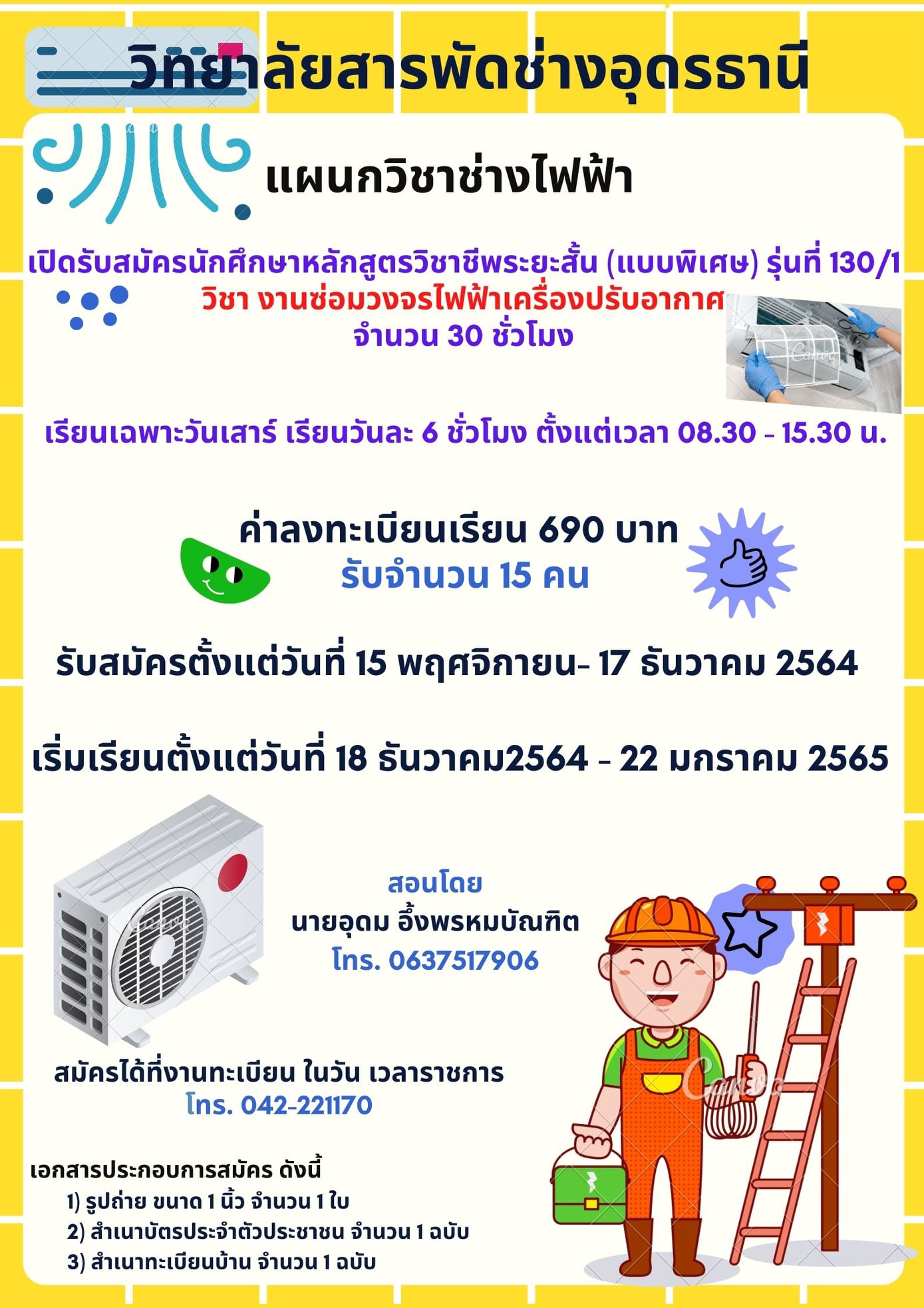 รับสมัครนักศึกษาวิชาชีพระยะสั้น วิชางานซ่อมวงจรไฟฟ้าเครื่องปรับอากาศ สมัครกันได้เลยนะคะ หรือสามารถสอบถามเพิ่มเติมตามเบอร์โทรที่ให้ไว้... ..