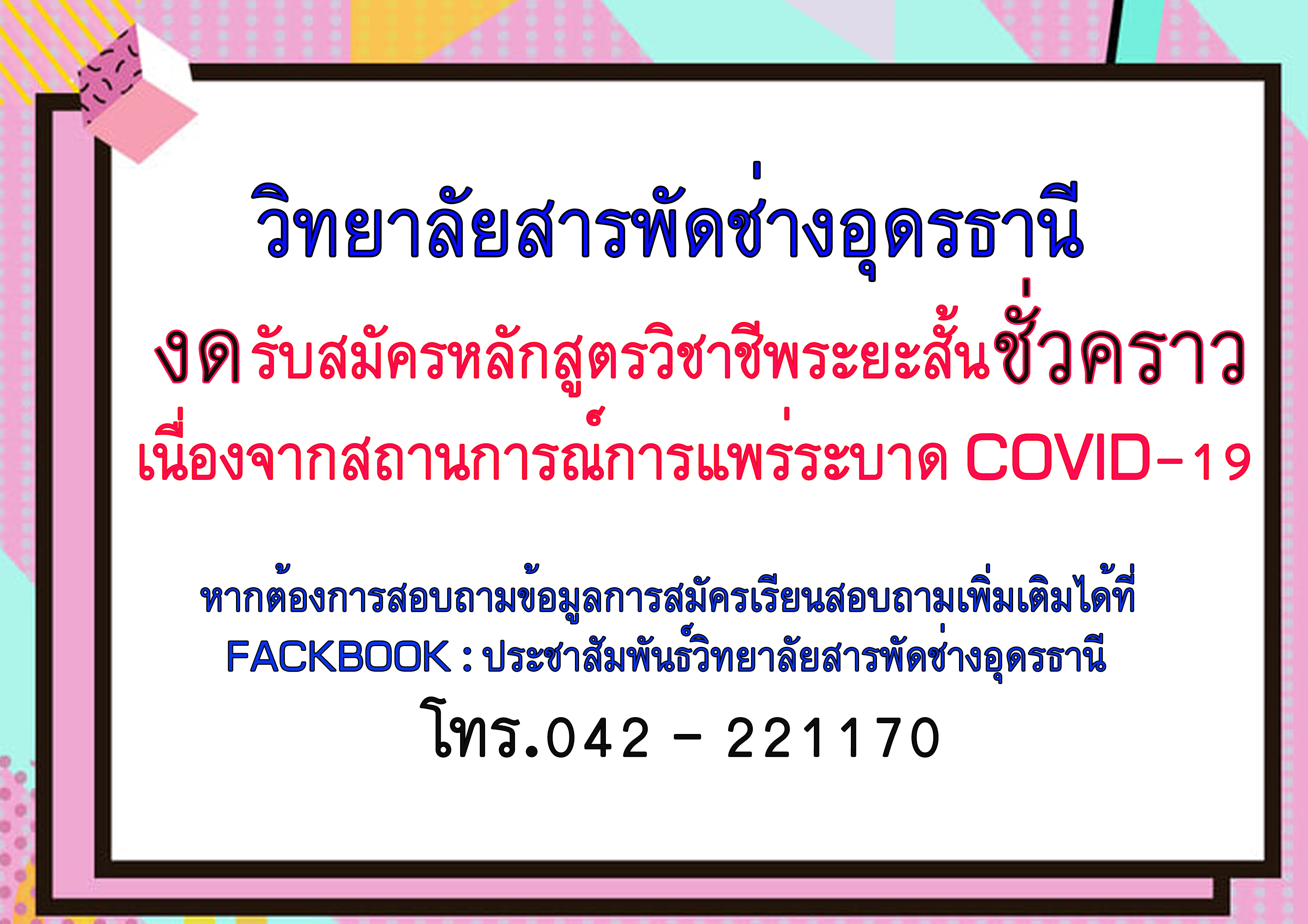 งดรับสมัครหลักสูตรวิชาชีพระยะสั้นชั่วคราว เนื่องจากสถานการณ์การแพร่ระบาด COVID-19..