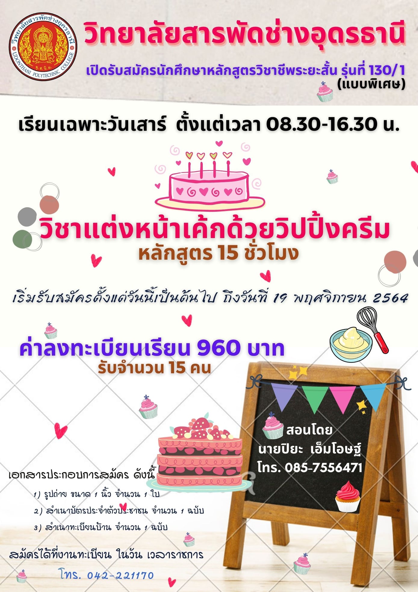 รับสมัครนักศึกษาวิชาชีพระยะสั้น วิชาแต่งหน้าเค้กด้วยวิปปิ้งครีม สมัครกันได้เลยนะคะ หรือสามารถสอบถามเพิ่มเติมตามเบอร์โทรที่ให้ไว้ .... ..