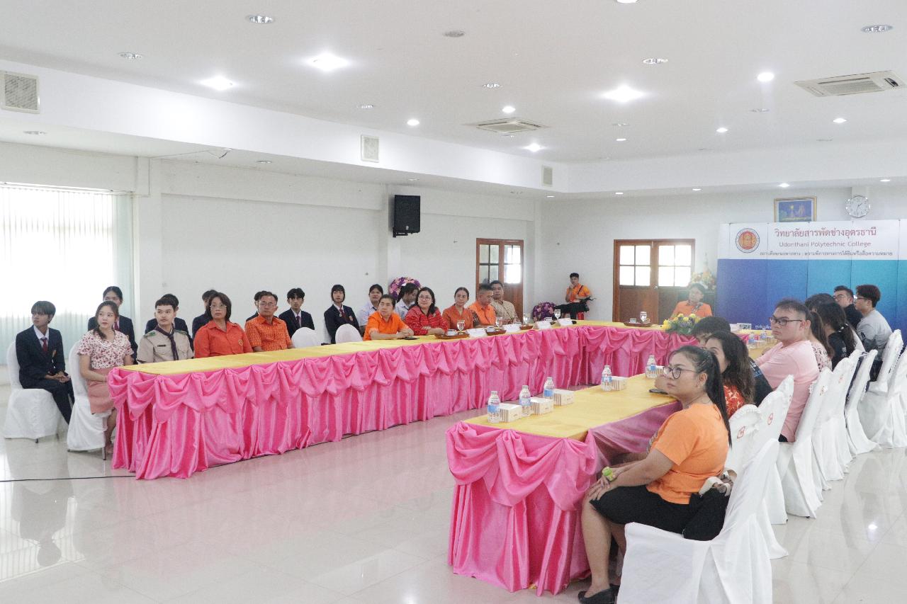 วันพฤหัสบดี ที่ 14 สิงหาคม 2568 นายไพฑูรย์ ธนพงศ์ภากรณ์ ผู้อำนวยการวิทยาลัยสารพัดช่างอุดรธานี พร้อมด้วย คณะผู้บริหาร คณะครู และบุคลากรทางการศึกษา เข้าร่วมต้อนรับคณะศึกษาดูงานจากวิทยาลัยอาชีวศึกษาทรัพยากรน้ำ และไฟฟ้าพลังน้ำกุ้ยโจว ณ ห้องประชุมร่มไทร ชั้น 3 อาคารอำนวยการ และห้องสมุด วิทยาลัยสารพัดช่างอุดร