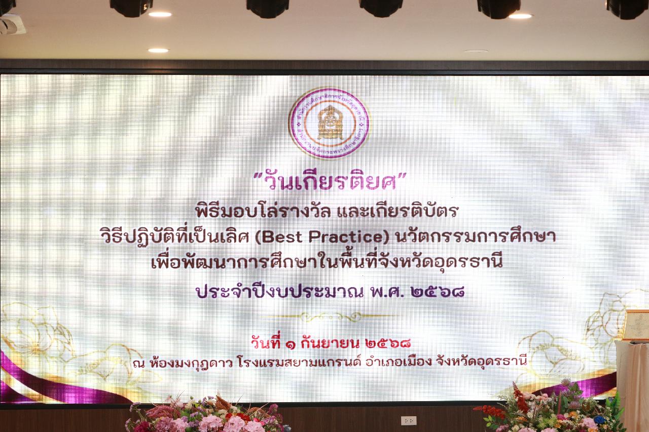 วันจันทร์ ที่ 1 กันยายน 2568 นายไพฑูรย์ ธนพงศ์ภากรณ์ ผู้อำนวยการวิทยาลัยสารพัดช่างอุดรธานี พร้อมด้วย ดร.ยุพาวดี ศิริปีริด์ รองผู้อำนวยการฝ่ายวิชาการ เข้าร่วมการมอบโล่รางวัล และเกียรติบัตร ระดับจังหวัด สำหรับผู้ที่ได้รับรางวัล วิธีปฏิบัติที่เป็นเลิศ (Best Practice) นวัตกรรมการศึกษา เพื่อพัฒนาการศึกษาในพื้นที่จังหวัดอุดรธานี ประจำปีงบประมาณ พ.ศ.2568