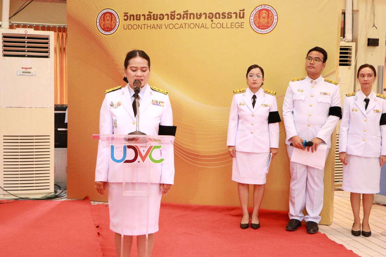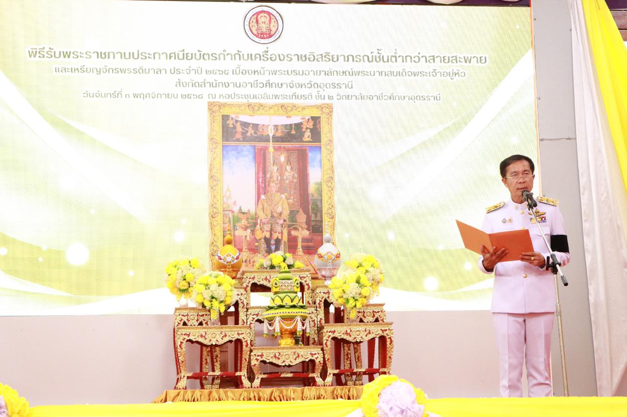 วันจันทร์ที่ 3 พฤศจิกายน 2568 นายไพฑูรย์ ธนพงศ์ภากรณ์ ผู้อำนวยการวิทยาลัยสารพัดช่างอุดรธานี พร้อมด้วยนายณัฐพล สิงห์แม่ง รองผู้อำนวยการฝ่ายแผนงานและความร่วมมือ และคณะครู เข้าร่วมพิธีการจ่ายประกาศนียบัตรกำกับเครื่องราชอิสริยาภรณ์ชั้นต่ำกว่าสายสะพายและเหรียญจักรพรรดิมาลา ประจำปี2565 ณ หอประชุมเฉลิมพระเกียรติ ชั้น2 วิทยาลัยอาชีวศึกษาอุดรธานี