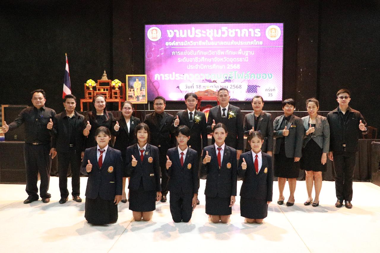 วันอังคารที่ 18 พฤศจิกายน 2568 นายไพฑูรย์ ธนพงศ์ภากรณ์ ผู้อำนวยการวิทยาลัยสารพัดช่างอุดรธานี พร้อมด้วย ว่าที่ร้อยโท อภิเดช สารคำ รองผู้อำนวยการฝ่ายบริหารทรัพยากร นางยุวดี ธรรมสุนา รองผู้อํานวยการฝ่ายพัฒนากิจการนักเรียน นายณัฐพล สิงห์แม่ง รองผู้อำนวยการฝ่ายแผนงานและความร่วมมือ และคณะครู เข้าร่วมงานประชุมวิชาการองค์การนักวิชาชีพในอนาคตแห่งประเทศไทย การแข่งขันทักษะวิชาชีพ ทักษะพื้นฐาน ระดับอาชีวศึกษาจังหวัดอุดรธานี ประจำปีการศึกษา 2568 เข้าร่วมพิธีเปิดการประกวดวงดนตรีโฟล์คซอง ณ ห้องประชุมอินทนิล ชั้น3 อาคารพัสดุ วิทยาลัยเทคนิคอุดรธานี