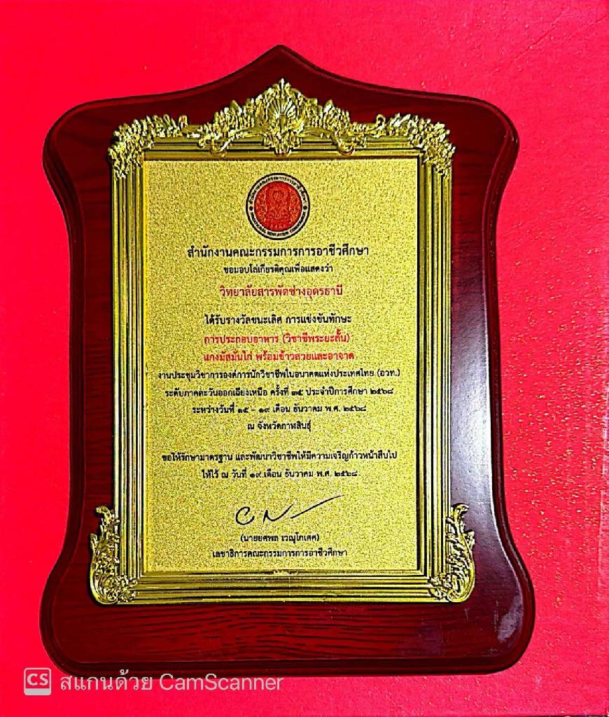 ในวันพุธที่ 17 ธันวาคม 2568 นักศึกษาหลักสูตรวิชาชีพระยะสั้น แผนกวิชาอาหารและขนม วิทยาลัยสารพัดช่างอุดรธานี ได้รับรางวัล "ชนะเลิศ" การแข่งขันทักษะวิชาชีพระยะสั้น ทักษะ "การประกอบอาหารแกงมัสมั่นไก่ พร้อมข้าวสวยและอาจาด" งานประชุมวิชาการองค์การนักวิชาชีพในอนาคตแห่งประเทศไทย (อวท.) ระดับภาคตะวันออกเฉียงเหนือ ครั้งที่ 35 ประจำปีการศึกษา 2568 ณ วิทยาลัยการอาชีพกาฬสินธ์ุ ได้เป็น ตัวแทนภาคอีสานเข้าร่วมแข่งขันทักษะในระดับชาติต่อไป
