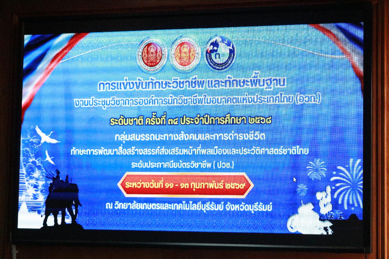 วันพฤหัสบดีที่ 12 กุมภาพันธ์ 2569 นายไพฑูรย์ ธนพงศ์ภากรณ์ ผู้อำนวยการวิทยาลัยสารพัดช่างอุดรธานี พร้อมด้วย ดร.ยุพาวดี ศิริปีริด์ รองผู้อำนวยการฝ่ายวิชาการ และนางสาวขนิษฐา นาคเป้า เข้าร่วมเป็นคณะกรรมการดำเนินงานการจัดการแข่งขัน การแข่งขันทักษะวิชาชีพ และทักษะพื้นฐาน งานประชุมวิชาการองค์การวิชาชีพในอนาคตแห่งประเทศไทย (อวท.) ระดับชาติ ครั้งที่ 34 กลุ่มสมรรถนะทางสังคมและการดำรงชีวิต ทักษะการพัฒนาสื่อสร้างสรรค์ส่งเสริมหน้าที่พลเมืองและประวัติศาสตร์ชาติไทย ระดับประกาศนียบัตรวิชาชีพ (ปวช.) ณ วิทยาลัยเกษตรและเทคโนโลยีบุรีรัมย์ อ.เมือง จ.บุรีรัมย์