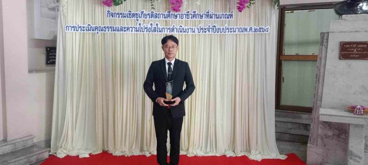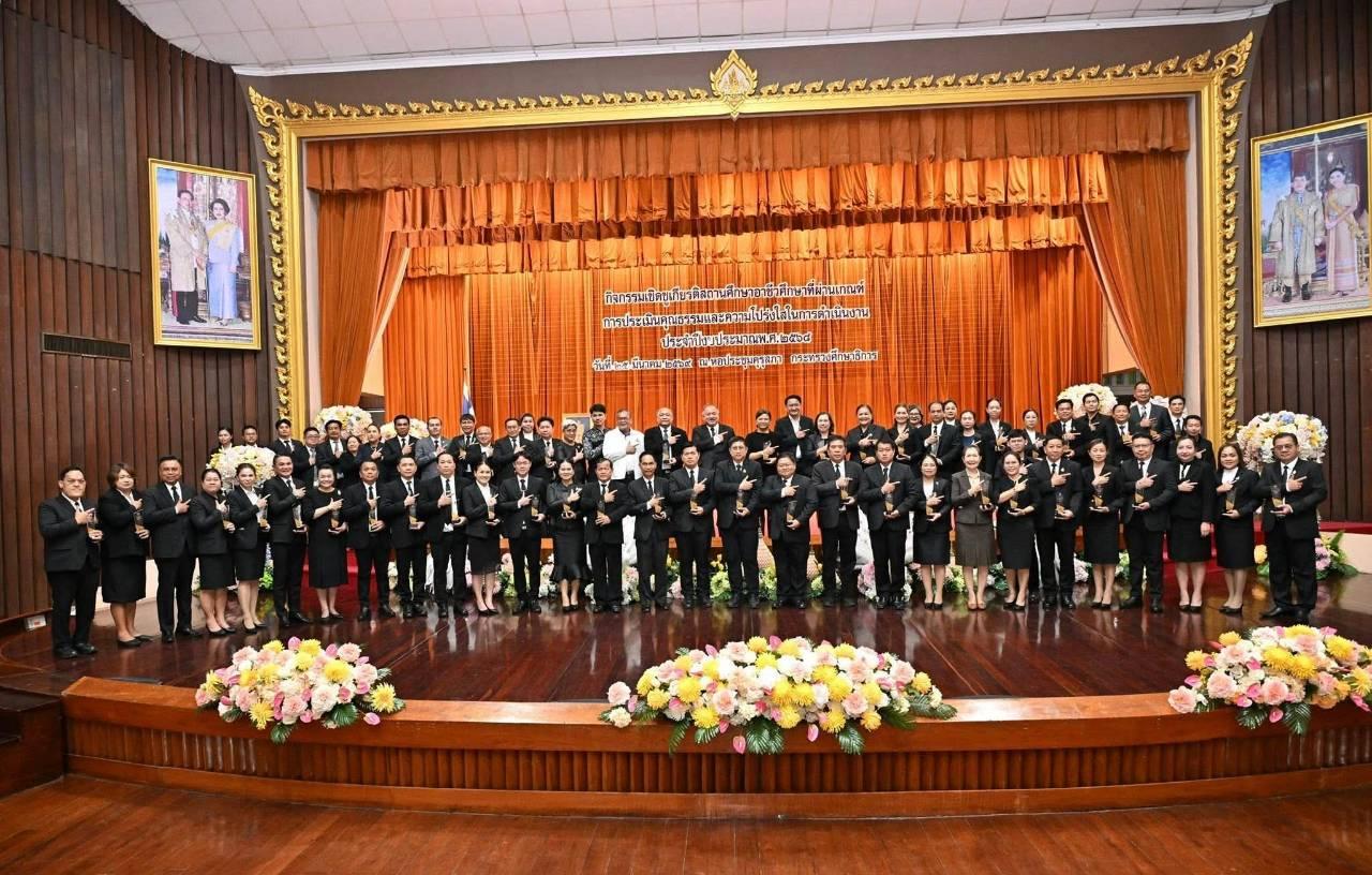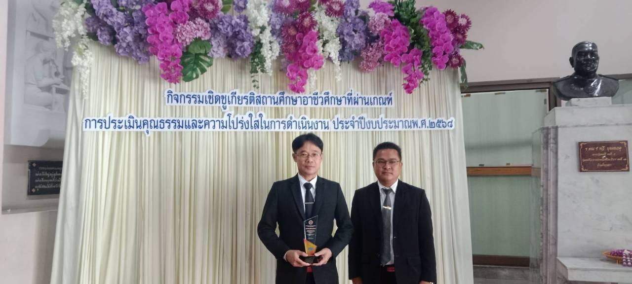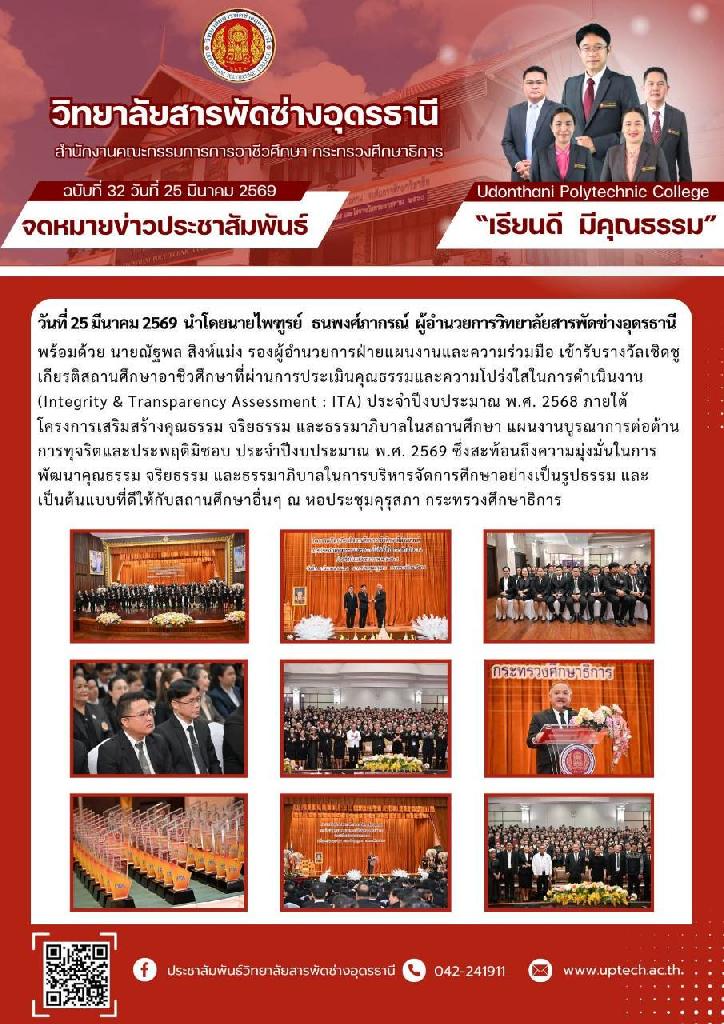 วันพุธที่ 25 มีนาคม 2569 วิทยาลัยสารพัดช่างอุดรธานี นำโดยนายไพฑูรย์ ธนพงศ์ภากรณ์ ผู้อำนวยการ และนายณัฐพล สิงห์แม่ง รองผู้อำนวยการฝ่ายแผนงานและความร่วมมือ ได้เข้ารับโล่ประกาศเกียรติคุณและเกียรติบัตรกิจกรรมเชิดชูเกียรติสถานศึกษาอาชีวศึกษาที่ผ่านการประเมินคุณธรรมและความโปร่งใสในการดำเนินงาน (Integrity & Transparency Assessment : ITA) ประจำ ปีงบประมาณ พ.ศ. 2568 จากนายยศพล เวณุโกเศศ เลขาธิการคณะกรรมการการอาชีวศึกษา (กอศ.) ณ หอประชุมคุรุสภา กระทรวงศึกษาธิการ โดยวิทยาลัยสารพัดช่างอุดรธานี ผ่านระดับดีเยี่ยม