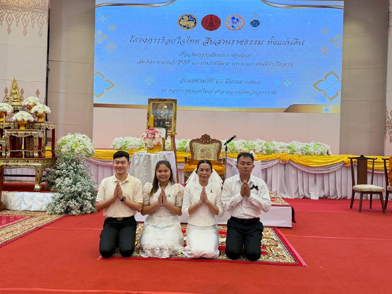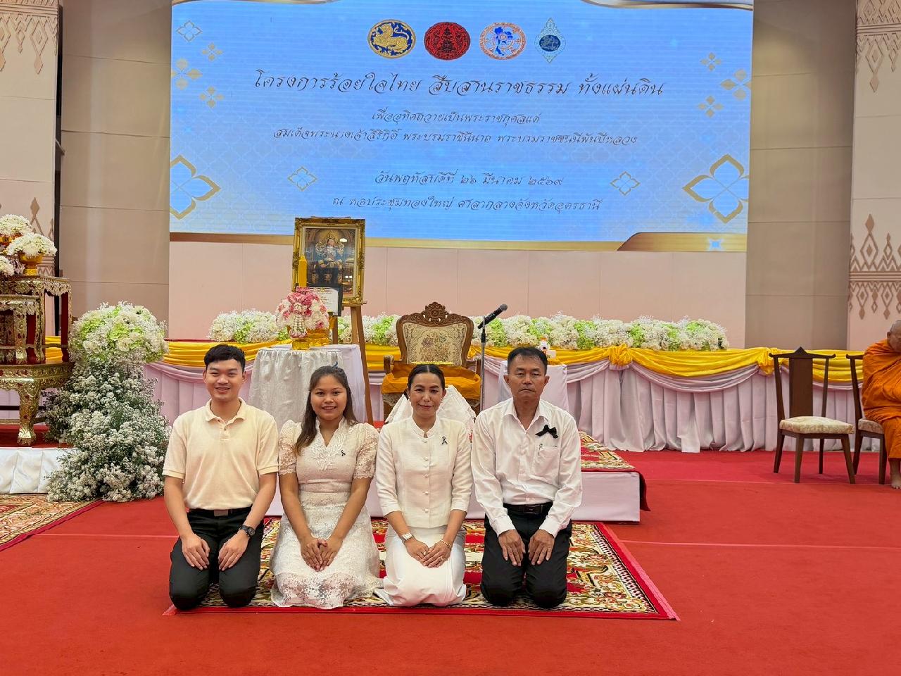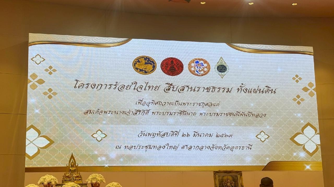 วันพฤหัสบดีที่ 23 มีนาคม 2569 นายไพฑูรย์ ธนพงศ์ภากรณ์ ผู้อำนวยการวิทยาลัยสารพัดช่างอุดรธานี มอบหมายให้ ดร.ยุพาวดี ศิริปีริด์ รองผู้อำนวยการฝ่ายวิชาการ พร้อมด้วย นายเชิดศักดิ์ คำสุนันท์, นางสาวมัทนา เมืองมัจฉา, นายวิทวัช คงเลิศ และ นางสาวศศิกาญจน์ อินทร์เบ้า เข้าร่วมโครงการร้อยใจไทย สืบสานราชธรรม ทั้งแผ่นดิน ณ หอประชุมทองใหญ่ ศาลากลางจังหวัดอุดรธานี